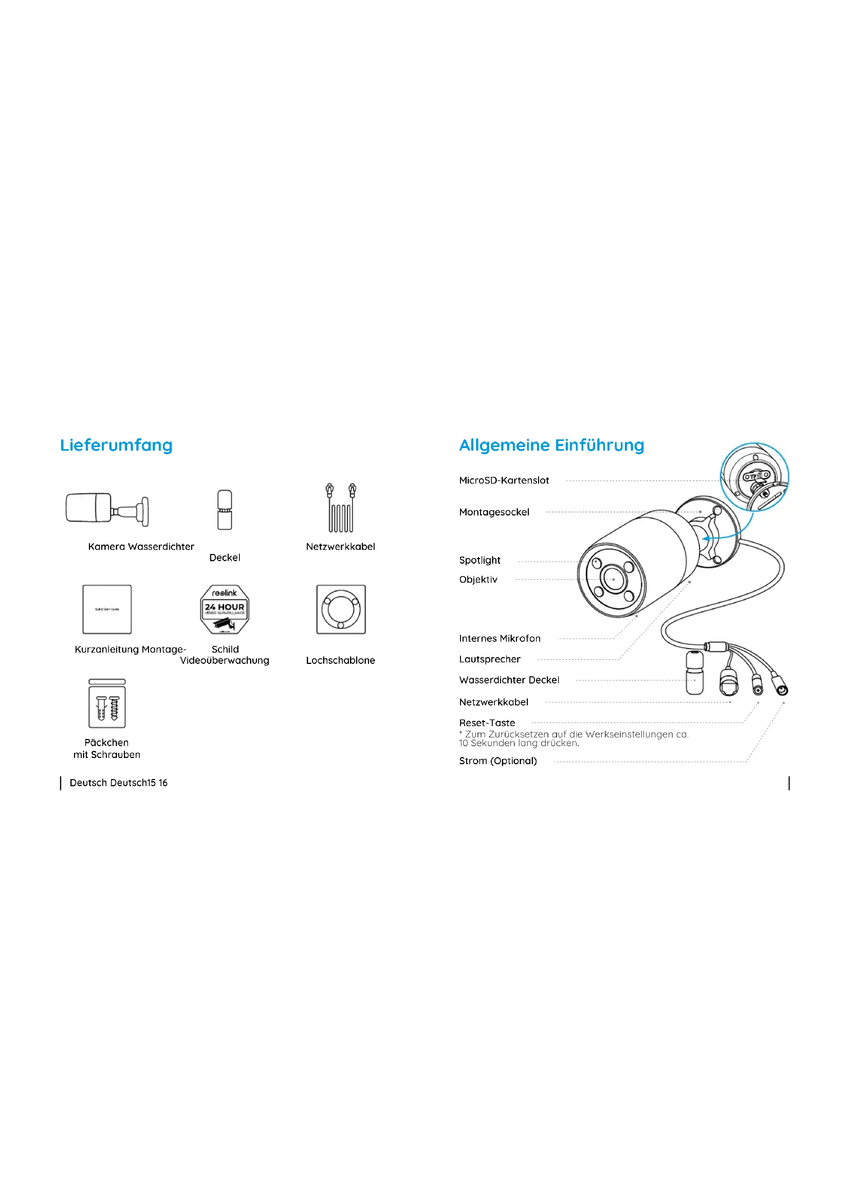 - Stellen Sie die Kamera auf die Werkseinstellungen zurück und überprüfen Sie die Einstellungen für das Scheinwerferlicht erneut. Wenn dies nicht funktioniert, wenden Sie sich bitte an den Reolink-Support: https://support.reolink.com/. Hardware Features Spotlight kann nicht eingeschaltet werden Konformitätserklärung Dieses Gerät entspricht Abschnitt 15 der FCC-Bestimmungen. Der Betrieb unterliegt den folgenden beiden Bedingungen: (1) Dieses Gerät darf keine schädlichen Interferenzen verursachen und (2) dieses Gerät muss alle empfangenen Interferenzen akzeptieren, einschließlich Interferenzen, die zu einem unerwünschten Betrieb führen können. Weitere Informationen finden Sie unter: https://reolink.com/fcc-compliance-notice/. FCC-Konformitätserklärung HINWEIS: Dieses Gerät wurde getestet und entspricht den Grenzwerten für ein digitales Gerät der Klasse B, entsprechend Teil 15 der FCC- Bestimmungen. Diese Grenzwerte sollen einen angemessenen Schutz gegen schädliche Störungen bei einer häuslichen Installation bieten. Stromversorgung: Durch PoE (802.3af) / DC 12V Spotlight: 4pcs/3.5W/6500K Tag/Nacht Modus: Auto-Umschaltung Betriebstemperatur: -10°C to 55°C (14°F to 131°F) Betriebsfeuchtigkeit: 10%-90% Witterungsbeständigkeit: IP66 Weitere Spezifikationen finden Sie unter https://reolink.com/. AllgemeinDeutsch Deutsch25 26 Diese Kennzeichnung weist darauf hin, dass dieses Produkt in der gesamten EU nicht über den Hausmüll entsorgt werden darf. Um mögliche Umwelt-oder menschlicheGesundheitsschäden durch unkontrollierte Entsorgung von Abfällen zu vermeiden, bitte recyceln Sie die Produkte verantwortungsbewusst, um die nachhaltige Wiederverwendung von Rohstoen zu fördern. Für die Rückgabe Ihres Altgerätes nutzen Sie bitte die Rückgabe und Sammelsysteme oder kontaktieren Sie den Händler, bei welchem Sie das Produkt gekauft haben. Ihr Händler kann das Produkt dem umweltverträglichen Recycling zuführen. Korrekte Entsorgung dieses Produkts Reolink erklärt, dass dieses Gerät den grundlegenden Anforderungen und anderen relevanten Bestimmungen der Richtlinie 2014/30/EU entspricht. Vereinfachte EU-Konformitätserklärung 2-Jahre eingeschränkte Garantie ist für dieses Produkt verfügbar. Mehr Infos: https://reolink.com/warranty-and-return/. Garantiebestimmun HINWEIS: Wir hoen, dass Ihnen der Neukauf gefällt. Wenn Sie mit dem Produkt nicht zufrieden sind und es zurückgeben möchten, dann empfehlen wir Ihnen, die Kamera vor der Zurückgabe auf die werkseitigen Standardeinstellungen zurückzusetzen und die eingelegte Durch die Verwendung der in das Reolink-Produkt integrierten Produktsoftware stimmen Sie den Bestimmungen dieses Endbenutzer-Lizenzvertrags („EULA“) zwischen Ihnen und Reolink zu. Weitere Informationen: https://reolink.com/eula/. Endbenutzer-Lizenzvertrag Die Nutzung des Produkts unterliegt Ihrer Zustimmung zu AGB und Datenschutzrichtlinien auf: https://reolink.com/de/. SD-Karte herauszunehmen.schädliche Störungen bei einer häuslichen Installation bieten. AGB & DatenschutzFrançais Français27 28 Contenu de la boîte 28 Introduction de caméra 29 Diagramme de connexion 30 Configurer la caméra 31 Monter la Caméra 32 Dépannage 35 Spécifications 36 Avis de conformité 37 Contenu de la boîte Vis (dans l’emballage) Caméra Couvercle étanche Câble Ethernet Signe de surveillance Guide de démarrage rapide Gabarit de perçage des trous de xation Contenu FRFrançais Français29 30 VGAHDMIUSB AUDIO OUT DC 48V