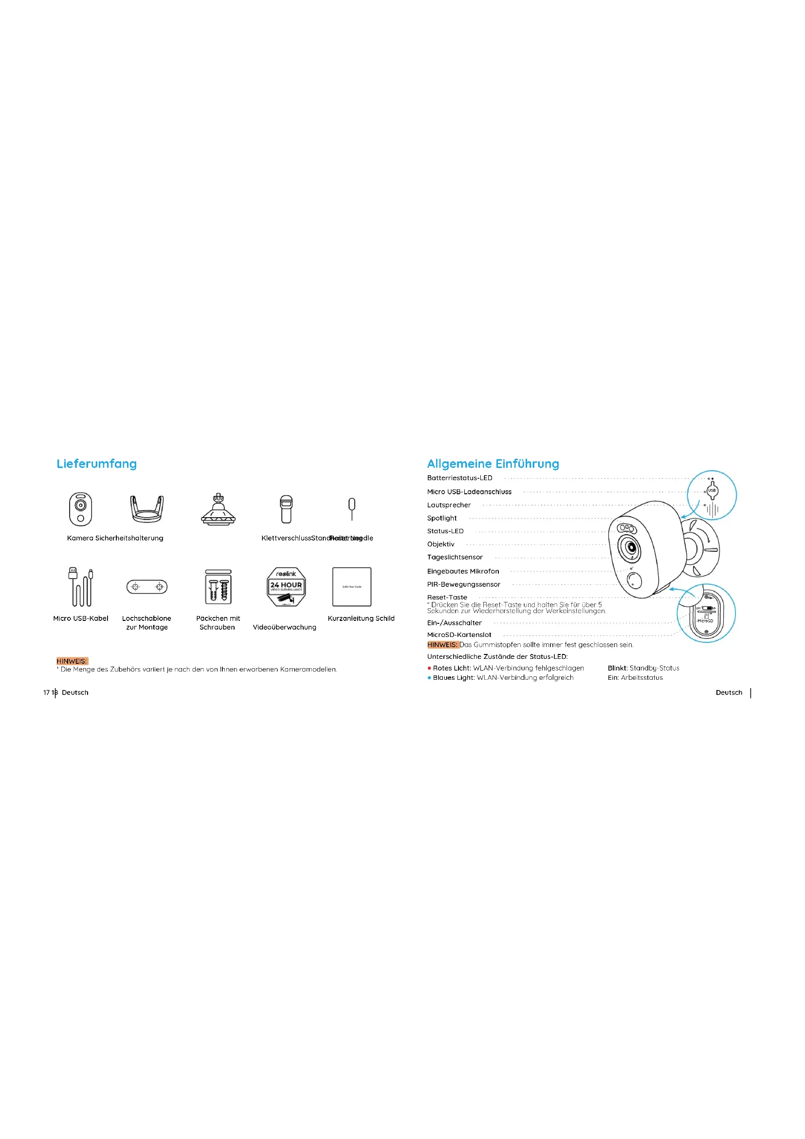 - Die Menge des Zubehörs variiert je nach den von Ihnen erworbenen Kameramodellen. Lautsprecher Spotlight Objektiv Tageslichtsensor Reset-Taste Unterschiedliche Zustände der Status-LED: Status-LED Eingebautes Mikrofon PIR-Bewegungssensor Ein-/Ausschalter MicroSD-Kartenslot