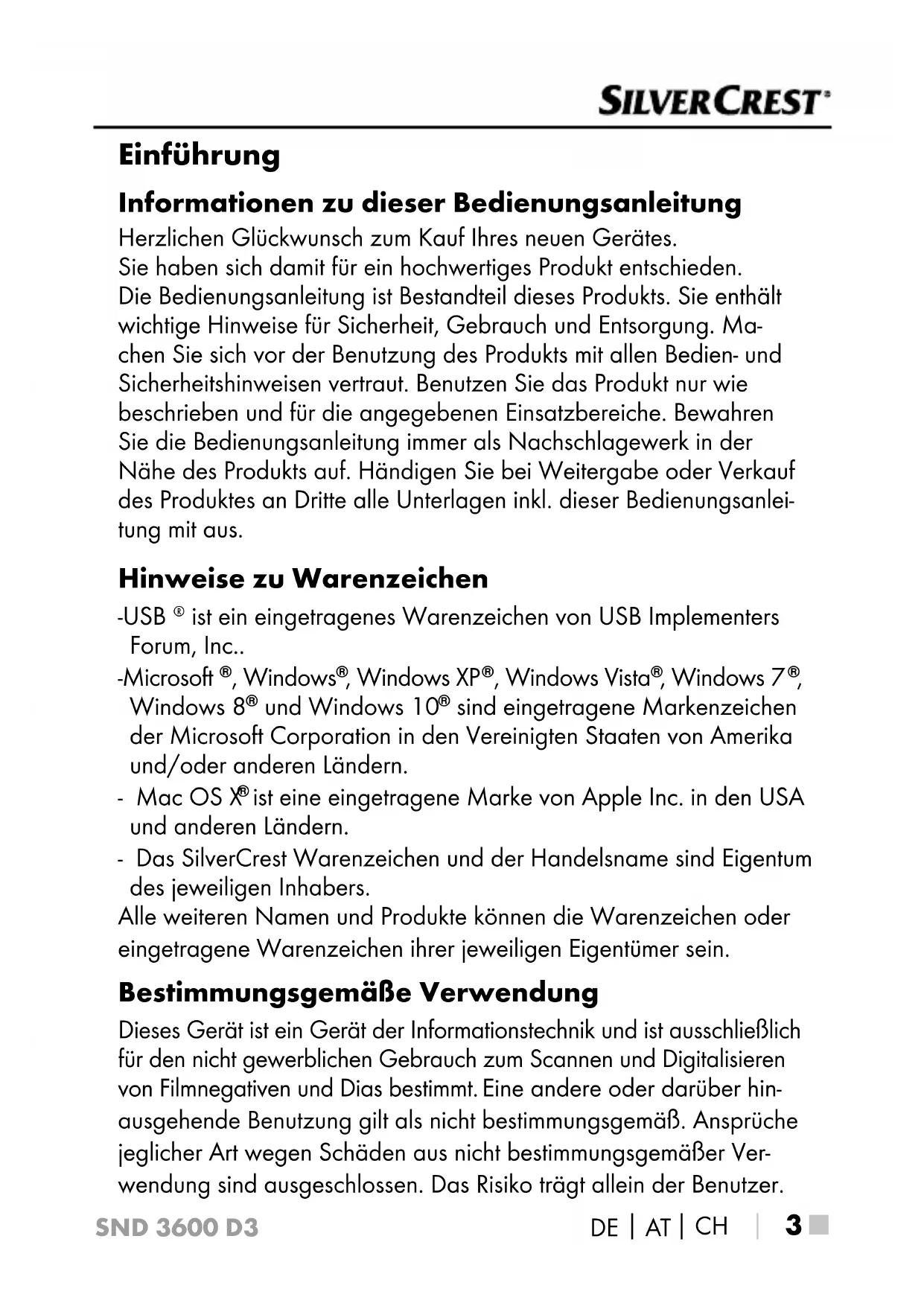 ist eine eingetragene Marke von Apple Inc. in den USA und anderen Ländern. - Das SilverCrest Warenzeichen und der Handelsname sind Eigentum des jeweiligen Inhabers. Alle weiteren Namen und Produkte können die Warenzeichen oder eingetragene Warenzeichen ihrer jeweiligen Eigentümer sein. Bestimmungsgemäße Verwendung Dieses Gerät ist ein Gerät der Informationstechnik und ist ausschließlich für den nicht gewerblichen Gebrauch zum Scannen und Digitalisieren von Filmnegativen und Dias bestimmt. Eine andere oder darüber hin- ausgehende Benutzung gilt als nicht bestimmungsgemäß. Ansprüche jeglicher Art wegen Schäden aus nicht bestimmungsgemäßer Ver- wendung sind ausgeschlossen. Das Risiko trägt allein der Benutzer.SND 3600 D3 ■ 4