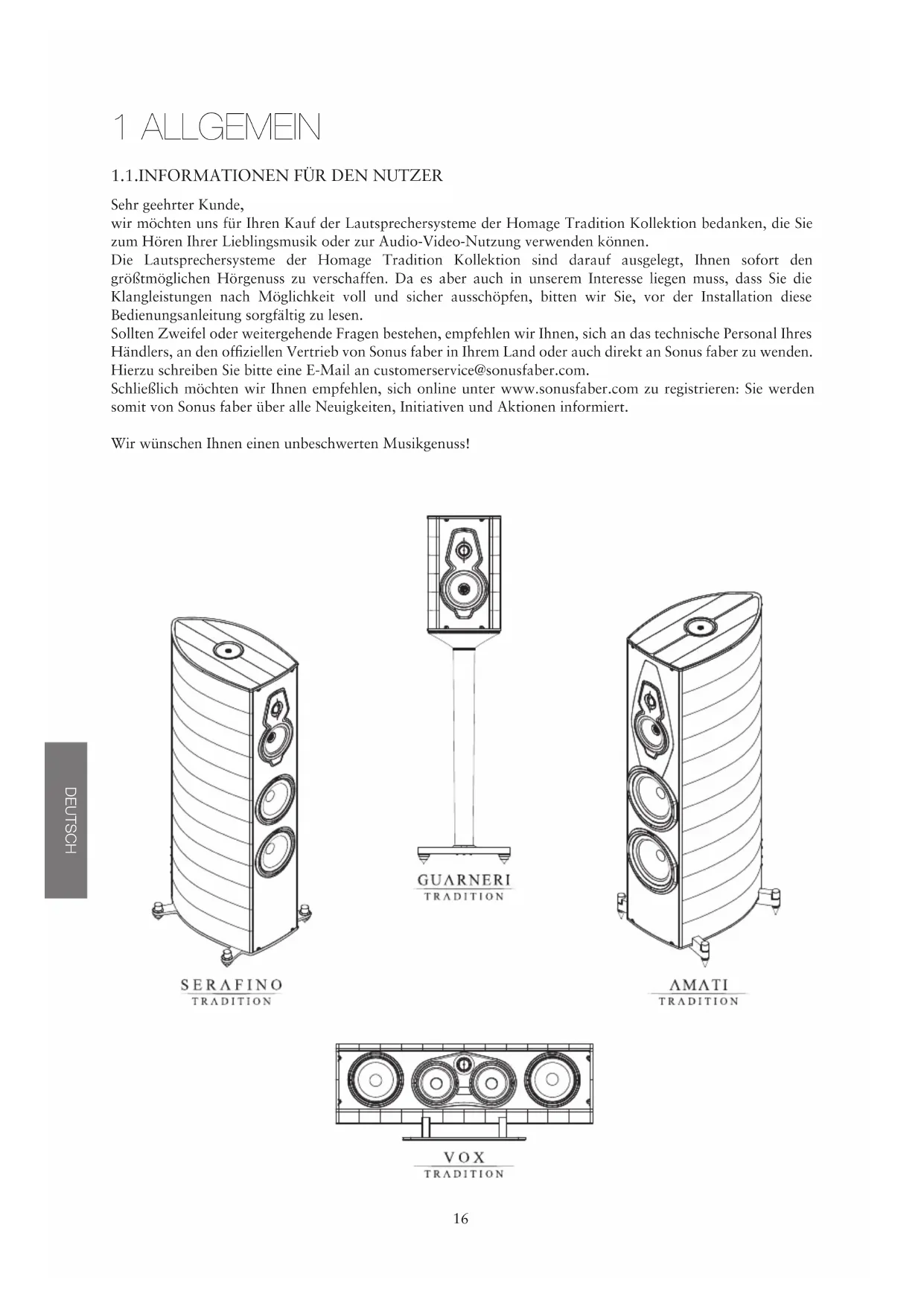 5 DISPOSAL Risk of damage to the device casing! Do not use cleaning products, furniture wax, liquid detergents or alcohol. Do not ! use rough cloths. This device contains materials that can pollute if dispersed in the environment. Take the device to be disposed of to waste sorting centre. ENGLISH16 1 ALLGEMEIN Sehr geehrter Kunde, wir möchten uns für Ihren Kauf der Lautsprechersysteme der Homage Tradition Kollektion bedanken, die Sie zum Hören Ihrer Lieblingsmusik oder zur Audio-Video-Nutzung verwenden können. Die Lautsprechersysteme der Homage Tradition Kollektion sind darauf ausgelegt, Ihnen sofort den größtmöglichen Hörgenuss zu verschaffen. Da es aber auch in unserem Interesse liegen muss, dass Sie die Klangleistungen nach Möglichkeit voll und sicher ausschöpfen, bitten wir Sie, vor der Installation diese Bedienungsanleitung sorgfältig zu lesen. Sollten Zweifel oder weitergehende Fragen bestehen, empfehlen wir Ihnen, sich an das technische Personal Ihres Händlers, an den offiziellen Vertrieb von Sonus faber in Ihrem Land oder auch direkt an Sonus faber zu wenden. Hierzu schreiben Sie bitte eine E-Mail an customerservice@sonusfaber.com. Schließlich möchten wir Ihnen empfehlen, sich online unter www.sonusfaber.com zu registrieren: Sie werden somit von Sonus faber über alle Neuigkeiten, Initiativen und Aktionen informiert. Wir wünschen Ihnen einen unbeschwerten Musikgenuss!
