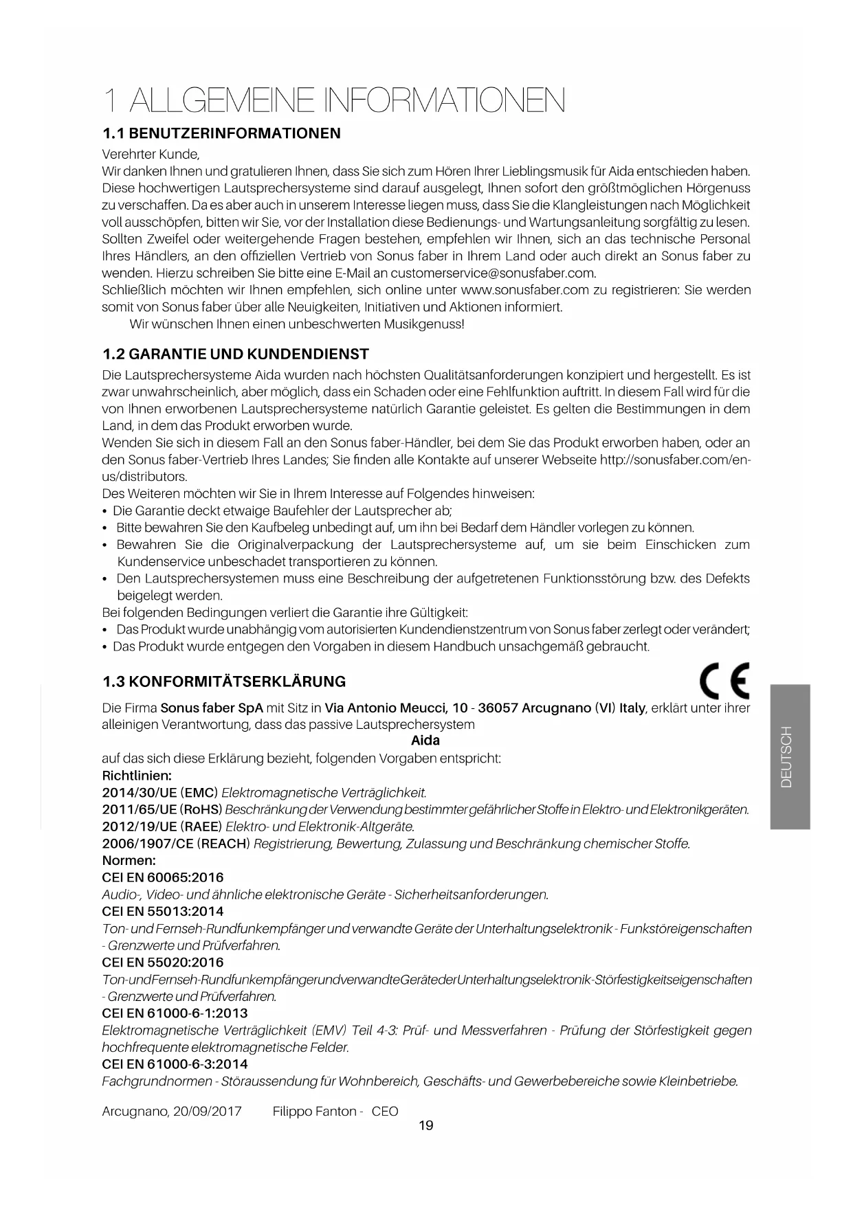 Risk of damage to the device’s cabinet! Do not use cleaning products, furniture wax, liquid detergents, or alcohol. Do not use rough cloths. The Aida unit only requires periodic general cleaning. In order to preserve the loudspeakers’ finish, cover them with the supplied fabric protector, above all if the loudspeakers are not expected to be used for an extended period of time.19 DEUTSCH 1 ALLGEMEINE INFORMATIONEN Verehrter Kunde, Wir danken Ihnen und gratulieren Ihnen, dass Sie sich zum Hören Ihrer Lieblingsmusik für Aida entschieden haben. Diese hochwertigen Lautsprechersysteme sind darauf ausgelegt, Ihnen sofort den größtmöglichen Hörgenuss zu verschaffen. Da es aber auch in unserem Interesse liegen muss, dass Sie die Klangleistungen nach Möglichkeit voll ausschöpfen, bitten wir Sie, vor der Installation diese Bedienungs- und Wartungsanleitung sorgfältig zu lesen. Sollten Zweifel oder weitergehende Fragen bestehen, empfehlen wir Ihnen, sich an das technische Personal Ihres Händlers, an den offiziellen Vertrieb von Sonus faber in Ihrem Land oder auch direkt an Sonus faber zu wenden. Hierzu schreiben Sie bitte eine E-Mail an customerservice@sonusfaber.com. Schließlich möchten wir Ihnen empfehlen, sich online unter www.sonusfaber.com zu registrieren: Sie werden somit von Sonus faber über alle Neuigkeiten, Initiativen und Aktionen informiert. Wir wünschen Ihnen einen unbeschwerten Musikgenuss! Die Lautsprechersysteme Aida wurden nach höchsten Qualitätsanforderungen konzipiert und hergestellt. Es ist zwar unwahrscheinlich, aber möglich, dass ein Schaden oder eine Fehlfunktion auftritt. In diesem Fall wird für die von Ihnen erworbenen Lautsprechersysteme natürlich Garantie geleistet. Es gelten die Bestimmungen in dem Land, in dem das Produkt erworben wurde. Wenden Sie sich in diesem Fall an den Sonus faber-Händler, bei dem Sie das Produkt erworben haben, oder an den Sonus faber-Vertrieb Ihres Landes; Sie finden alle Kontakte auf unserer Webseite http://sonusfaber.com/en- us/distributors. Des Weiteren möchten wir Sie in Ihrem Interesse auf Folgendes hinweisen: