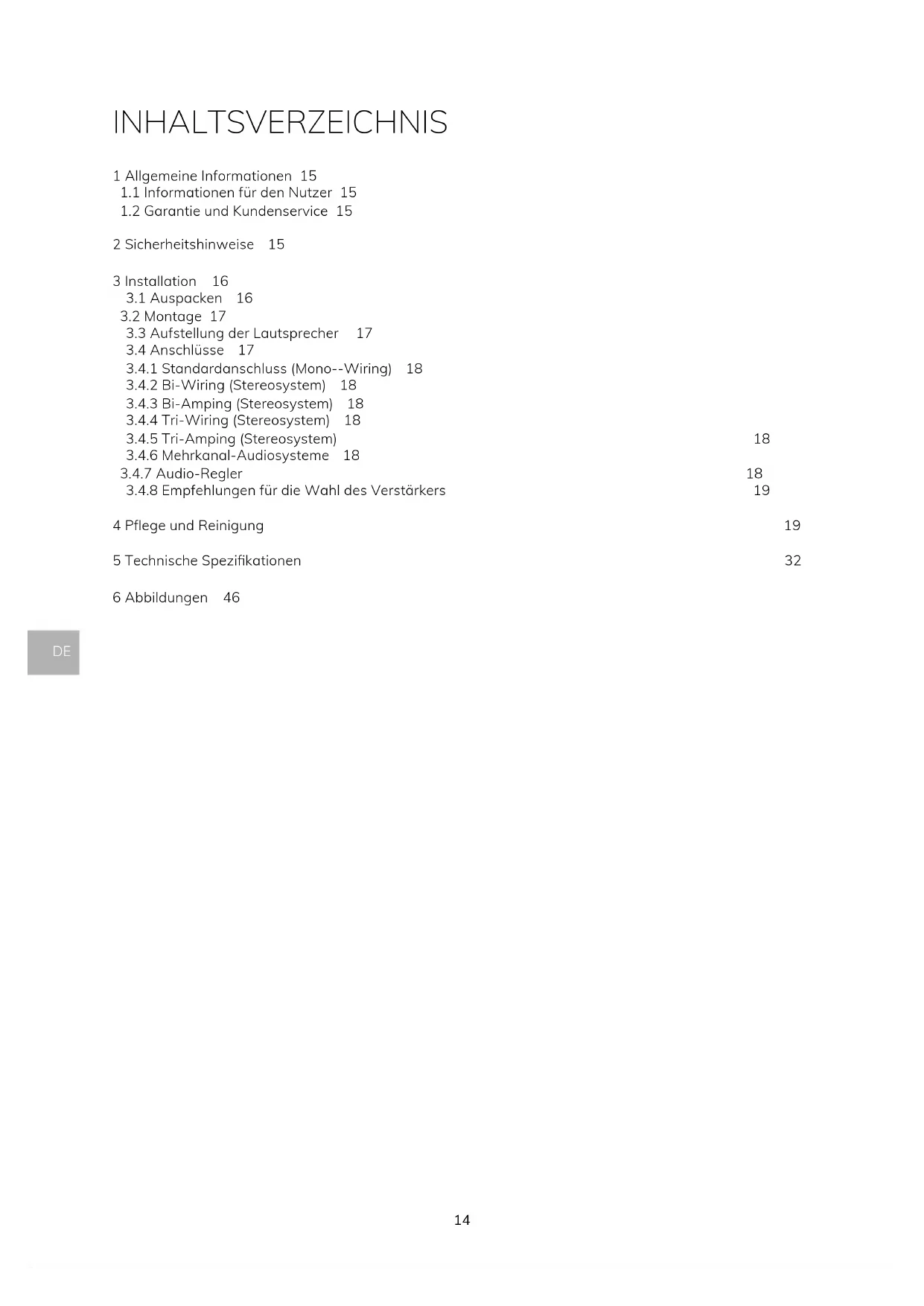 4PegeundReinigung 19 5TechnischeSpezikationen 32 6 Abbildungen 46DE