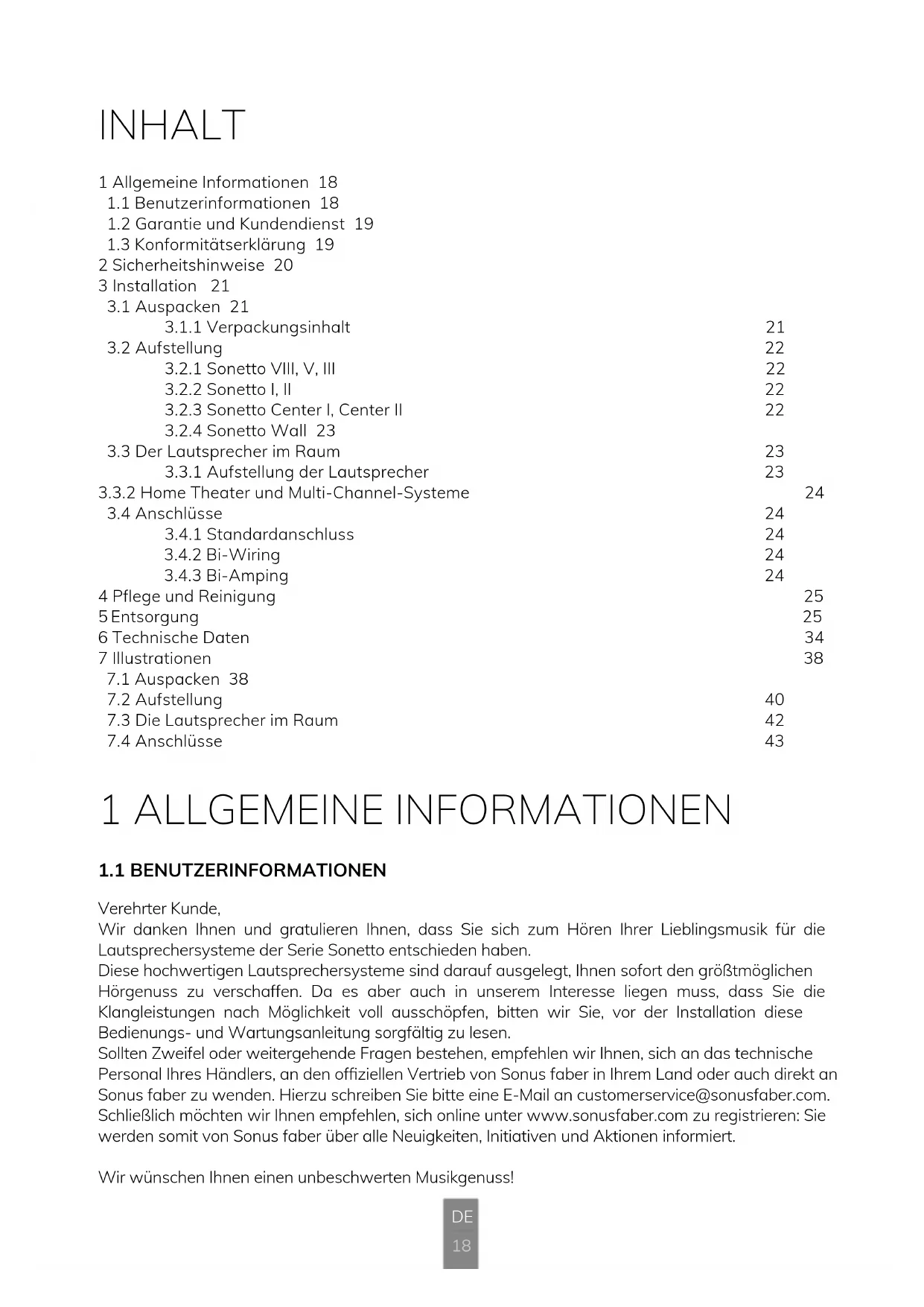 1 ALLGEMEINE INFORMATIONEN INHALT Verehrter Kunde, Wir danken Ihnen und gratulieren Ihnen, dass Sie sich zum Hören Ihrer Lieblingsmusik für die Lautsprechersysteme der Serie Sonetto entschieden haben. Diese hochwertigen Lautsprechersysteme sind darauf ausgelegt, Ihnen sofort den größtmöglichen Hörgenuss zu verschaffen. Da es aber auch in unserem Interesse liegen muss, dass Sie die Klangleistungen nach Möglichkeit voll ausschöpfen, bitten wir Sie, vor der Installation diese Bedienungs- und Wartungsanleitung sorgfältig zu lesen. Sollten Zweifel oder weitergehende Fragen bestehen, empfehlen wir Ihnen, sich an das technische Personal Ihres Händlers, an den ofziellen Vertrieb von Sonus faber in Ihrem Land oder auch direkt an Sonus faber zu wenden. Hierzu schreiben Sie bitte eine E-Mail an customerservice@sonusfaber.com. Schließlich möchten wir Ihnen empfehlen, sich online unter www.sonusfaber.com zu registrieren: Sie werden somit von Sonus faber über alle Neuigkeiten, Initiativen und Aktionen informiert. Wir wünschen Ihnen einen unbeschwerten Musikgenuss! 1 Allgemeine Informationen 18