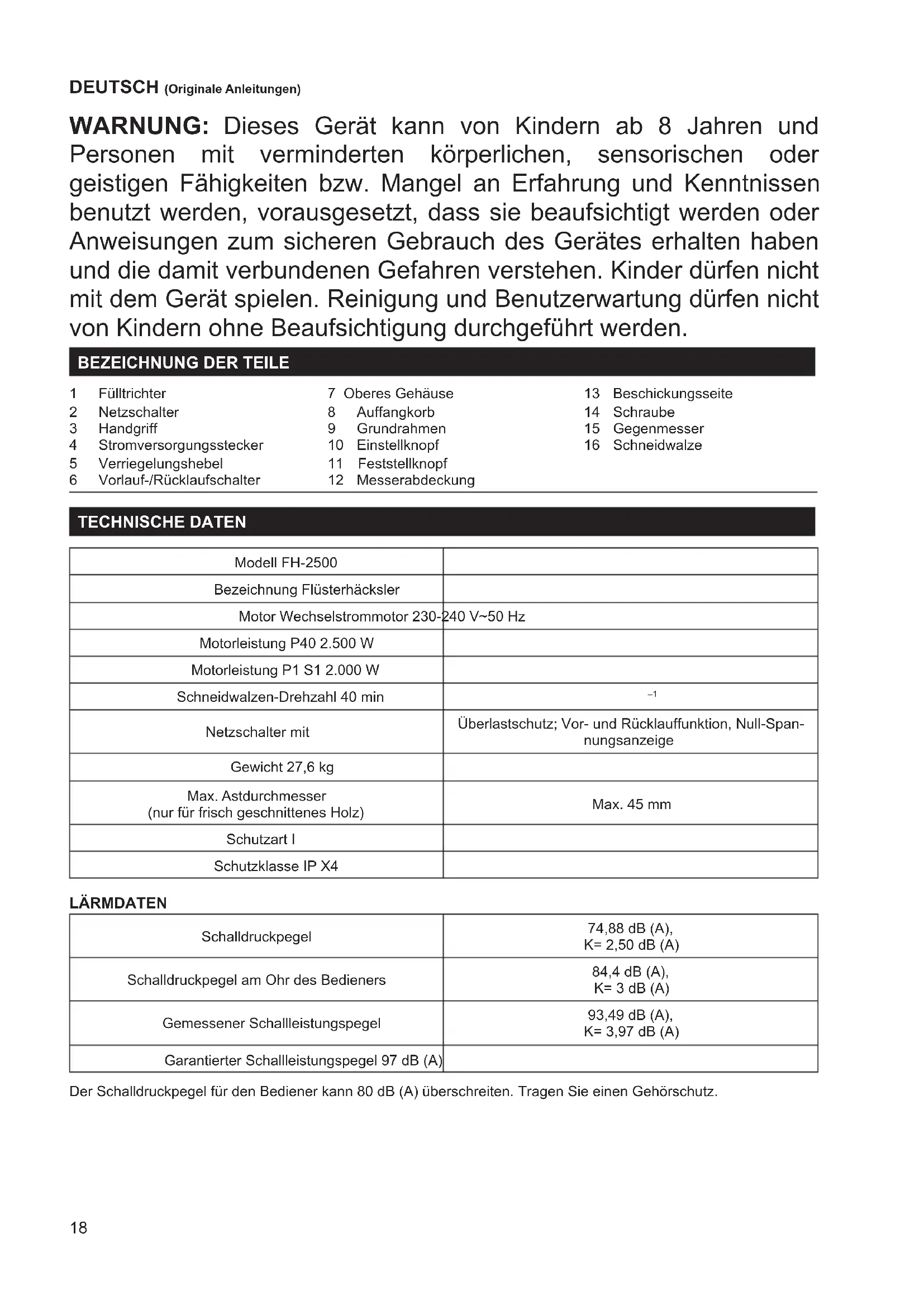1 Fülltrichter 2 Netzschalter 3 Handgriff 4 Stromversorgungsstecker 5 Verriegelungshebel 6 Vorlauf-/Rücklaufschalter 7 Oberes Gehäuse 8 Auffangkorb 9 Grundrahmen 10 Einstellknopf 11 Feststellknopf 12 Messerabdeckung 13 Beschickungsseite 14 Schraube 15 Gegenmesser 16 Schneidwalze TECHNISCHE DATEN Modell FH-2500 Bezeichnung Flüsterhäcksler Motor Wechselstrommotor 230-240 V~50 Hz Motorleistung P40 2.500 W Motorleistung P1 S1 2.000 W Schneidwalzen-Drehzahl 40 min