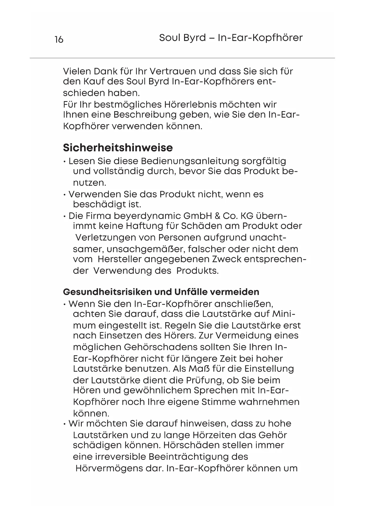 - Benutzen Sie das Produkt nicht anders als in dieser Produktanleitung beschrieben. beyerdynamic übernimmt keine Haung bei nicht beimmungsmäßen Gebrauch des Produktes sowie der Zubehöeile.deutsch Soul Byrd – In-Ear-Kopfhörer