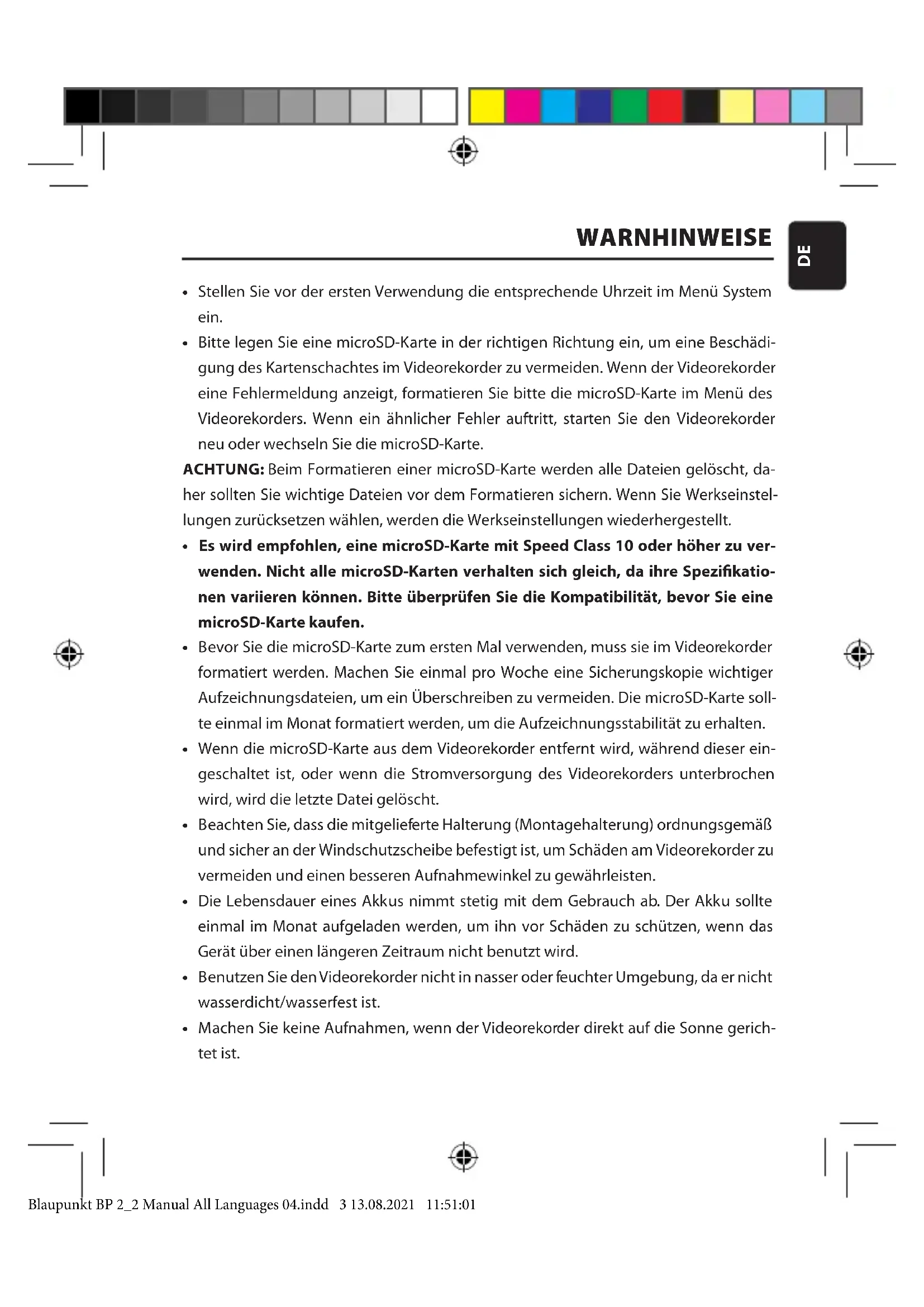 FUNKTION Blaupunkt BP 2_2 Manual All Languages 04.indd 8 13.08.2021 11:51:02FUNKTION B. Akku laden Mit dem 12-Volt-Autoladegerät (im Lieferumfang) Achtung: Die Ladeleuchte leuchtet konstant ROT, wenn der Videorekorder an ein 12-V-Ladegerät angeschlossen ist. Wenn der Akku vollständig geladen ist, erlischt die Ladeleuchte. C. microSD-Karte einlegen Es wird nicht empfohlen, die microSD- Karte mit Gewalt in den entsprechenden Steckplatz einzulegen. Nachdem Sie sichergestellt haben, dass die microSD- Karte mit der richtigen Seite eingelegt ist, sollten Sie die Karte einschieben, bis sie im Steckplatz einrastet. microSD-Karte entfernen: Drücken Sie die microSD-Karte leicht nach oben, bis sie ausrastet, und ziehen Sie sie dann heraus (es wird empfohlen, die microSD-Karte zu entfernen, wenn der Videorekorder aus- geschaltet ist).