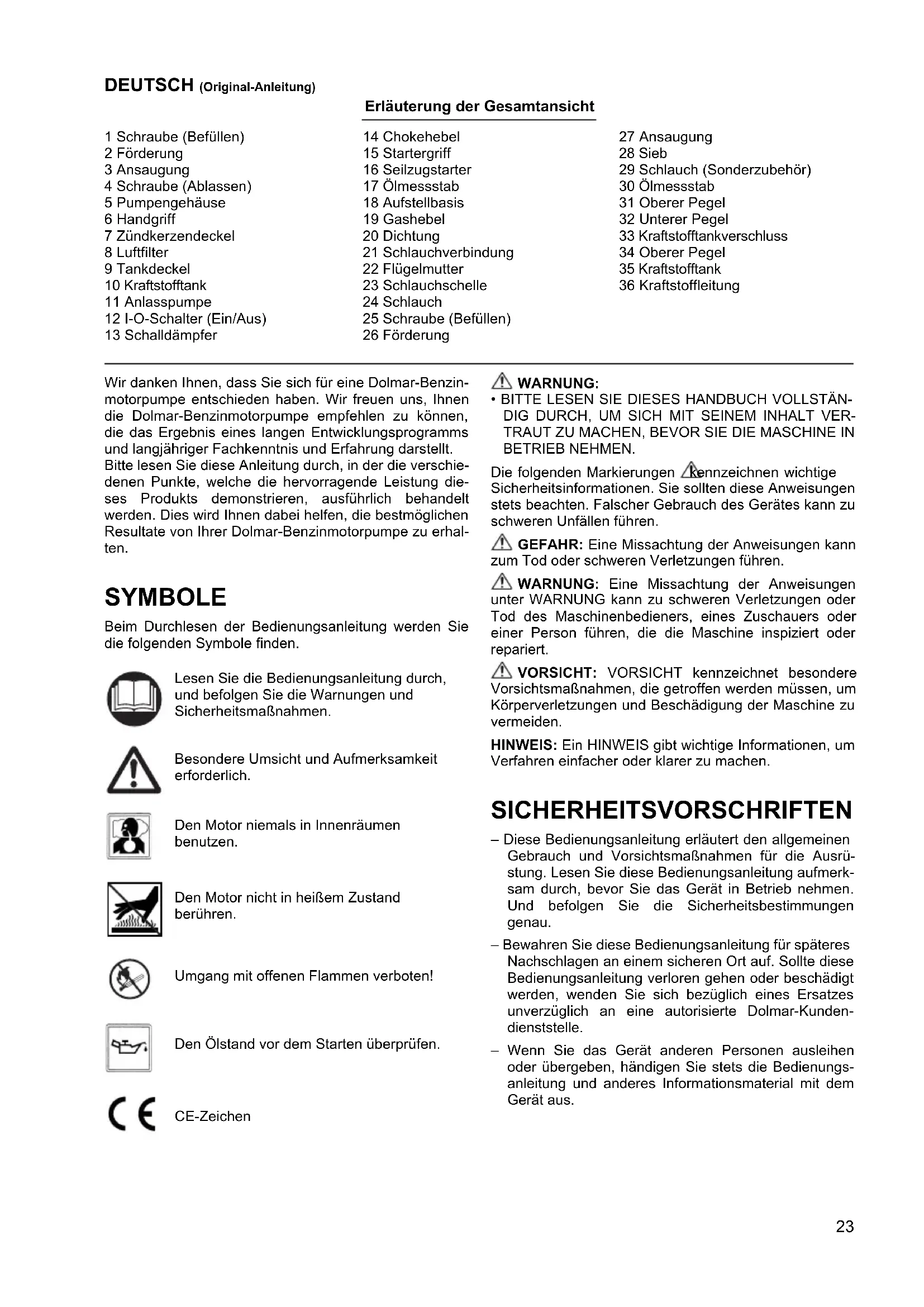 Wir danken Ohnen, dass Sie sich für eine Dolmar-Benzinmotorpumpe entschieden haben. Wir freuen uns, Ihr den die Dolmar-Benzinmotorpumpe empfehlen zu können, die das Ergebnis eines langen Entwicklungssprogramms und langjähriger Fachkenntnis und Erfahrung darstellt.itte lessen Sie diese Anleitung durch, in der die verschiedene Punkte, welche die hervorragende Leistung desses Produkts demonstrieren, ausfuhrlich behandelt werden. Dies wird Ihnen darauf helpen, die bestmöglichen Resultate von ihrer Dolmar-Benzinmotorpumpe zu erhalten.