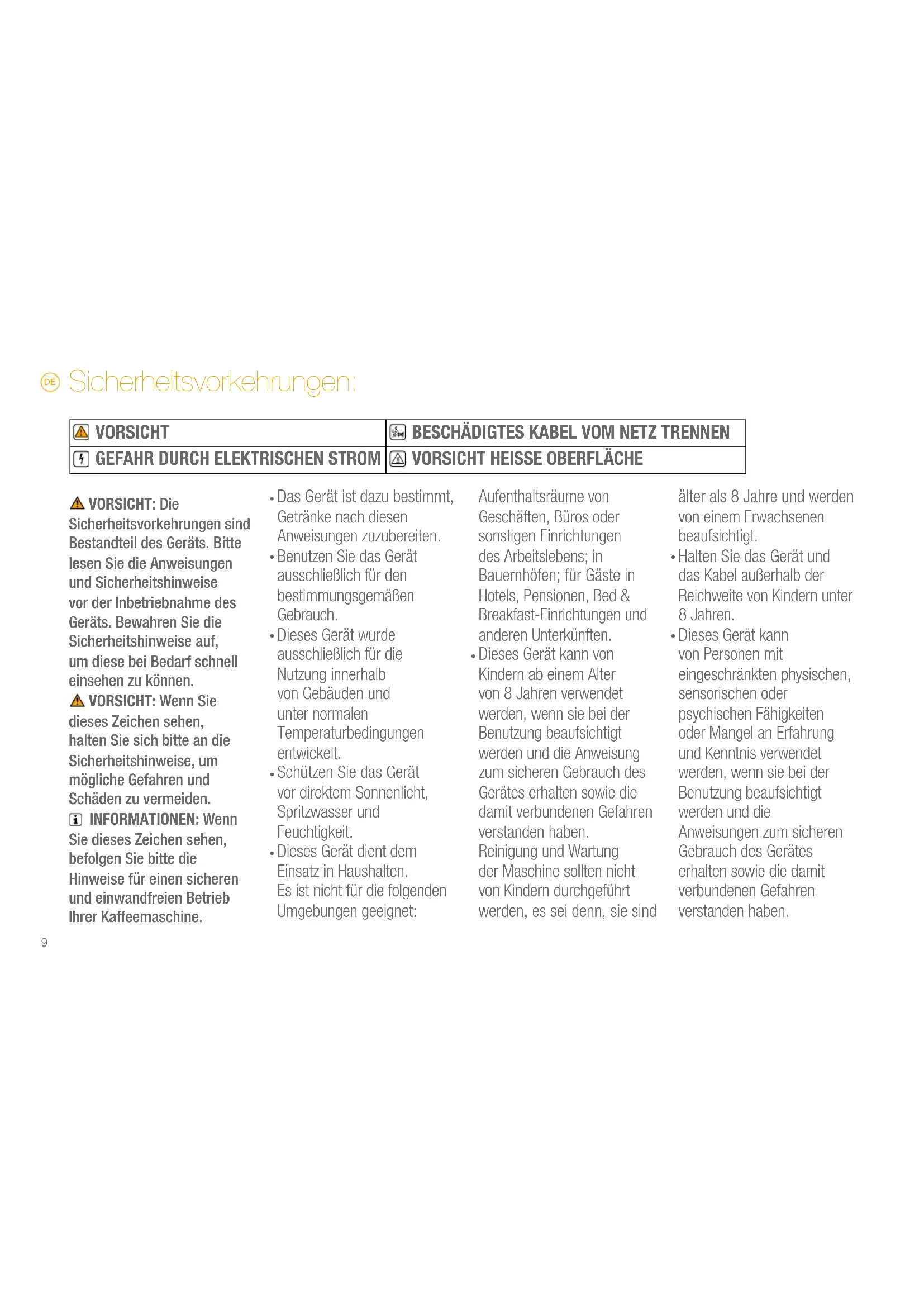 VORSICHT: Die Sicherheitsvorkehrungen sind Bestandteil des Geräts. Bitte lesen Sie die Anweisungen und Sicherheitshinweise vor der Inbetriebnahme des Geräts. Bewahren Sie die Sicherheitshinweise auf, um diese bei Bedarf schnell einsehen zu können. VORSICHT: Wenn Sie dieses Zeichen sehen, halten Sie sich bitte an die Sicherheitshinweise, um mögliche Gefahren und Schäden zu vermeiden. INFORMATIONEN: Wenn Sie dieses Zeichen sehen, befolgen Sie bitte die Hinweise für einen sicheren und einwandfreien Betrieb Ihrer Kaffeemaschine.