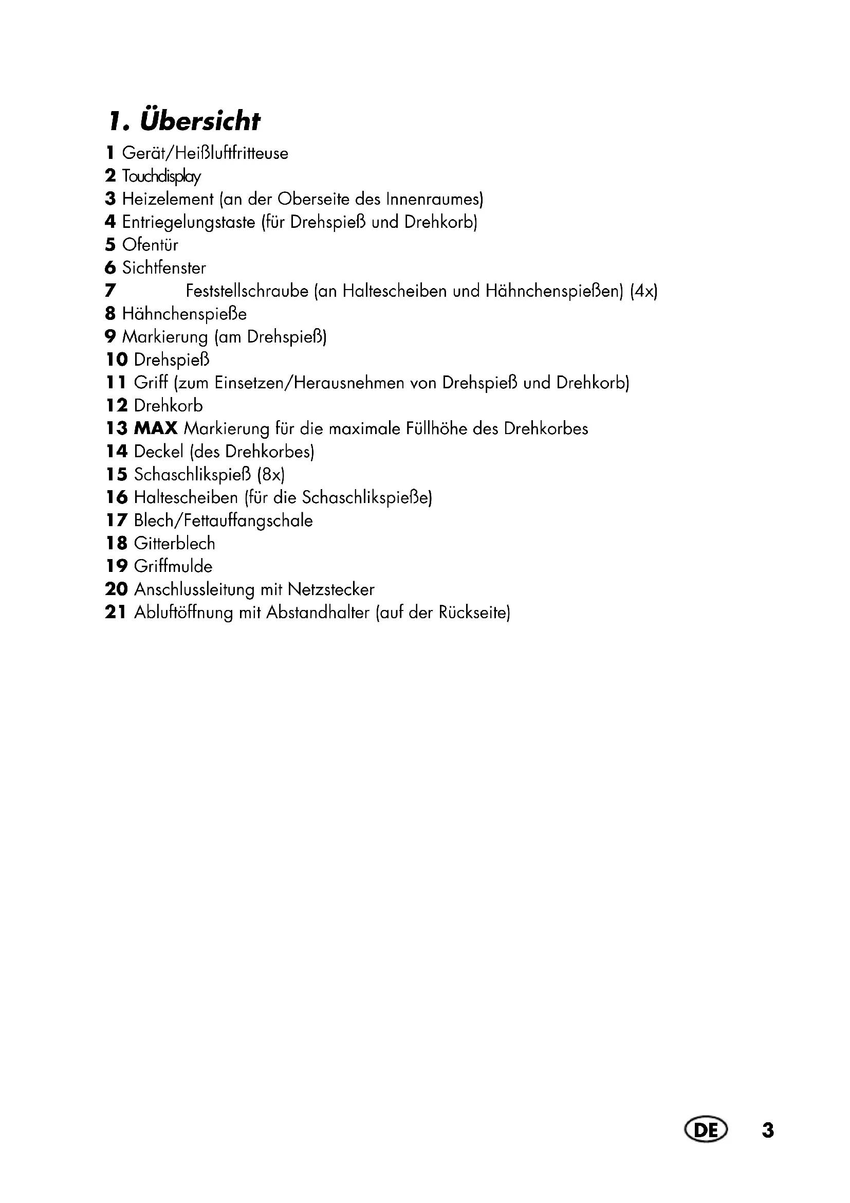 1 Gerät/Heißluftfritteuse 2 Touchdisplay 3 Heizelement (an der Oberseite des Innenraumes) 4 Entriegelungstaste (für Drehspieß und Drehkorb) 5 Ofentür 6 Sichtfenster 7 Feststellschraube (an Haltescheiben und Hähnchenspießen) (4x) 8 Hähnchenspieße 9 Markierung (am Drehspieß) 10 Drehspieß 11 Griff (zum Einsetzen/Herausnehmen von Drehspieß und Drehkorb) 12 Drehkorb 13 MAX Markierung für die maximale Füllhöhe des Drehkorbes 14 Deckel (des Drehkorbes) 15 Schaschlikspieß (8x) 16 Haltescheiben (für die Schaschlikspieße) 17 Blech/Fettauffangschale 18 Gitterblech 19 Griffmulde 20 Anschlussleitung mit Netzstecker 21 Abluftöffnung mit Abstandhalter (auf der Rückseite) __351606_2007_B8.book Seite 3 Dienstag, 8. Dezember 2020 2:41 144