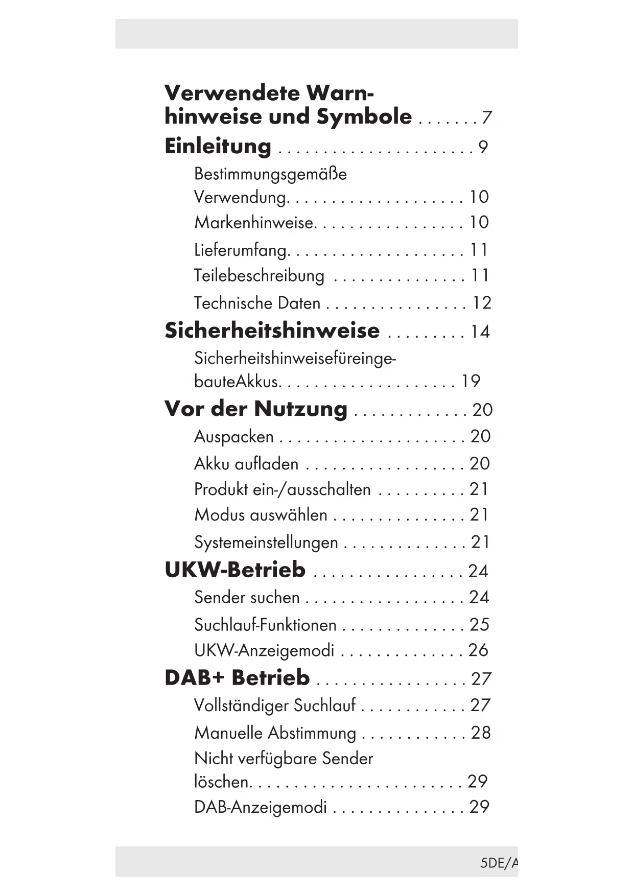 SIG Inc., jegliche Verwendung der Warenzeichen durch die OWIM GmbH erfolgt im Rahmen einer Lizenz.11DE/AT/CH Das Warenzeichen und der Markenname SilverCrest sind Eigentum der jeweiligen Besitzer. Alle weiteren Namen und Produkte können die Warenzeichen oder eingetragene Warenzeichen ihrer jeweiligen Eigentümer sein. Lieferumfang Überprüfen Sie nach dem Auspacken des Produktes, ob die Lieferung vollständig ist und alle Teile in ordnungsgemäßem Zustand sind. Entfernen Sie vor der Verwendung sämtliche Verpackungsmaterialien. 1x DAB+ Radio mit Bluetooth 1x Ladekabel (Micro-USB / USB Typ A) 1x 3,5mm Klinkenkabel 1x Bedienungsanleitung 1x Kurzanleitung Teilebeschreibung [1] Display [2] Taste MENU [3] Taste SCAN [4] Taste PRESET [5] Taste MODE [6] Taste OK [7] Taste < [8] Taste > [9] Taste – [] Taste +12 DE/AT/CH [] Ausziehbare Antenne [] Lautsprecher [] 3,5 mm Klinkenbuchse [] Akkuladeanzeige [] Micro-USB-Buchse [] Ladekabel (Micro-USB / USB Typ A) [] 3,5 mm Klinkenkabel [] Bedienungsanleitung [] Kurzanleitung Technische Daten Spannungs- versorgung: – Micro-USB-Buchse: – Akku: 5 V , 1,0 A 1 x 3,7 V Lithium-Ionen-Akku mit 2000 mAh (nicht austauschbar) Akkuleistung: 7,4 Wh Musikleistung: max. 6 W RMS Funkstandard: Bluetooth 5.0 Bluetooth- Frequenzband: 2400 bis 2483,5 MHz Max. Sendeleistung: 1 mW13DE/AT/CH DAB- Empfangsbereich: 174 bis 240 MHz UKW- Empfangsbereich: 87,5 bis 108 MHz Senderplätze (Speicher): 30 (DAB) 30 (FM/UKW) AUX-Stecker: Stereo-Klinkenstecker (3,5 mm) Abmessungen: ca. 17,5 x 7 x 7,5 cm (B x T x H) Gewicht: ca. 420 g Betriebsbedingungen: +5 bis +35 °C, 40 bis 85 % rel. Luftfeuchtigkeit Lagertemperatur: 0 bis +40 °C Bluetooth-Protokolle: AVRCP (zur Fernsteuerung von Audiofunktionen über Mobiltelefone), A2DP (drahtlose Audioübertragung) Betriebszeit: ca. 9 Stunden Wiedergabe von Musik (bei mittlerer Lautstärke) Ladezeit: ca. 3,5 Stunden14 DE/AT/CH Sicherheitshinweise In diesem Kapitel erhalten Sie wichtige Sicherheitshinweise im Umgang mit dem Produkt. Ein unsachgemäßer Gebrauch kann zu Personen- und Sachschäden führen. Machen Sie sich vor der ersten Benutzung des Produkts mit allen Bedien- und Sicherheitshinweisen vertraut! Händigen Sie alle Unterlagen bei Weitergabe des Produkts an Dritte ebenfalls mit aus!