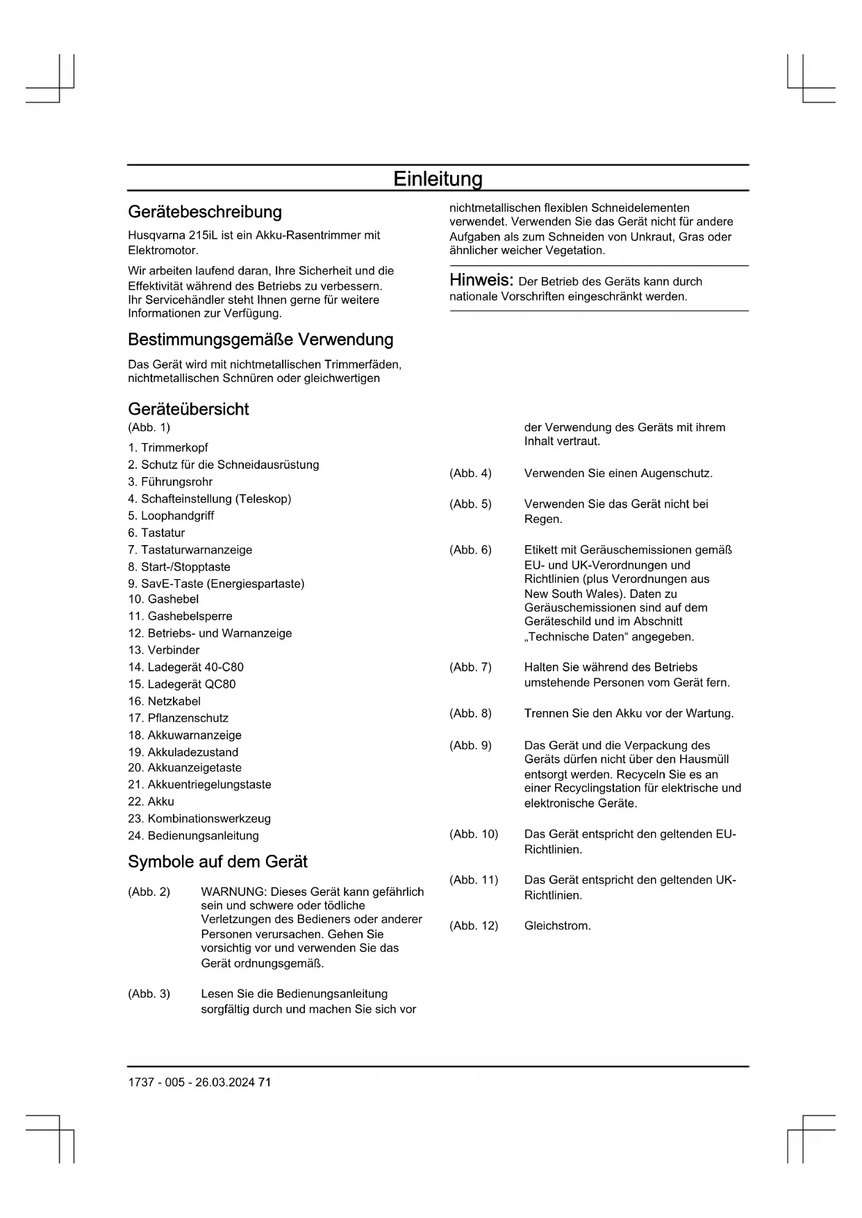 - Anhang 70 1737 - 005 - 26.03.2024Einleitung Gerätebeschreibung Husqvarna 215iL ist ein Akku-Rasentrimmer mit Elektromotor. Wir arbeiten laufend daran, Ihre Sicherheit und die Effektivität während des Betriebs zu verbessern. Ihr Servicehändler steht Ihnen gerne für weitere Informationen zur Verfügung. Bestimmungsgemäße Verwendung Das Gerät wird mit nichtmetallischen Trimmerfäden, nichtmetallischen Schnüren oder gleichwertigen nichtmetallischen flexiblen Schneidelementen verwendet. Verwenden Sie das Gerät nicht für andere Aufgaben als zum Schneiden von Unkraut, Gras oder ähnlicher weicher Vegetation. Hinweis: Der Betrieb des Geräts kann durch nationale Vorschriften eingeschränkt werden. Geräteübersicht (Abb. 1) p. 454