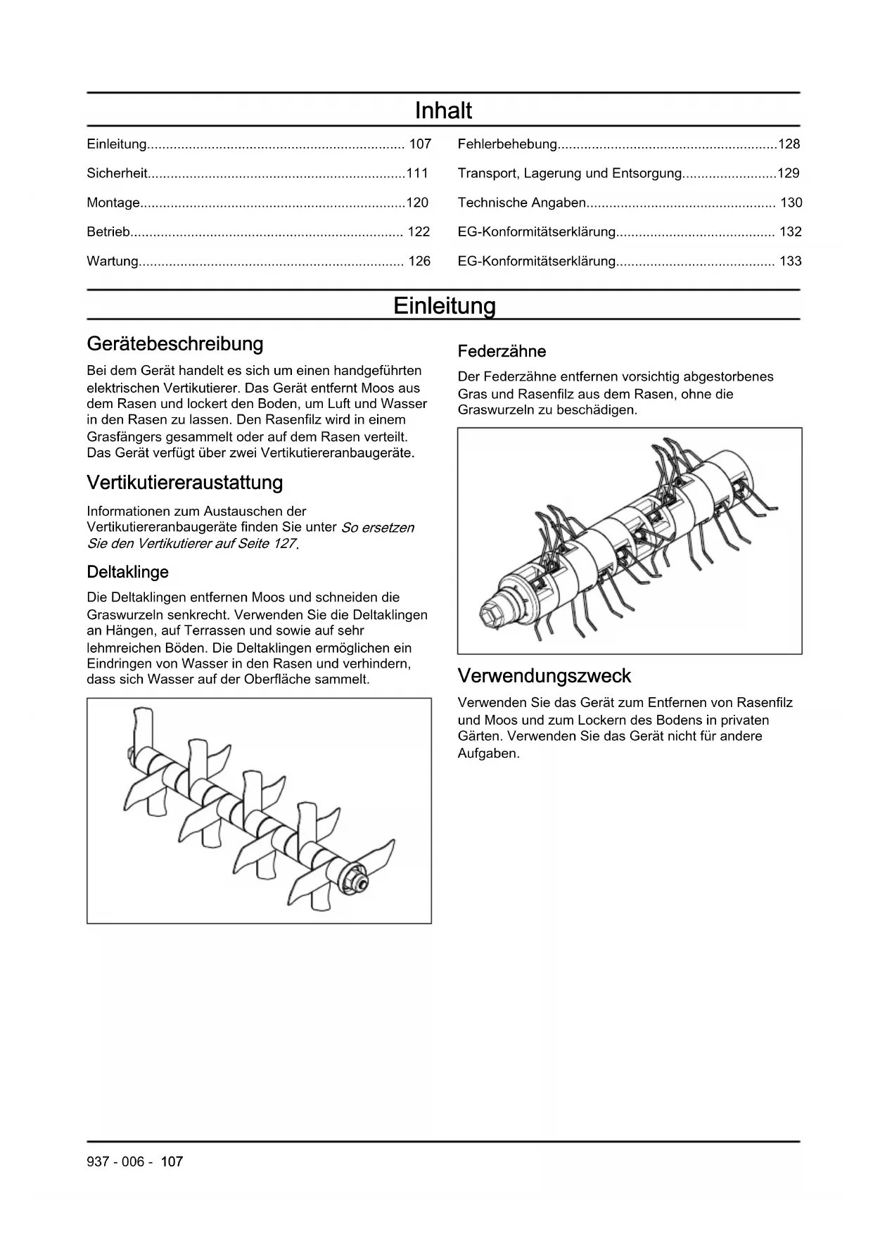 - EG-Konformitätserklärung Einleitung Gerätebeschreibung Bei dem Gerät handelt es sich um einen handgeführten elektrischen Vertikutierer. Das Gerät entfernt Moos aus dem Rasen und lockert den Boden, um Luft und Wasser in den Rasen zu lassen. Den Rasenfilz wird in einem Grasfängers gesammelt oder auf dem Rasen verteilt. Das Gerät verfügt über zwei Vertikutiereranbaugeräte. Vertikutiereraustattung Informationen zum Austauschen der Vertikutiereranbaugeräte finden Sie unter So ersetzen Sie den Vertikutierer auf Seite 127 p. 133
