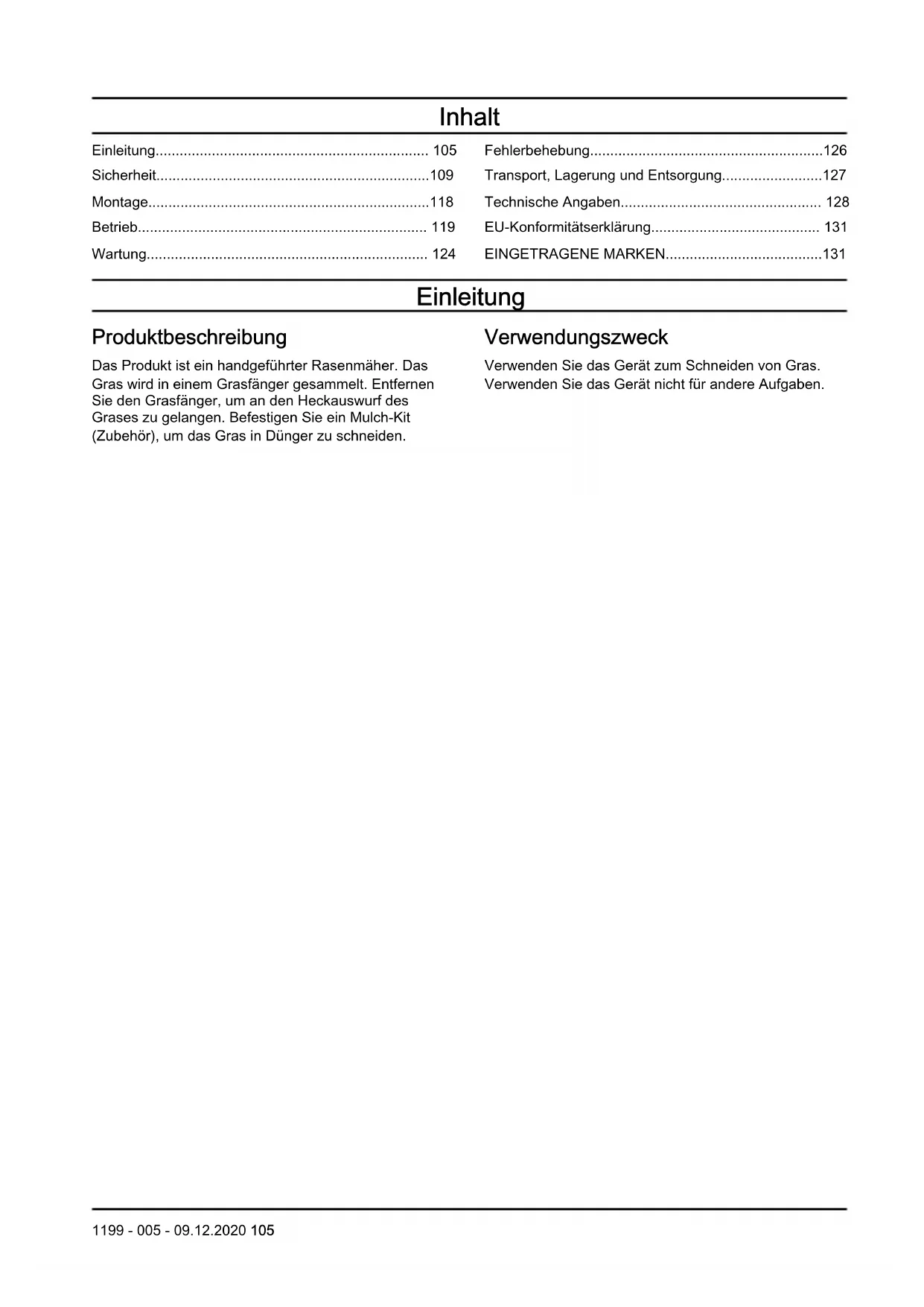 - EINGETRAGENE MARKEN Einleitung Produktbeschreibung Das Produkt ist ein handgeführter Rasenmäher. Das Gras wird in einem Grasfänger gesammelt. Entfernen Sie den Grasfänger, um an den Heckauswurf des Grases zu gelangen. Befestigen Sie ein Mulch-Kit (Zubehör), um das Gras in Dünger zu schneiden. Verwendungszweck Verwenden Sie das Gerät zum Schneiden von Gras. Verwenden Sie das Gerät nicht für andere Aufgaben. 1199 - 005 - 09.12.2020 105Produktübersicht p. 131
