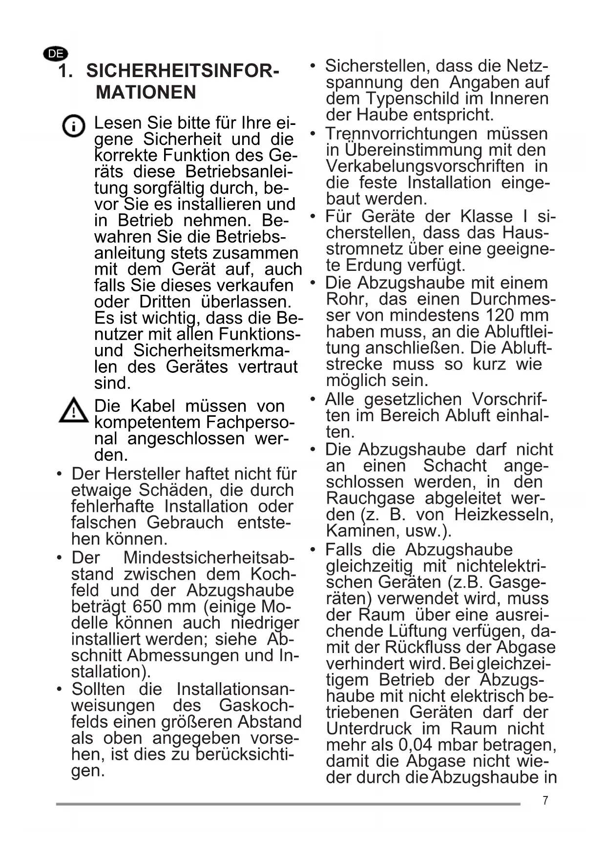 - Falls die Abzugshaube gleichzeitig mit nichtelektri- schen Geräten (z.B. Gasge- räten) verwendet wird, muss der Raum über eine ausrei- chende Lüftung verfügen, da- mit der Rückfluss der Abgase verhindert wird. Bei gleichzei- tigem Betrieb der Abzugs- haube mit nicht elektrisch be- triebenen Geräten darf der Unterdruck im Raum nicht mehr als 0,04 mbar betragen, damit die Abgase nicht wie- der durch die Abzugshaube in 7den Raum gesogen werden.