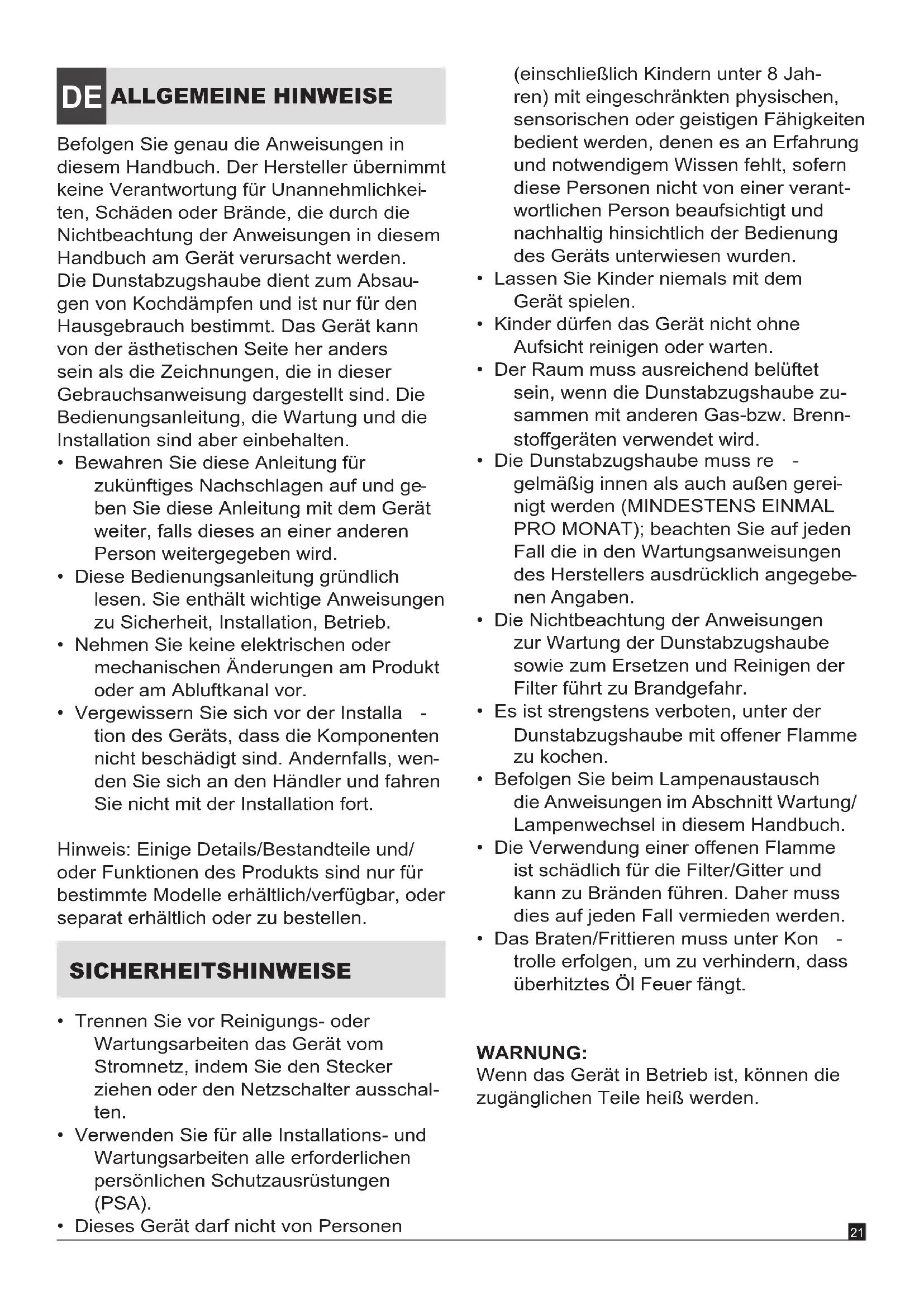 ten, Schäden oder Brände, die durch die Nichtbeachtung der Anweisungen in diesem Handbuch am Gerät verursacht werden. Die Dunstabzugshaube dient zum Absau