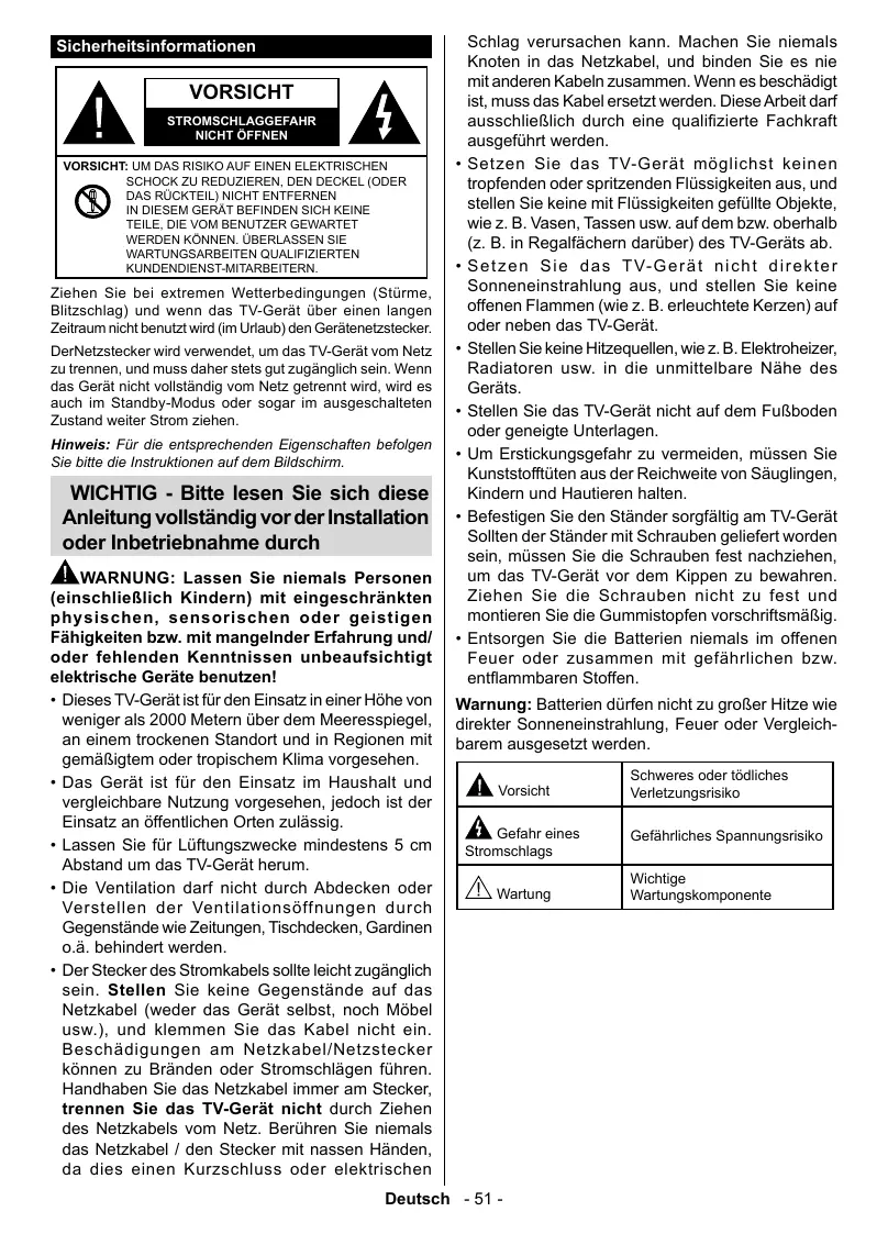 Symboles sur le produit26 Entretien27 Fixation / Retrait du Piédestal28 Lors de l'utilisation de l’applique de suspension au mur28 Informations sur l'environnement28 Fonctions29 Accessoires Inclus29 Mise en Veille29 Commutateur de commande et fonctionnement de la TV29 Insertion des piles dans la télécommande30 Branchement à l'alimentation 30 Branchement de l’antenne30 Notification30 Spécifications32 Télécommande33 Utilisation de la Liste de Chaînes42 Configuration des Paramètres Parentaux42 Guide des Programmes Électroniques (EPG)42 Services Télétexte43 Mise à Jour du Logiciel43 Résolution des Problèmes et Astuces44 Modes d’affichage Typiques d’une Entrée de PC.. 44 Compatibilité des Signaux AV et HDMI45 Formats de fichiers vidéo pris en charge pour le mode USB46 Formats de fichiers image pris en charge pour le mode USB46 Formats de fichiers audio pris en charge pour le mode USB47 Formats de fichiers de sous-titrage pris en charge pour le mode USB48 Résolutions DVI prises en charge49