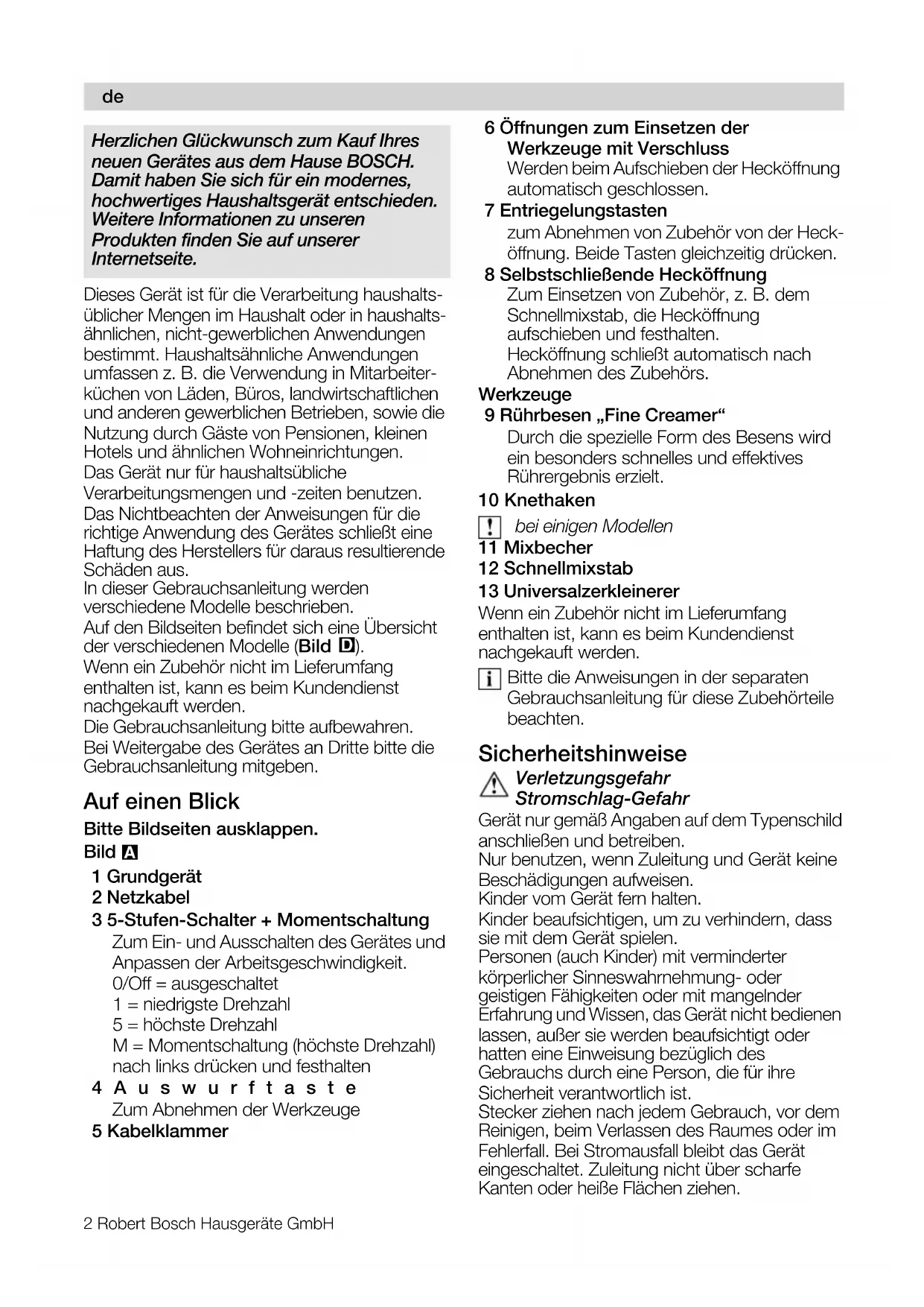 eÉêòäáÅÜÉå=däΩÅâïìåëÅÜ=òìã=h~ìÑ=fÜêÉë= åÉìÉå=dÉê®íÉë=~ìë=ÇÉã=e~ìëÉ=_lp`eK a~ãáí=Ü~ÄÉå=páÉ=ëáÅÜ=ÑΩê=Éáå=ãçÇÉêåÉëI= ÜçÅÜïÉêíáÖÉë=e~ìëÜ~äíëÖÉê®í=ÉåíëÅÜáÉÇÉåK= tÉáíÉêÉ=fåÑçêã~íáçåÉå=òì=ìåëÉêÉå= mêçÇìâíÉå=ÑáåÇÉå=páÉ=~ìÑ=ìåëÉêÉê= fåíÉêåÉíëÉáíÉKRobert Bosch Hausgeräte GmbH 3 Wenn die Anschlussleitung dieses Gerätes beschädigt wird, muss sie durch den Hersteller oder seinen Kundendienst oder eine ähnlich qualifizierte Person ersetzt werden, um Gefährdungen zu vermeiden. Reparaturen am Gerät nur durch unseren Kundendienst vornehmen lassen. Gerät nicht mit feuchten Händen benutzen und nicht im Leerlauf betreiben. Gerät nur mit Originalzubehör betreiben. Nur Werkzeuge eines Typs (z. B. Knethaken) einsetzen. Vorsicht bei der Verarbeitung heißer Flüssigkeiten. Flüssigkeiten können bei der Verarbeitung spritzen. Das Gerät nicht in Flüssigkeit eintauchen. sÉêäÉíòìåÖëÖÉÑ~Üê> tÉêâòÉìÖ=åìê=ÄÉá=píáääëí~åÇ=ÇÉë=dÉê®íÉë= ïÉÅÜëÉäå=Ó=å~ÅÜ=ÇÉã=^ìëëÅÜ~äíÉå=ä®ìÑí=Ç~ë= dÉê®í=âìêòÉ=wÉáí=å~ÅÜK=káÉ=áå=ÇáÉ=êçíáÉêÉåÇÉå= tÉêâòÉìÖÉ=ÖêÉáÑÉåK Bedienen Durch die geschlossene Form des Gehäuses ist das Gerät beim Betrieb besonders leise. Trotzdem erreicht es dabei die volle Motorleistung und Drehzahl. Vor dem ersten Gebrauch Gerät und Werkzeuge reinigen. Mit den Werkzeugen wird ein besonders gutes Ergebnis bei folgenden Anwendungen erreicht: Rührbesen für ... ... Soßen, Eischnee, Kartoffelpürree, Cremes, Mayonnaise, Sahne und leichte Teige, wie z. B. Rührteig. Rührbesen sind zur Verarbeitung von schweren Teigen nicht geeignet. Knethaken für ... ... feste Massen wie Mürb-, Hefe- und Kartoffelteig sowie zum Mischen von schweren Hackfleischteigen, Pasten oder Brotteig. Die maximale Verarbeitungsmenge beträgt 500 g Mehl und Zutaten. Bild