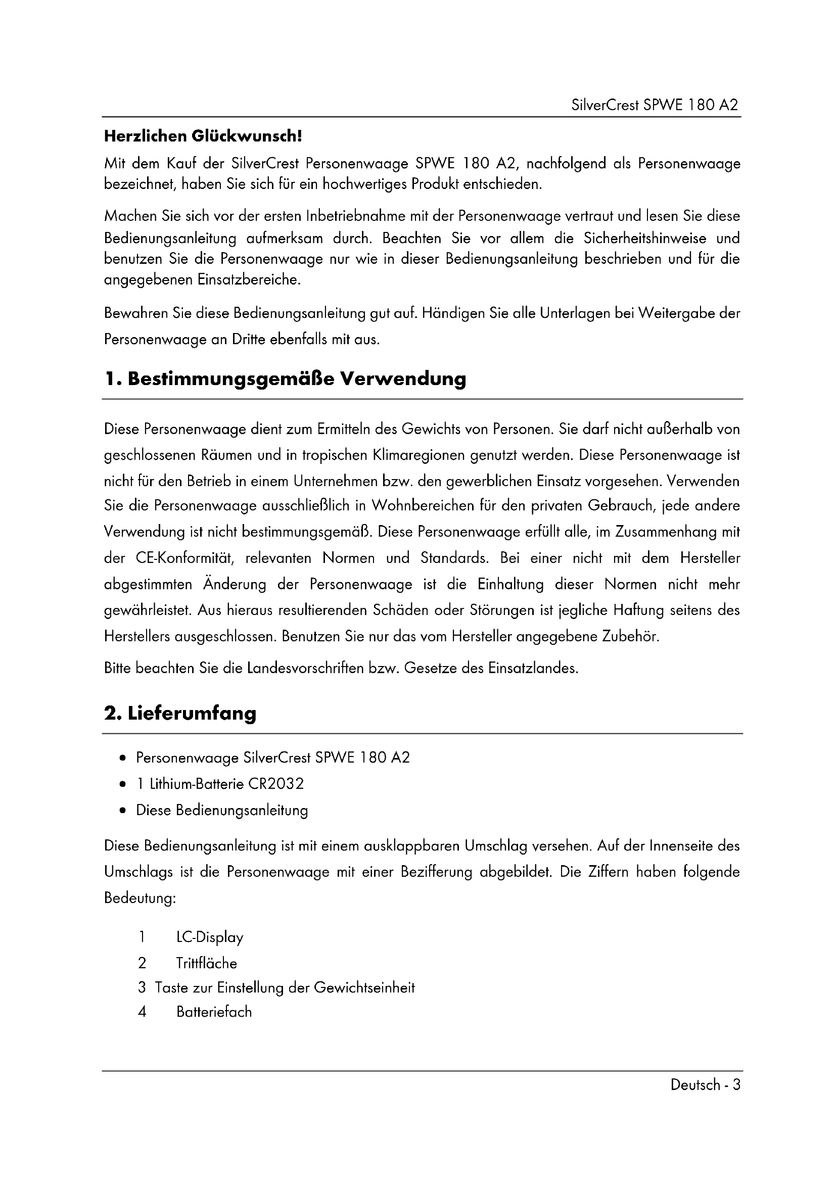 - Diese Bedienungsanleitung Diese Bedienungsanleitung ist mit einem ausklappbaren Umschlag versehen. Auf der Innenseite des Umschlags ist die Personenwaage mit einer Bezifferung abgebildet. Die Ziffern haben folgende Bedeutung: 1 LC-Display 2 Trittfläche 3 Taste zur Einstellung der Gewichtseinheit 4 BatteriefachSilverCrest SPWE 180 A2