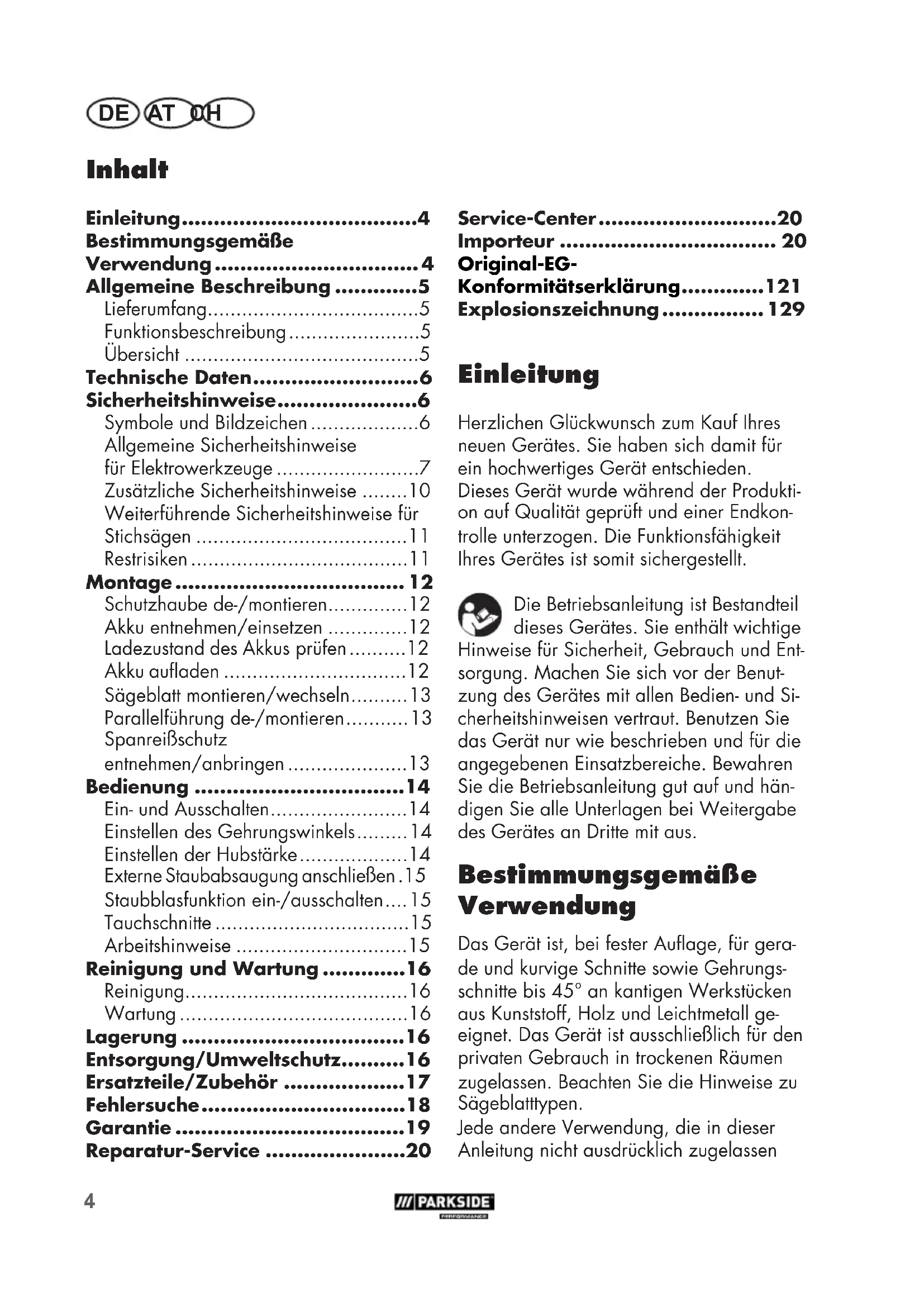 - Einleitung Herzlichen Glückwunsch zum Kauf Ihres neuen Gerätes. Sie haben sich damit für ein hochwertiges Gerät entschieden. Dieses Gerät wurde während der Produkti- on auf Qualität geprüft und einer Endkon- trolle unterzogen. Die Funktionsfähigkeit Ihres Gerätes ist somit sichergestellt. Die Betriebsanleitung ist Bestandteil dieses Gerätes. Sie enthält wichtige Hinweise für Sicherheit, Gebrauch und Ent- sorgung. Machen Sie sich vor der Benut- zung des Gerätes mit allen Bedien- und Si- cherheitshinweisen vertraut. Benutzen Sie das Gerät nur wie beschrieben und für die angegebenen Einsatzbereiche. Bewahren Sie die Betriebsanleitung gut auf und hän- digen Sie alle Unterlagen bei Weitergabe des Gerätes an Dritte mit aus. Bestimmungsgemäße Verwendung Das Gerät ist, bei fester Auage, für gera- de und kurvige Schnitte sowie Gehrungs- schnitte bis 45° an kantigen Werkstücken aus Kunststoff, Holz und Leichtmetall ge- eignet. Das Gerät ist ausschließlich für den privaten Gebrauch in trockenen Räumen zugelassen. Beachten Sie die Hinweise zu Sägeblatttypen. Jede andere Verwendung, die in dieser Anleitung nicht ausdrücklich zugelassen Original-EG- Konformitätserklärung p. 121