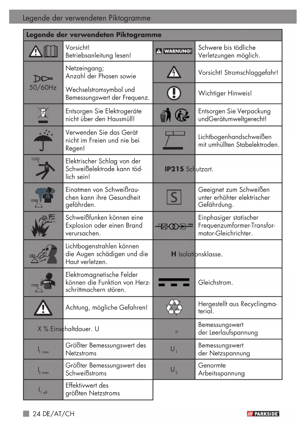 Vermeiden Sie jeden direkten Kontakt mit dem Schweißstromkreis. Die Leer- laufspannung zwischen Elekt- rodenzange und Masseklem- me kann gefährlich sein, es besteht die Gefahr eines elektrischen Schlages. Lagern oder verwenden Sie das Gerät nicht in feuchter oder in nasser Umgebung oder im Regen. Hier gilt die Schutzbestimmung IP21S. Schützen Sie die Augen mit dafür bestimmten Schutzglä- sern (DIN Grad 9-10), die Sie auf dem mitgelieferten Schweißschirm befestigen. Verwenden Sie Handschuhe und trockene Schutzkleidung, die frei von Öl und Fett ist, um die Haut vor der ultravioletten Strahlung des Lichtbogens zu schützen. Verwenden Sie die Schweißstromquelle nicht zum Auftauen von Rohren. Beachten Sie: Die Strahlung des Lichtbogens kann die Augen schädigen und Verbrennungen auf der Haut hervorrufen. Das Lichtbogenschweißen erzeugt Funken und Tropfen von geschmolzenem Metall, Sicherheitshinweise28 DE/AT/CH das geschweißte Werkstück beginnt zu glühen und bleibt relativ lange sehr heiß. Berüh- ren Sie das Werkstück deshalb nicht mit bloßen Händen. Beim Lichtbogenschweißen werden gesundheitsschädliche Dämpfe freigesetzt. Achten Sie darauf, diese möglichst nicht einzuatmen. Schützen Sie sich gegen die gefährlichen Effekte des Licht- bogens und halten Sie nicht an der Arbeit beteiligte Personen mindestens 2m vom Licht- bogen entfernt. ACHTUNG! Während des Betriebes des Schweißgerätes kann es, abhängig von den Netzbedin- gungen am Anschlusspunkt, zu Störungen in der Span- nungsversorgung für andere Verbraucher kommen. Wenden Sie sich im Zweifelsfall an Ihr Energieversorgungsunter- nehmen. Während des Betriebes des Schweißgerätes kann es zu Funktionsstörungen anderer Geräte kommen, z.B. Hörge- räte, Herzschrittmacher usw. z Gefahrenquellen beim Lichtbogenschweißen Beim Lichtbogenschweißen er- gibt sich eine Reihe von Gefah- renquellen. Es ist daher für den Schweißer besonders wichtig, nachfolgende Regeln zu beach- ten, um sich und andere nicht zu gefährden und Schäden für Mensch und Gerät zu vermeiden. Lassen Sie Arbeiten auf der Netzspannungsseite, z.B. an Kabeln, Steckern, Steckdosen usw., nur von einer Elektrofach- kraft nach nationalen und örtli- chen Vorschriften ausführen. Trennen Sie bei Unfällen das Schweißgerät sofort von der Netzspannung. Wenn elektrische Berührungs- spannungen auftreten, schalten Sie das Gerät sofort aus und lassen es von einer Elektrofach- kraft überprüfen. Auf der Schweißstromseite immer auf gute elektrische Kon- takte achten. Beim Schweißen immer an beiden Händen isolierende Handschuhe tragen. Diese schützen vor elektrischen Schlägen (Leerlaufspannung des Schweißstromkreises), vor schädlichen Strahlungen Sicherheitshinweise29DE/AT/CH (Wärme und UV-Strahlung) sowie vor glühendem Metall und Schlagspritzern. Festes, isolierendes Schuhwerk tragen. Die Schuhe sollen auch bei Nässe isolieren. Halb- schuhe sind nicht geeignet, da herabfallende, glühende Metalltropfen Verbrennungen verursachen können. Geeignete Schutzkleidung tragen, keine synthetischen Kleidungsstücke. Nicht mit ungeschützten Augen in den Lichtbogen sehen, nur Schweißer-Schweiß- schirm mit vorschriftsmäßigem Schutzglas nach DIN verwen- den. Der Lichtbogen gibt au- ßer Licht- und Wärmestrahlen, die eine Blendung bzw. Ver- brennung verursachen, auch UV-Strahlen ab. Diese unsicht- bare ultraviolette Strahlung verursacht bei ungenügendem Schutz eine erst einige Stun- den später bemerkbare, sehr schmerzhafte Bindehautentzün- dung. Außerdem ruft UV-Strah- lung auf ungeschützte Körper- stellen Verbrennung wie bei einem Sonnenbrand hervor. Auch in der Nähe des Licht- bogens befindlichen Personen oder Helfer müssen auf die Gefahren hingewiesen und mit den nötigen Schutzmitteln ausgerüstet werden. Wenn erforderlich, Schutzwände aufstellen. Beim Schweißen, besonders in kleinen Räumen, ist für aus- reichende Frischluftzufuhr zu sorgen, da Rauch und schäd- liche Gase entstehen. An Behältern, in denen Gase, Treibstoffe, Mineralöle oder dgl. gelagert werden, dürfen – auch wenn sie schon vor langer Zeit entleert wurden – keine Schweißarbeiten vorge- nommen werden, da durch Rückstände Explosionsgefahr besteht. In feuer- und explosionsgefähr- deten Räumen gelten besondere Vorschriften. Schweißverbindungen, die großen Beanspruchungen ausgesetzt sind und bestimmte Sicherheitsforde rungen erfül- len müssen, dürfen nur von besonders ausgebildeten und geprüften Schweißern aus- geführt werden. Beispiele sind Druckkessel, Laufschienen, Anhängerkupplungen usw. ACHTUNG! Schließen Sie die Masseklemme stets so nahe wie möglich an die Schweißstelle an, so dass der Schweißstrom Sicherheitshinweise30 DE/AT/CH den kürzestmöglichen Weg von der Elektrode zur Masseklemme nehmen kann. Verbinden Sie die Masseklemme niemals mit dem Gehäuse des Schweißgerätes! Schließen Sie die Masseklemme niemals an geerdeten Teilen an, die weit vom Werkstück entfernt liegen, z. B. einem Wasserrohr in einer anderen Ecke des Raumes. Andernfalls könnte es dazu kom- men, dass das Schutzleitersystem des Raumes, in dem Sie schwei- ßen, beschädigt wird. Verwenden Sie das Schweiß- gerät nicht im Regen. Verwenden Sie das Schweiß- gerät nicht in feuchter Umge- bung. Stellen Sie das Schweißgerät nur auf einen ebenen Platz. Der Ausgang ist bei einer Umgebungstemperatur von 20 °C bemessen. Die Schweiß- zeit kann bei höheren Temperaturen verringert sein. Gefährdung durch elektrischen Schlag: Elektrischer Schlag von einer Schweißelektrode kann tödlich sein. Nicht bei Regen oder Schnee schweißen. Trockene Isolierhandschuhe tragen. Die Elektrode nicht mit bloßen Händen anfassen. Keine nassen oder beschädigten Hand- schuhe tragen. Schützen Sie sich vor einem elektrischen Schlag durch Isolierungen gegen das Werkstück. Das Gehäuse der Einrichtung nicht öffnen. Gefährdung durch Schweißrauch: Das Einatmen von Schweiß- rauch kann die Ges