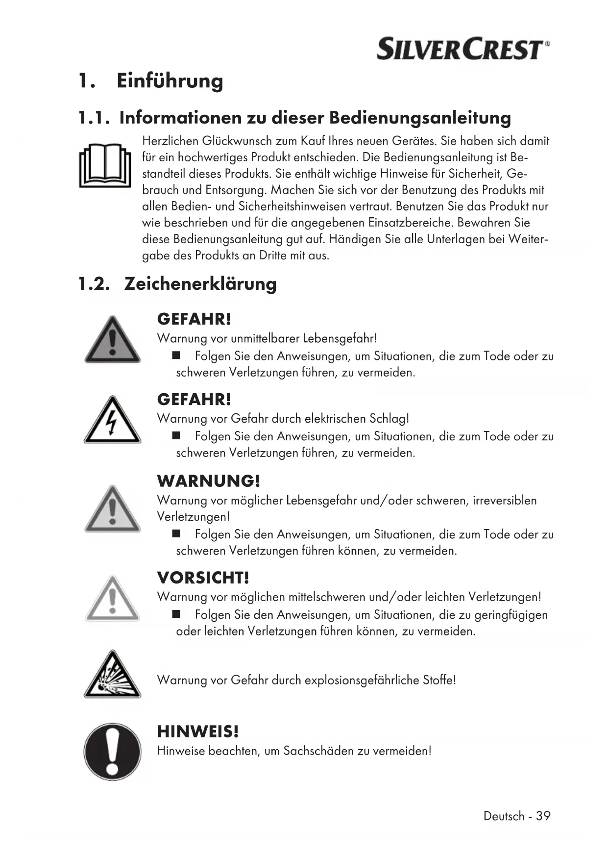 1.1. Informationen zu dieser Bedienungsanleitung Herzlichen Glückwunsch zum Kauf Ihres neuen Gerätes. Sie haben sich damit für ein hochwertiges Produkt entschieden. Die Bedienungsanleitung ist Be- standteil dieses Produkts. Sie enthält wichtige Hinweise für Sicherheit, Ge- brauch und Entsorgung. Machen Sie sich vor der Benutzung des Produkts mit allen Bedien- und Sicherheitshinweisen vertraut. Benutzen Sie das Produkt nur wie beschrieben und für die angegebenen Einsatzbereiche. Bewahren Sie diese Bedienungsanleitung gut auf. Händigen Sie alle Unterlagen bei Weiter- gabe des Produkts an Dritte mit aus. 1.2. Zeichenerklärung GEFAHR! Warnung vor unmittelbarer Lebensgefahr! Folgen Sie den Anweisungen, um Situationen, die zum Tode oder zu schweren Verletzungen führen, zu vermeiden. GEFAHR! Warnung vor Gefahr durch elektrischen Schlag! Folgen Sie den Anweisungen, um Situationen, die zum Tode oder zu schweren Verletzungen führen, zu vermeiden. WARNUNG! Warnung vor möglicher Lebensgefahr und/oder schweren, irreversiblen Verletzungen! Folgen Sie den Anweisungen, um Situationen, die zum Tode oder zu schweren Verletzungen führen können, zu vermeiden. VORSICHT! Warnung vor möglichen mittelschweren und/oder leichten Verletzungen! Folgen Sie den Anweisungen, um Situationen, die zu geringfügigen oder leichten Verletzungen führen können, zu vermeiden. Warnung vor Gefahr durch explosionsgefährliche Stoffe! HINWEIS! Hinweise beachten, um Sachschäden zu vermeiden!40 - Deutsch Weiterführende Informationen für den Gebrauch des Gerätes! Hinweise in der Bedienungsanleitung beachten!