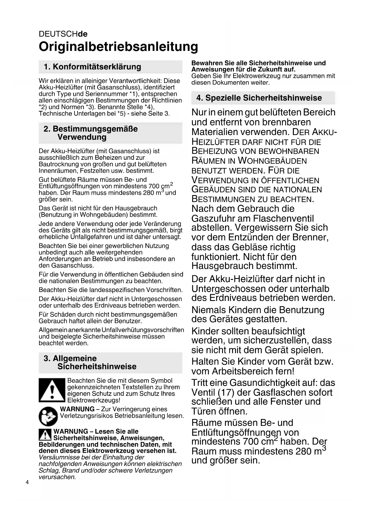 und größer sein. Das Gerät ist nicht für den Hausgebrauch (Benutzung in Wohngebäuden) bestimmt. Jede andere Verwendung oder jede Veränderung des Geräts gilt als nicht bestimmungsgemäß, birgt erhebliche Unfallgefahren und ist daher untersagt. Beachten Sie bei einer gewerblichen Nutzung unbedingt auch alle weitergehenden Anforderungen an Betrieb und insbesondere an den Gasanschluss. Für die Verwendung in öffentlichen Gebäuden sind die nationalen Bestimmungen zu beachten. Beachten Sie die landesspezifischen Vorschriften. Der Akku-Heizlüfter darf nicht in Untergeschossen oder unterhalb des Erdniveaus betrieben werden. Für Schäden durch nicht bestimmungsgemäßen Gebrauch haftet allein der Benutzer. Allgemein anerkannte Unfallverhütungsvorschriften und beigelegte Sicherheitshinweise müssen beachtet werden. Beachten Sie die mit diesem Symbol gekennzeichneten Textstellen zu Ihrem eigenen Schutz und zum Schutz Ihres Elektrowerkzeugs! WARNUNG – Zur Verringerung eines Verletzungsrisikos Betriebsanleitung lesen. WARNUNG – Lesen Sie alle Sicherheitshinweise, Anweisungen, Bebilderungen und technischen Daten, mit denen dieses Elektrowerkzeug versehen ist. Versäumnisse bei der Einhaltung der nachfolgenden Anweisungen können elektrischen Schlag, Brand und/oder schwere Verletzungen verursachen. Bewahren Sie alle Sicherheitshinweise und Anweisungen für die Zukunft auf. Geben Sie Ihr Elektrowerkzeug nur zusammen mit diesen Dokumenten weiter. Nur in einem gut belüfteten Bereich und entfernt von brennbaren Materialien verwenden. D ER AKKU- HEIZLÜFTER DARF NICHT FÜR DIE