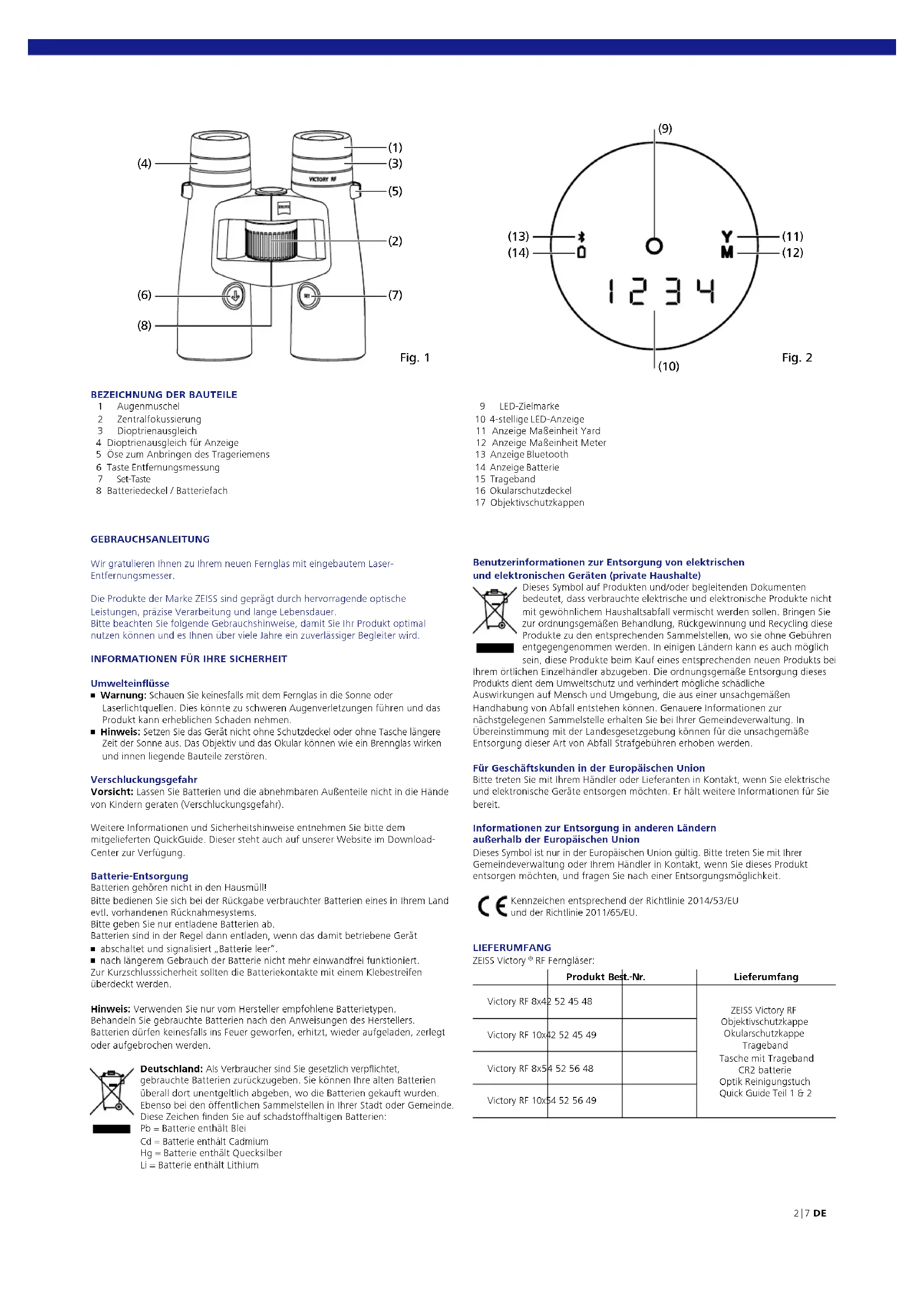 ZEISS Victory RF 8x42 | 10x42 | 8x54 | 10x54 Gebrauchsanleitung DE EN FR IT ES NL SE FI CZ PL HU RU JP CN | 01.2018 This product may be covered by one or more of the following United States patents: US6542302, US6816310, US6906862 For further United States patents which may cover this product see our website. Patents: www.zeiss.com/sports-optics/us/patentsBEZEICHNUNG DER BAUTEILE 1 Augenmuschel 2 Zentralfokussierung 3 Dioptrienausgleich 4 Dioptrienausgleich für Anzeige 5 Öse zum Anbringen des Trageriemens 6 Taste Entfernungsmessung 7 Set-Taste 8 Batteriedeckel / Batteriefach Benutzerinformationen zur Entsorgung von elektrischen und elektronischen Geräten (private Haushalte) Dieses Symbol auf Produkten und/oder begleitenden Dokumenten bedeutet, dass verbrauchte elektrische und elektronische Produkte nicht mit gewöhnlichem Haushaltsabfall vermischt werden sollen. Bringen Sie zur ordnungsgemäßen Behandlung, Rückgewinnung und Recycling diese Produkte zu den entsprechenden Sammelstellen, wo sie ohne Gebühren entgegengenommen werden. In einigen Ländern kann es auch möglich sein, diese Produkte beim Kauf eines entsprechenden neuen Produkts bei Ihrem örtlichen Einzelhändler abzugeben. Die ordnungsgemäße Entsorgung dieses Produkts dient dem Umweltschutz und verhindert mögliche schädliche Auswirkungen auf Mensch und Umgebung, die aus einer unsachgemäßen Handhabung von Abfall entstehen können. Genauere Informationen zur nächstgelegenen Sammelstelle erhalten Sie bei Ihrer Gemeindeverwaltung. In Übereinstimmung mit der Landesgesetzgebung können für die unsachgemäße Entsorgung dieser Art von Abfall Strafgebühren erhoben werden. Für Geschäftskunden in der Europäischen Union Bitte treten Sie mit Ihrem Händler oder Lieferanten in Kontakt, wenn Sie elektrische und elektronische Geräte entsorgen möchten. Er hält weitere Informationen für Sie bereit. Informationen zur Entsorgung in anderen Ländern außerhalb der Europäischen Union Dieses Symbol ist nur in der Europäischen Union gültig. Bitte treten Sie mit Ihrer Gemeindeverwaltung oder Ihrem Händler in Kontakt, wenn Sie dieses Produkt entsorgen möchten, und fragen Sie nach einer Entsorgungsmöglichkeit. Kennzeichen entsprechend der Richtlinie 2014/53/EU und der Richtlinie 2011/65/EU. LIEFERUMFANG ZEISS Victory