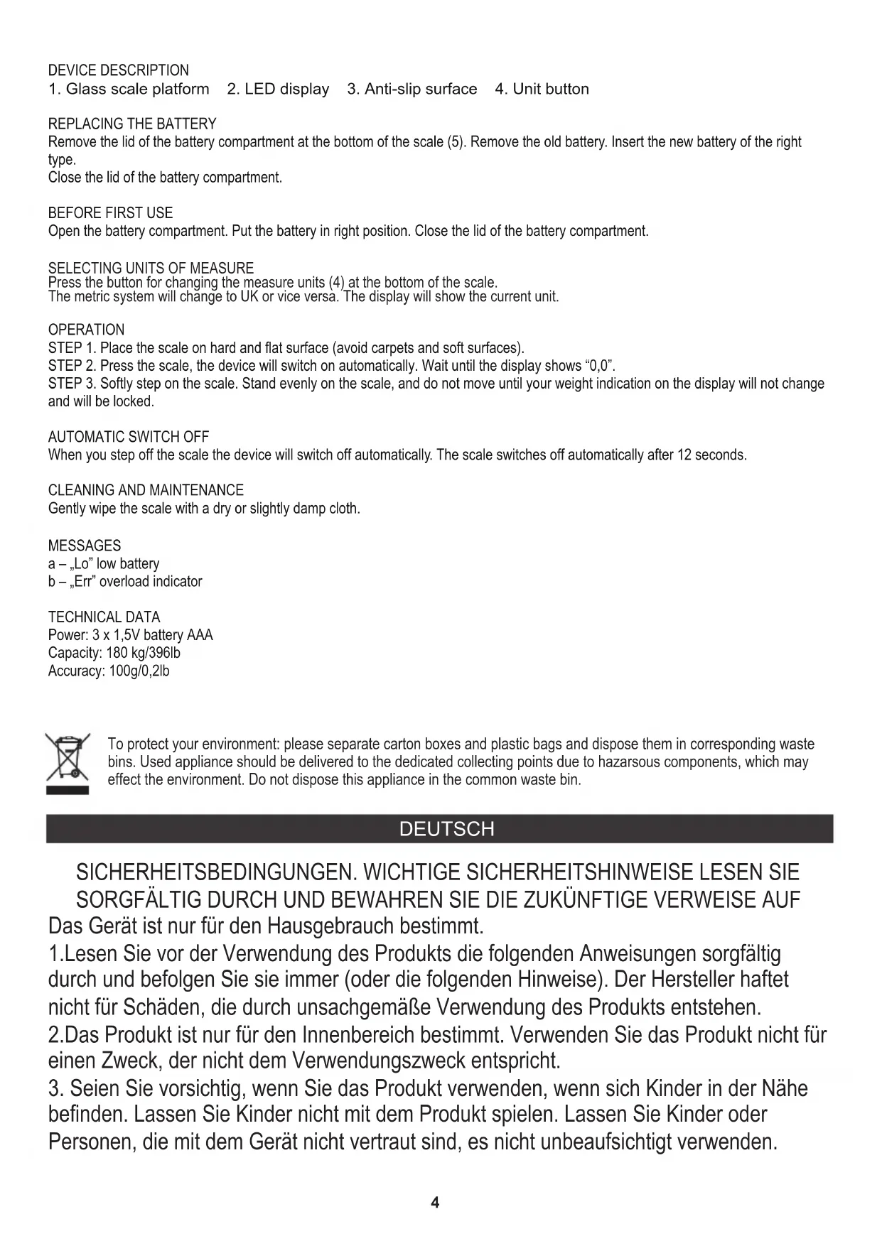 Öffnen Sie das Batteriefach. Setzen Sie die Batterie in die richtige Position. Schließen Sie den Deckel des Batteriefachs. SCHRITT 2. Drücken Sie die Waage, das Gerät schaltet sich automatisch ein. Warten Sie, bis das Display „0,0“ anzeigt. SCHRITT 3. Treten Sie sanft auf die Waage. Stellen Sie sich gleichmäßig auf die Waage und bewegen Sie sich nicht, bis sich Ihre Gewichtsanzeige auf dem Display nicht ändert und gesperrt ist. Das metrische System ändert sich zu UK oder umgekehrt. Das Display zeigt die aktuelle Einheit an. SCHRITT 1. Stellen Sie die Waage auf eine harte und ebene Oberfläche (vermeiden Sie Teppiche und weiche Oberflächen). Drücken Sie die Taste zum Ändern der Maßeinheiten (4) am unteren Rand der Skala. Entfernen Sie den Deckel des Batteriefachs an der Unterseite der Waage (5). Entfernen Sie die alte Batterie. Setzen Sie die neue Batterie des richtigen Typs ein. Schließen Sie den Deckel des Batteriefachs. Den Pappkarton im Altpapier entsorgen. Polyäthylenbeutel (PE) in dem Behälter für Kunststoff entsorgen. Das abgenutzte Gerät zum Recycling zu einer offiziellen Sammelstelle bringen, da es gefährliche Substanzen enthält, die die Umwelt gefährden können. Das Gerät sollte in einer Form abgegeben werden, die eine weitere Nutzung unmöglich macht. Wenn es Batterien enthält, sollten diese rausgenommen und separat an einer Sammelstelle abgegeben werden. Das Gerät darf nicht in den Hausmüll rausgeworfen werden!! FRANÇAIS CONDITIONS DE SÉCURITÉ. CONSIGNES DE SÉCURITÉ IMPORTANTES À LIRE ATTENTIVEMENT ET À CONSERVER POUR RÉFÉRENCE FUTURE 1.Avant d'utiliser le produit, veuillez lire attentivement les instructions suivantes et toujours les suivre (ou les remarques ci-dessous). Le fabricant n'est pas responsable des dommages résultant d'une mauvaise utilisation du produit.