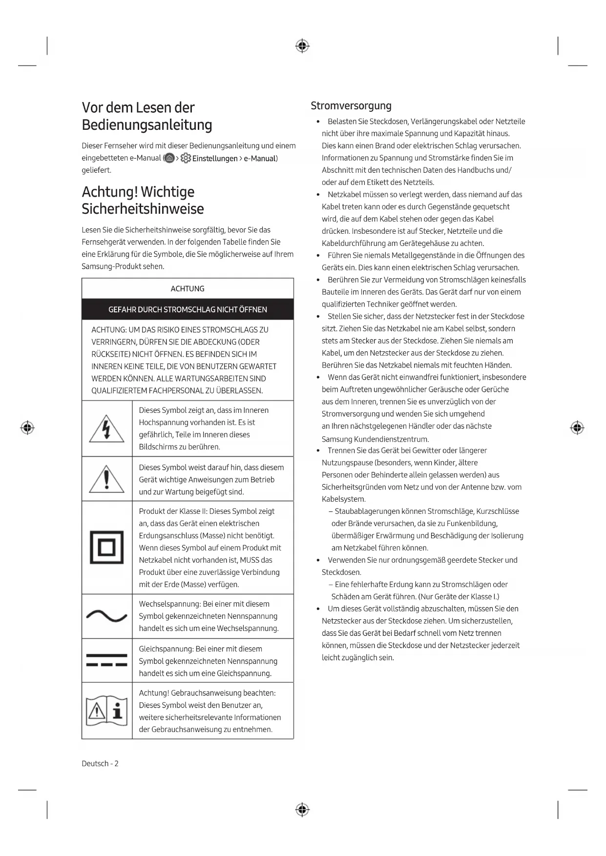 - Die Abbildungen und Illustrationen in diesem Handbuch dienen nur zur Information und können vom tatsächlichen Aussehen des Geräts abweichen. Änderungen an Ausführung und technischen Daten vorbehalten. Bei jeder Reparatur sind zwingend die von Samsung bereitgestellten Reparatur- und Wartungsanweisungen zu beachten. Samsung übernimmt keinerlei Haftung für den Fall, dass infolge einer nicht entsprechend fachgerechten Reparatur oder eines nicht fachgerechten Reparaturversuchs Schäden jeglicher Art am Produkt, wie auch mögliche Verletzungen oder Produktsicherheitsmängel auftreten. Nicht fachgerecht ist eine Reparatur insbesondere, wenn die von Samsung bereitgestellten Reparatur- und Wartungsanweisungen nicht eingehalten wurden. Jegliche Schäden am Produkt, die auf einer Reparatur oder eines Reparaturversuchs durch Dritte, die nicht von Samsung als Service-Dienstleister zertifiziert sind, zurückzuführen sind, sind von der Herstellergarantie ausgeschlossen. Auf der Webseite https://www.samsung.com/de/support/ findest du weitere Informationen zum externen Netzadapter und zur Fernbedienung im Hinblick auf die europäische Ökodesign- Richtlinie (ErP). Deutsch - 8Ordnungsgemäße Entsorgung dieses Geräts (Elektro- & Elektronik-Altgeräte) (Anwendbar in Ländern mit Systemen zur getrennten Sammlung von Wertstoffen). Diese Kennzeichnung auf dem Bildschirm, dem Zubehör oder der Dokumentation bedeutet, dass der Bildschirm sowie das elektronische Zubehör (z.B. Ladegerät, Headset, USB-Kabel) am Ende ihrer Lebensdauer nicht im normalen Hausmüll entsorgt werden dürfen. Entsorgen Sie diese Geräte bitte getrennt von anderen Abfällen, um der Umwelt bzw. der menschlichen Gesundheit nicht durch unkontrollierte Müllbeseitigung zu schaden. Recyceln Sie den Bildschirm, um die nachhaltige Wiederverwertung von stofflichen Ressourcen zu fördern. Private Nutzer sollten den Händler, bei dem das Produkt gekauft wurde, oder die zuständigen Behörden kontaktieren, um in Erfahrung zu bringen, wie sie den Bildschirm auf umweltfreundliche Weise recyceln können. Gewerbliche Benutzer wenden sich an ihren Lieferanten und überprüfen die Konditionen Ihres Kaufvertrags. Der Bildschirm und seine elektronischen Zubehörteile dürfen nicht zusammen mit anderem Gewerbemüll entsorgt werden. Ordnungsgemäße Entsorgung der Batterien in diesem Gerät (Anwendbar in Ländern mit Systemen zur getrennten Sammlung von Wertstoffen). Diese Kennzeichnung auf der Batterie, dem Handbuch oder der Verpackung bedeutet, dass die Batterien am Ende ihrer Lebensdauer nicht im normalen Hausmüll entsorgt werden dürfen. Die Kennzeichnung mit den chemischen Symbolen „Hg“, „Cd“ oder „Pb“ bedeutet, dass die Batterie Quecksilber, Cadmium oder Blei in Mengen enthält, die die Grenzwerte der EU-Direktive 2006/66 übersteigen. Wenn Batterien nicht ordnungsgemäß entsorgt werden, können diese Substanzen die Gesundheit von Menschen oder die Umwelt gefährden. Zum Schutz der natürlichen Ressourcen und zur Förderung der Wiederverwertung von Materialien trennen Sie die Batterien von anderem Müll und führen Sie sie Ihrem örtlichen Recyclingsystem zu. Deutsch - 9 DeutschΠροτού διαβάσετε αυτό το εγχειρίδιο χρήσης Η παρούσα τηλεόραση συνοδεύεται από αυτό το εγχειρίδιο χρήσης και ένα ενσωματωμένο ηλεκτρονικό εγχειρίδιο, το e-Manual ( > Ρυθμίσεις > e-Manual). Προειδοποίηση! Σημαντικές οδηγίες για την ασφάλεια Διαβάστε τις οδηγίες για την ασφάλεια προτού χρησιμοποιήσετε την τηλεόραση. Ανατρέξτε στον παρακάτω πίνακα για την επεξήγηση των συμβόλων που ενδεχομένως να υπάρχουν επάνω στο προϊόν Samsung που διαθέτετε.