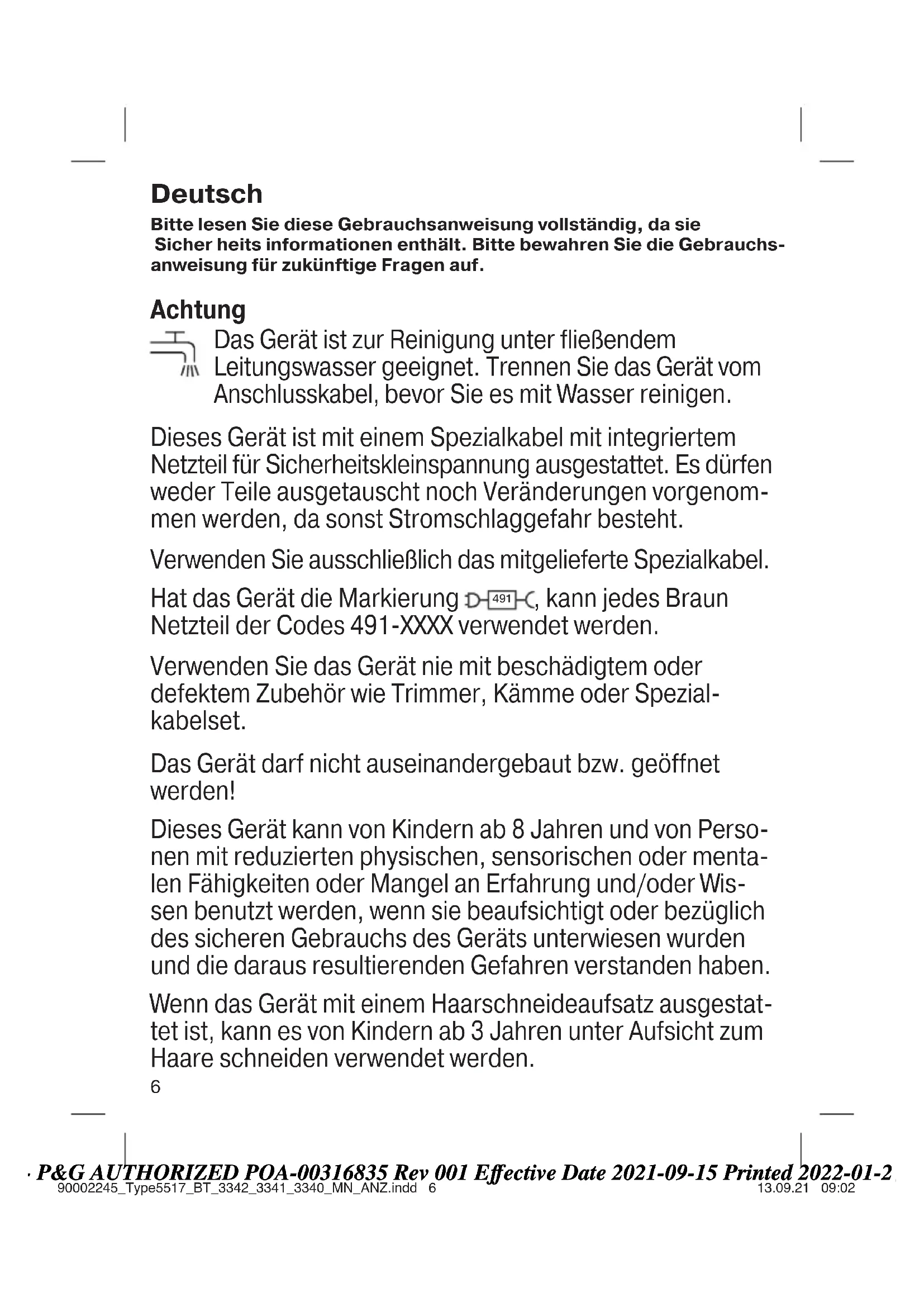 off oil oil 90002245_Type5517_BT_3342_3341_3340_MN_ANZ.indd 590002245_Type5517_BT_3342_3341_3340_MN_ANZ.indd 5 13.09.21 09:0213.09.21 09:02 Business Use - P&G AUTHORIZED POA-00316835 Rev 001 Effective Date 2021-09-15 Printed 2022-01-25 Page 5 of 526 Deutsch Bitte lesen Sie diese Gebrauchsanweisung vollständig, da sie Sicher heits informationen enthält. Bitte bewahren Sie die Gebrauchs- anweisung für zukünftige Fragen auf. Achtung Das Gerät ist zur Reinigung unter fließendem Leitungswasser geeignet. Trennen Sie das Gerät vom Anschlusskabel, bevor Sie es mit Wasser reinigen. Dieses Gerät ist mit einem Spezialkabel mit integriertem Netzteil für Sicherheitskleinspannung ausgestattet. Es dürfen weder Teile ausgetauscht noch Veränderungen vorgenom- men werden, da sonst Stromschlaggefahr besteht. Verwenden Sie ausschließlich das mitgelieferte Spezialkabel. Hat das Gerät die Markierung