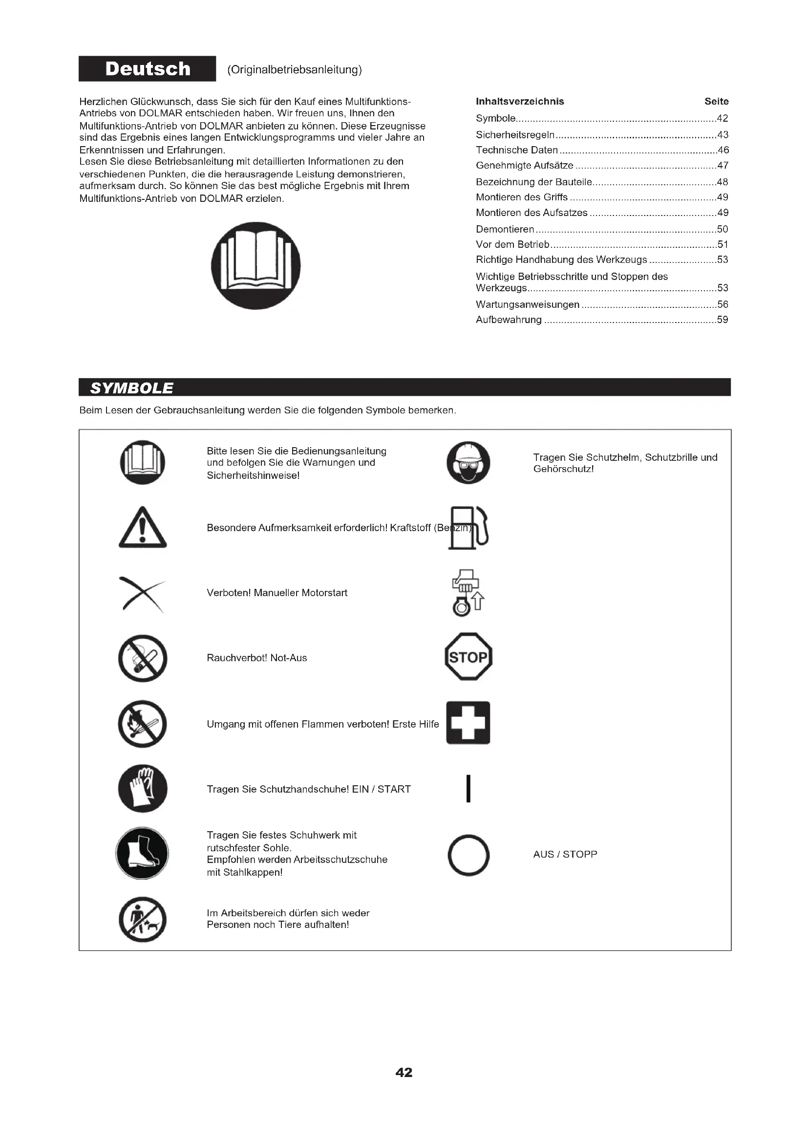 - Avant d’envoyez votre machine en réparation, vériez si vous pouvez régler le problème vous-même. Si vous découvrez une anomalie, contrôlez votre machine selon les descriptions de ce mode d’emploi. Ne démontez et ne modiez aucune pièce d’une manière contraire à la description. Pour toute réparation, contactez un agent d’entretien agréé ou un revendeur local. Problème Cause probable (dysfonctionnement) Solution Le moteur ne démarre pas Oubli d’activation de la pompe d’amorçage Appuyer 7 à 10 fois Tirage lent de la corde du démarreur Tirer plus fort Panne de carburant Faire le plein Filtre de carburant bouché Nettoyer Tube de carburant plié Redresser le tube de carburant Carburant détérioré Du carburant détérioré rend le démarrage plus difcile. Remplacez-le par du carburant neuf. (Remplacement recommandé : 1 fois par mois) Aspiration excessive du carburant Régler le levier d’accélération de la vitesse moyenne à la vitesse élevée et tirer sur la poignée de démarrage jusqu’à ce que le moteur démarre. Dès que le moteur démarre, la pièce de xation commence à tourner ou se déplacer. Accorder une attention particulière à la pièce de xation. Si le moteur ne démarre toujours pas, retirer la bougie, sécher l’électrode et ré-assembler ces éléments comme ils l’étaient à l’origine. Ensuite, démarrer comme indiqué. Protecteur de bougie débranché Le brancher solidement Bougie contaminée Nettoyer Espacement anormal de la bougie Régler l’espacement Autre problème de la bougie Remplacer Carburateur anormal Faire une demande d’examen et d’entretien. Impossible de tirer la corde de démarrage Faire une demande d’examen et d’entretien. Entraînement anormal Faire une demande d’examen et d’entretien. Le moteur s’arrête rapidement La vitesse du moteur n’augmente pas Réchauffement insufsant Réchauffer le moteur Le levier d’étrangleur est en position « FERMER » alors que le moteur est chaud. Le régler sur « OUVERT ». Filtre de carburant bouché Nettoyer ou remplacer Filtre à air contaminé ou bouché Nettoyer Carburateur anormal Faire une demande d’examen et d’entretien. Entraînement anormal Faire une demande d’examen et d’entretien. La pièce de xation ne tourne pas et ne se déplace pas Elle n’est pas insérée au bon endroit. L’insérer comme indiqué. Entraînement anormal Faire une demande d’examen et d’entretien. Vibrations anormales de la machine La pièce de xation n’est pas insérée au bon endroit. L’insérer comme indiqué. Levier desserré Serrer à fond. Entraînement anormal Faire une demande d’examen et d’entretien. La pièce de xation ne s’arrête pas immédiatement Rotation élevée au ralenti Régler Fil de l’étrangleur détaché Le brancher solidement Entraînement anormal Faire une demande d’examen et d’entretien. Le moteur ne s’arrête pas Connecteur débranché Le brancher solidement Système électrique anormal Faire une demande d’examen et d’entretien. Lorsque le moteur ne démarre pas après avoir été réchauffé : Si aucun problème n’apparaît après vérication, ouvrez l’étrangleur d’environ 1/3 et démarrez le moteur. Arrêtez immédiatement le moteur Arrêtez immédiatement le moteur Arrêtez immédiatement le moteur Faites tourner le moteur au ralenti et réglez le levier d’étrangleur sur FERMER.42 Herzlichen Glückwunsch, dass Sie sich für den Kauf eines Multifunktions-Antriebs von DOLMAR entschieden haben. Wir freuen uns, Ihnen den Multifunktions-Antrieb von DOLMAR anbieten zu können. Diese Erzeugnisse sind das Ergebnis eines langen Entwicklungsprogramms und vieler Jahre an Erkenntnissen und Erfahrungen.Lesen Sie diese Betriebsanleitung mit detaillierten Informationen zu den verschiedenen Punkten, die die herausragende Leistung demonstrieren, aufmerksam durch. So können Sie das best mögliche Ergebnis mit Ihrem Multifunktions-Antrieb von DOLMAR erzielen.Beim Lesen der Gebrauchsanleitung werden Sie die folgenden Symbole bemerken.Bitte lesen Sie die Bedienungsanleitung und befolgen Sie die Warnungen und Sicherheitshinweise!Tragen Sie Schutzhelm, Schutzbrille und Gehörschutz!Besondere Aufmerksamkeit erforderlich! Kraftstoff (Benzin)Verboten! Manueller MotorstartRauchverbot! Not-AusUmgang mit offenen Flammen verboten! Erste HilfeTragen Sie Schutzhandschuhe! EIN / START Tragen Sie festes Schuhwerk mit rutschfester Sohle.Empfohlen werden Arbeitsschutzschuhe mit Stahlkappen!AUS / STOPPIm Arbeitsbereich dürfen sich weder Personen noch Tiere aufhalten! SYMBOLE Deutsch (Originalbetriebsanleitung) Inhaltsverzeichnis SeiteSymbole p. 42
