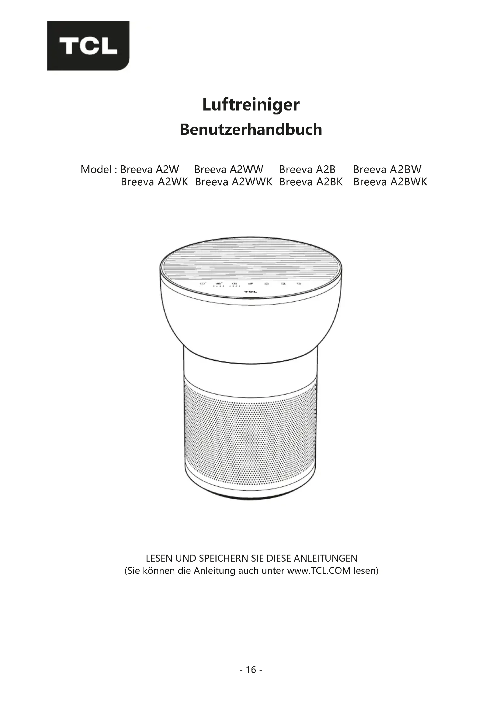 24V 14~24㎡ Breeva A2W Breeva A2WW Breeva A2B Breeva A2BW Breeva A2WK Breeva A2WWK Breeva A2BK Breeva A2BWKKUNDENBETREUUNG Wir sind bestrebt, Sie zu 100 % zufrieden zu stellen und würden uns über Ihr Feedback zu unserem Produkt und Service freuen. Sollte irgendetwas nicht Ihren Vorstellungen entsprechen oder falls Sie Fragen zu Ihrem neuen Produkt haben. Bitte kontaktieren Sie uns über www.tcl.com ohne zu zögern.