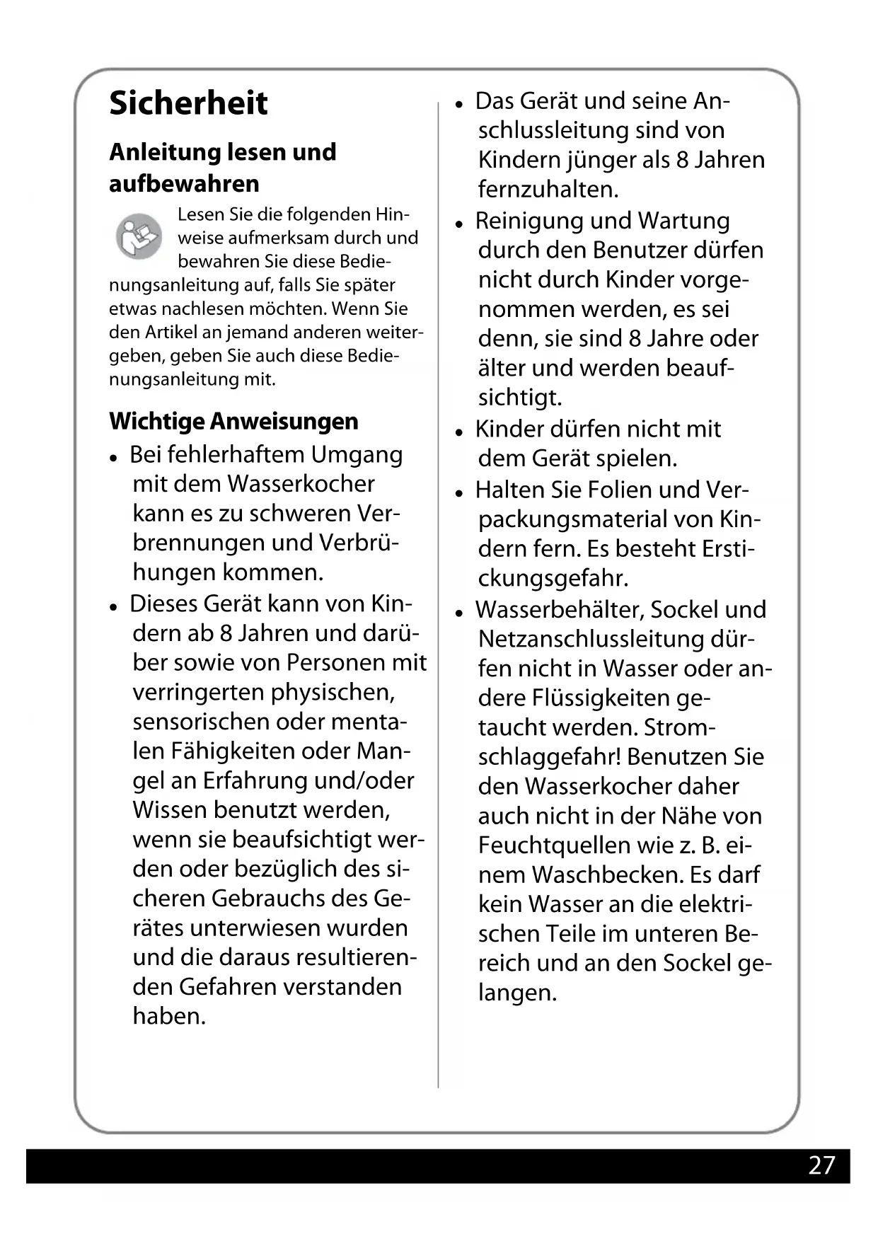 - Konformitätserklärung Sicherheit Anleitung lesen und aufbewahren Lesen Sie die folgenden Hin- weise aufmerksam durch und bewahren Sie diese Bedie- nungsanleitung auf, falls Sie später etwas nachlesen möchten. Wenn Sie den Artikel an jemand anderen weiter- geben, geben Sie auch diese Bedie- nungsanleitung mit. Wichtige Anweisungen z Bei fehlerhaftem Umgang mit dem Wasserkocher kann es zu schweren Ver- brennungen und Verbrü- hungen kommen. z Dieses Gerät kann von Kin- dern ab 8 Jahren und darü- ber sowie von Personen mit verringerten physischen, sensorischen oder menta- len Fähigkeiten oder Man- gel an Erfahrung und/oder Wissen benutzt werden, wenn sie beaufsichtigt wer- den oder bezüglich des si- cheren Gebrauchs des Ge- rätes unterwiesen wurden und die daraus resultieren- den Gefahren verstanden haben. z Das Gerät und seine An- schlussleitung sind von Kindern jünger als 8 Jahren fernzuhalten. z Reinigung und Wartung durch den Benutzer dürfen nicht durch Kinder vorge- nommen werden, es sei denn, sie sind 8 Jahre oder älter und werden beauf- sichtigt. z Kinder dürfen nicht mit dem Gerät spielen. z Halten Sie Folien und Ver- packungsmaterial von Kin- dern fern. Es besteht Ersti- ckungsgefahr. z Wasserbehälter, Sockel und Netzanschlussleitung dür- fen nicht in Wasser oder an- dere Flüssigkeiten ge- taucht werden. Strom- schlaggefahr! Benutzen Sie den Wasserkocher daher auch nicht in der Nähe von Feuchtquellen wie z. B. ei- nem Waschbecken. Es darf kein Wasser an die elektri- schen Teile im unteren Be- reich und an den Sockel ge- langen.28 z Platzieren Sie Wasserko- cher und Sockel so, dass keine Flüssigkeiten auf die Gerätesteckverbindung überlaufen können. z Wenn die Netzanschlusslei- tung dieses Gerätes be- schädigt wird, muss sie durch den Hersteller oder seinen Kundendienst oder Kundenservice ersetzt wer- den, um Gefährdungen zu vermeiden. z Das Gerät darf nicht an eine Zeitschaltuhr, einen Däm- merungsschalter oder an ein sonstiges Fernwirksys- tem angeschlossen wer- den. z WARNUNG: Öffnen Sie nicht den Deckel während des Kochens und beim Aus- gießen. Verbrühungsge- fahr durch heißen Wasser- dampf! z Beachten Sie die Füllmen- gen-Markierung MIN und MAX: -Bei zu wenig eingefülltem Wasser (unter MIN) kann der Wasserkocher über- hitzen. -Bei zu viel eingefülltem Wasser (über MAX) kann heißes Wasser aus dem Behälter herausspritzen. Verbrühungsgefahr! z Betreiben Sie den Wasser- kocher ausschließlich mit dem mitgelieferten Sockel. Es besteht ansonsten Kurz- schluss-und Stromschlag- gefahr! z VORSICHT: Vergewissern Sie sich, dass der Wasserko- cher ausgeschaltet ist, be- vor Sie den Wasserkocher vom Sockel nehmen. z Das Heizelment im Wasser- kocher ist auch nach dem Ausschalten des Wasserko- chers längere Zeit heiß und es besteht Verbrennungs- gefahr. z Bei Verschmutzungen der Oberfläche, z. B. durch Le- bensmittel, schalten Sie den Wasserkocher aus und lassen Sie ihn vollständig abkühlen. Reinigen Sie die Oberfläche mit einem wei- chen, leicht angefeuchte- ten Tuch. Verwenden Sie bei Bedarf ein mildes und geeignetes Reinigungsmit- tel.29 Bestimmungsgemäßer Gebrauch z Dieser Wasserkocher ist ausschließlich für das Erhit- zen und Kochen von Was- ser konzipiert. Wasser mit Kohlensäure, Milch und sonstige Flüssigkeiten dür- fen nicht in den Wasserko- cher gefüllt und erhitzt werden - das Gerät würde beschädigt werden. z Der Wasserkocher ist aus- schließlich für den Privat- gebrauch bestimmt und nicht geeignet für folgende Bereiche: -in Küchen für Mitarbeiter in Läden, Büros und ande- ren gewerblichen Berei- chen, -in landwirtschaftlichen Betrieben, -von Kunden in Hotels, Motels und weiteren ähn- lichen Wohnumgebun- gen, -in Frühstückspensionen. z Bei Fehlanwendung kann es zu Verletzungen kom- men, z. B. Verbrennungen. Gefahr durch Elektrizität z Bedienen Sie das Gerät nicht mit nassen Händen. z Betreiben Sie das Gerät nicht im Freien. z Schließen Sie das Gerät an eine ord- nungsgemäß installierte Steckdose mit Schutzkontakten an, deren Spannung den „Technischen Daten“ entspricht. z Achten Sie darauf, dass die Steckdo- se gut zugänglich ist, damit Sie im Bedarfsfall schnell den Netzstecker ziehen können. z Schalten Sie den Wasserkocher immer aus, bevor Sie Wasser einfül- len. z Betreiben Sie den Wasserkocher nicht unbeaufsichtigt. z Benutzen Sie das Gerät nicht: –wenn der Wasserkocher oder der Sockel beschädigt sind, –wenn die Netzanschlussleitung oder der Netzstecker beschädigt sind, –wenn der Kocher heruntergefal- len ist. z Wickeln Sie die Netzanschlusslei- tung vor jedem Gebrauch vollstän- dig ab. Achten Sie dabei darauf, dass die Netzanschlussleitung nicht durch scharfe Kanten oder heiße Gegenstände beschädigt wird. z Ziehen Sie den Netzstecker aus der Steckdose: –wenn Sie den Wasserkocher nicht benutzen, –nach jedem Gebrauch, –bevor Sie das Gerät reinigen oder wegstellen,30 –wenn während des Betriebs offensichtlich eine Störung auf- tritt, –bei Gewitter. Ziehen Sie dabei immer am Netz- stecker, nicht an der Netzan- schlussleitung. z Nehmen Sie keine Veränderungen an dem Gerät oder an der Netzan- schlussleitung vor. Lassen Sie Repa- raturen nur von einer Fachwerkstatt durchführen, da nicht fachgerecht reparierte Geräte den Benutzer gefährden. Beachten Sie auch die beiliegenden Garantiebedingun- gen. z Verwenden Sie kein Verlängerungs- kabel. Gefahr von Verbrennungen/ Verbrühungen und Brand z Der Wasserkocher wird während des Gebrauchs heiß. Verbrennungs- gefahr! Fassen Sie ihn nur am Griff an. z Beim Aufheizen und während des Kochens tritt heißer Wasserdampf aus. Bei Berührung besteht Verbrü- hungsgefahr! z Schließen Sie den Deckel, bevor Sie das Gerät anschalten. Sonst kann das Gerät sich nicht automatisch abschalten und das heiße Wasser kann überkochen. Achten Sie dar- auf, dass der Deckel verriegelt ist. Hinweis - Sachschäden z Verwenden Sie ausschließlich d
