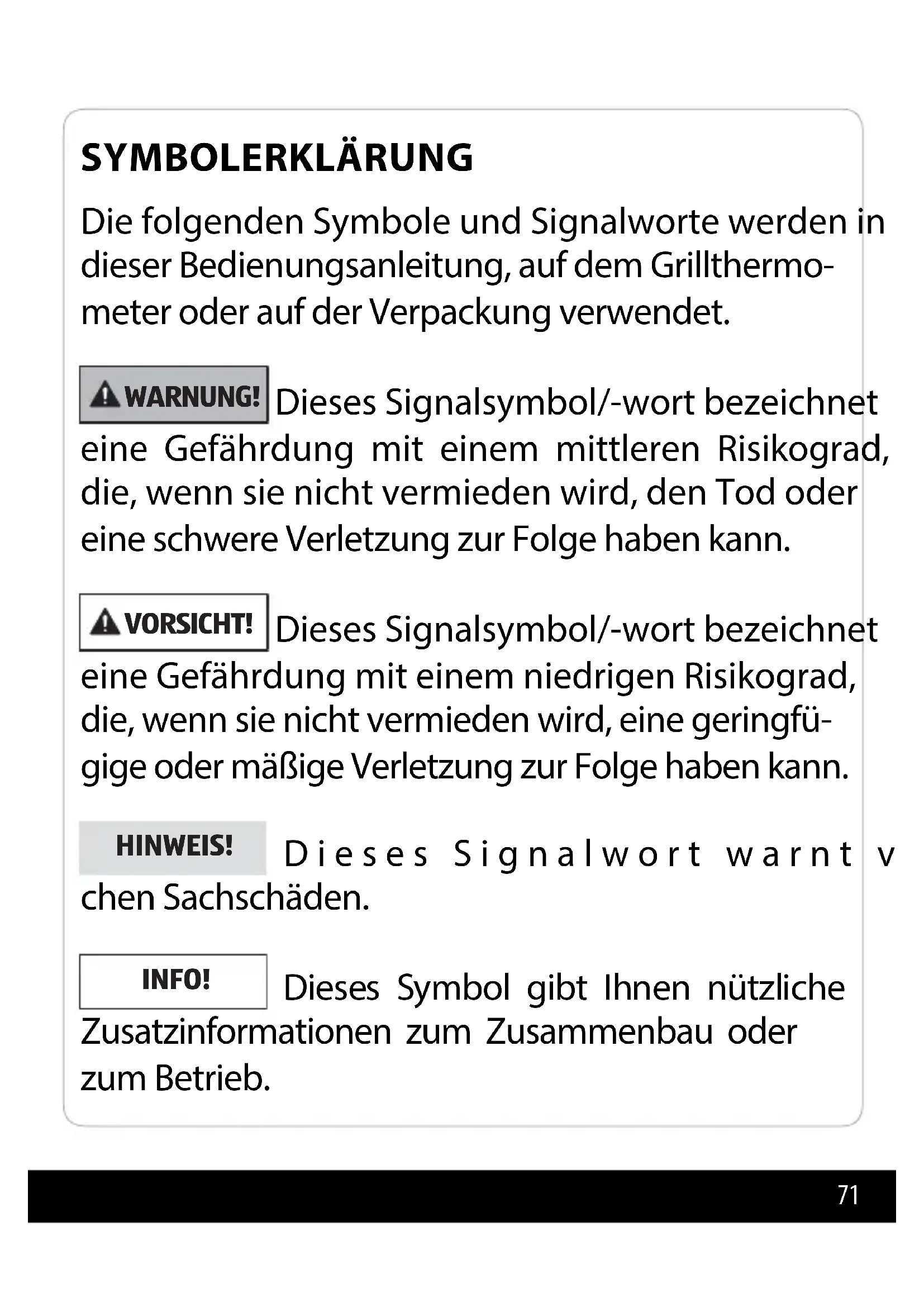 - 0 2 Entsorgung 0 271 SYMBOLERKLÄRUNG Die folgenden Symbole und Signalworte werden in dieser Bedienungsanleitung, auf dem Grillthermo- meter oder auf der Verpackung verwendet. WARNUNG! Dieses Signalsymbol/-wort bezeichnet eine Gefährdung mit einem mittleren Risikograd, die, wenn sie nicht vermieden wird, den Tod oder eine schwere Verletzung zur Folge haben kann. VORSICHT! Dieses Signalsymbol/-wort bezeichnet eine Gefährdung mit einem niedrigen Risikograd, die, wenn sie nicht vermieden wird, eine geringfü- gige oder mäßige Verletzung zur Folge haben kann. HINWEIS! Dieses Signalwort warnt vor mögli- chen Sachschäden. INFO! Dieses Symbol gibt Ihnen nützliche Zusatzinformationen zum Zusammenbau oder zum Betrieb.72 Besondere Vorsicht und Aufmerksamkeit! Bedienungsanleitung lesen und Warn- und Sicherheits hinweise befolgen! Geeignet für den Kontakt mit Lebensmitteln. Mit diesem Symbol gekennzeichnete Pro- dukte erfüllen alle anzuwendenden Ge- meinschaftsvorschriften des Europäischen Wirt- schaftsraums. WEEE-Kennzeichnung Artikel darf nicht über den Hausmüll entsorgt werden. Batterierücknahme Batterien dürfen nicht über den Hausmüll entsorgt werden.73 ALLGEMEINES Bedienungsanleitung lesen und aufbewahren. Diese Bedienungsanleitung gehört zu diesem Funk-Grillthermometer. Sie enthält wichtige Infor- mationen zur Inbetriebnahme und Handhabung. Um die Verständlichkeit zu erhöhen, wird das Funk- Grillthermometer in dieser Bedienungsanleitung kurz „Grillthermometer“ genannt. Lesen Sie die Bedienungsanleitung, insbesondere die Sicherheitshinweise, sorgfältig durch, bevor Sie das Grillthermometer einsetzen. Die Nichtbeach- tung dieser Bedienungsanleitung kann zu Schäden am Grillthermometer führen. Bewahren Sie die Bedienungsanleitung für die wei- tere Nutzung auf. Wenn Sie das Grillthermometer an Dritte weitergeben, geben Sie unbedingt diese Bedienungsanleitung mit.74 p. 1