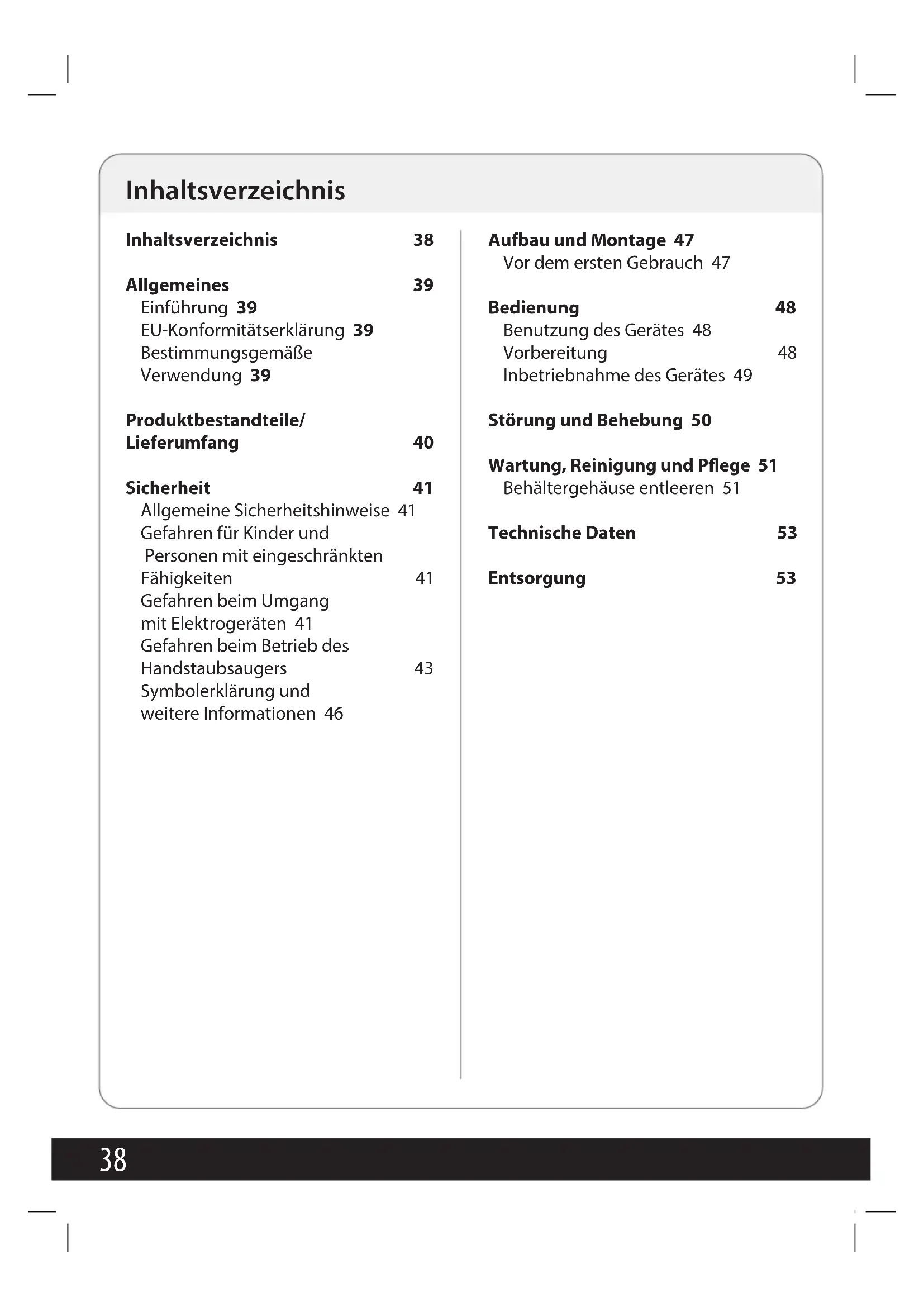 Inhaltsverzeichnis 38 Allgemeines 39 Einführung 39 EU-Konformitätserklärung 39 Bestimmungsgemäße Verwendung 39 Produktbestandteile/ Lieferumfang 40 Sicherheit 41 Allgemeine Sicherheitshinweise 41 Gefahren für Kinder und Personen mit eingeschränkten Fähigkeiten 41 Gefahren beim Umgang mit Elektrogeräten 41 Gefahren beim Betrieb des Handstaubsaugers 43 Symbolerklärung und weitere Informationen 46 Aufbau und Montage 47 Vor dem ersten Gebrauch 47 Bedienung 48 Benutzung des Gerätes 48 Vorbereitung 48 Inbetriebnahme des Gerätes 49 Störung und Behebung 50 Wartung, Reinigung und Pege 51 Behältergehäuse entleeren 51 Technische Daten 53 Entsorgung 53 Inhaltsverzeichnis39