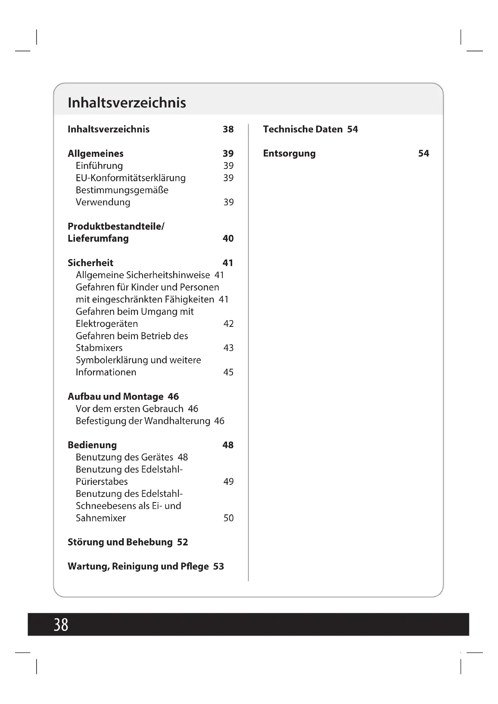 Inhaltsverzeichnis 38 Allgemeines 39 Einführung 39 EU-Konformitätserklärung 39 Bestimmungsgemäße Verwendung 39 Produktbestandteile/ Lieferumfang 40 Sicherheit 41 Allgemeine Sicherheitshinweise 41 Gefahren für Kinder und Personen mit eingeschränkten Fähigkeiten 41 Gefahren beim Umgang mit Elektrogeräten 42 Gefahren beim Betrieb des Stabmixers 43 Symbolerklärung und weitere Informationen 45 Aufbau und Montage 46 Vor dem ersten Gebrauch 46 Befestigung der Wandhalterung 46 Bedienung 48 Benutzung des Gerätes 48 Benutzung des Edelstahl- Pürierstabes 49 Benutzung des Edelstahl- Schneebesens als Ei- und Sahnemixer 50 Störung und Behebung 52 Wartung, Reinigung und Pege 53 Technische Daten 54 Entsorgung 54 Inhaltsverzeichnis39