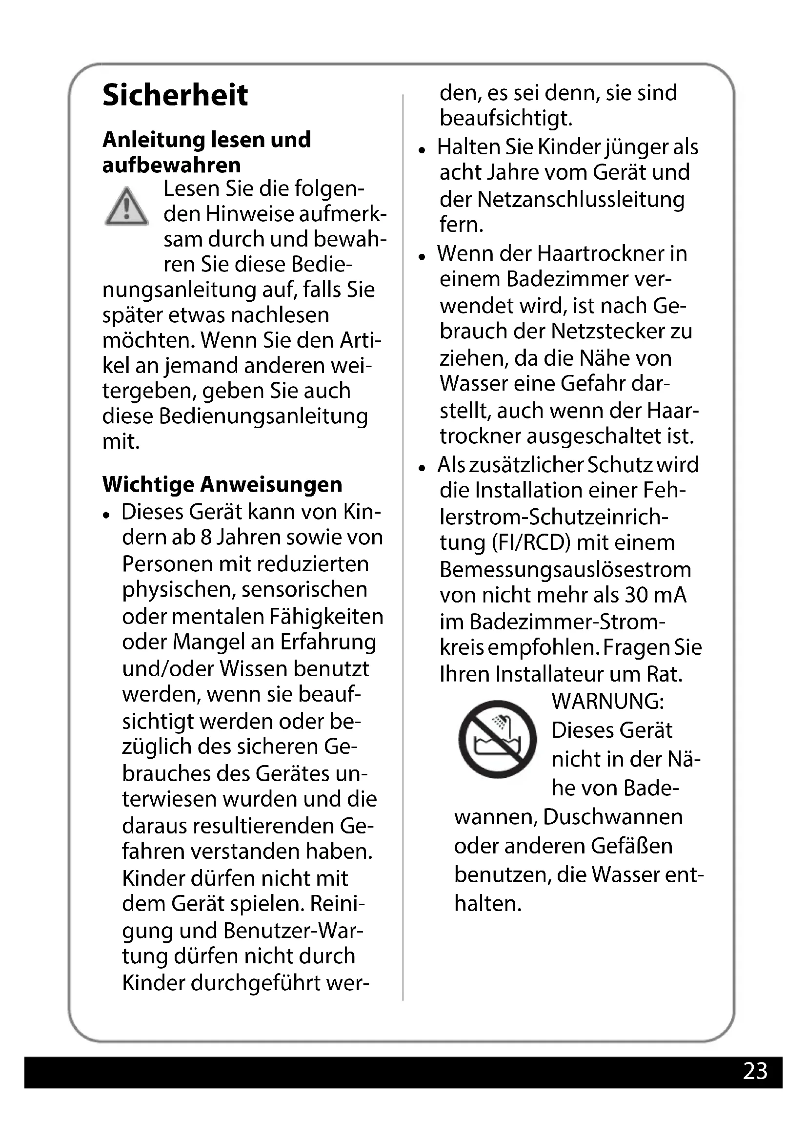 - Entsorgen Ionen Haartrockner BEL Druckbuch.book Seite 22 Mittwoch, 8. August 2018 10:21 1023 Sicherheit Anleitung lesen und aufbewahren Lesen Sie die folgen- den Hinweise aufmerk- sam durch und bewah- ren Sie diese Bedie- nungsanleitung auf, falls Sie später etwas nachlesen möchten. Wenn Sie den Arti- kel an jemand anderen wei- tergeben, geben Sie auch diese Bedienungsanleitung mit. Wichtige Anweisungen z Dieses Gerät kann von Kin- dern ab 8 Jahren sowie von Personen mit reduzierten physischen, sensorischen oder mentalen Fähigkeiten oder Mangel an Erfahrung und/oder Wissen benutzt werden, wenn sie beauf- sichtigt werden oder be- züglich des sicheren Ge- brauches des Gerätes un- terwiesen wurden und die daraus resultierenden Ge- fahren verstanden haben. Kinder dürfen nicht mit dem Gerät spielen. Reini- gung und Benutzer-War- tung dürfen nicht durch Kinder durchgeführt wer- den, es sei denn, sie sind beaufsichtigt. z Halten Sie Kinder jünger als acht Jahre vom Gerät und der Netzanschlussleitung fern. z Wenn der Haartrockner in einem Badezimmer ver- wendet wird, ist nach Ge- brauch der Netzstecker zu ziehen, da die Nähe von Wasser eine Gefahr dar- stellt, auch wenn der Haar- trockner ausgeschaltet ist. z Als zusätzlicher Schutz wird die Installation einer Feh- lerstrom-Schutzeinrich- tung (FI/RCD) mit einem Bemessungsauslösestrom von nicht mehr als 30 mA im Badezimmer-Strom- kreis empfohlen. Fragen Sie Ihren Installateur um Rat. WARNUNG: Dieses Gerät nicht in der Nä- he von Bade- wannen, Duschwannen oder anderen Gefäßen benutzen, die Wasser ent- halten. Ionen Haartrockner BEL Druckbuch.book Seite 23 Mittwoch, 8. August 2018 10:21 1024 z Wenn die Netzanschlusslei- tung dieses Gerätes be- schädigt wird, muss sie durch den Hersteller oder seinen Kundendienst oder eine ähnlich qualifizierte Person ersetzt werden, um Gefährdungen zu vermei- den. Bestimmungsgemäßer Gebrauch z Dieser Haartrockner dient zum Trocknen und Frisieren von menschlichem Naturhaar. Kunst- haar darf mit dem Haartrockner nicht behandelt werden. z Der Haartrockner ist für den Privat- gebrauch konzipiert. Für die gewerbliche Nutzung, z. B. in Fri- siersalons oder Schönheitsstudios, ist er nicht geeignet. Gefahr für Kinder und erweiterten Personenkreis z Halten Sie Kinder von Verpackungs- material fern. Bei Verschlucken besteht Erstickungsgefahr. Achten Sie auch darauf, dass der Verpa- ckungsbeutel nicht über den Kopf gestülpt wird. Gefahr durch Elektrizität z Der Haartrockner darf nicht in Was- ser oder andere Flüssigkeiten getaucht werden oder damit in Berührung kommen. Stromschlag- gefahr! Benutzen Sie das Gerät daher auch nicht in der Nähe von Feuchtquellen oder im Freien. z Bedienen Sie den Haartrockner nicht mit nassen Händen. z Schließen Sie das Gerät an eine ord- nungsgemäß installierte Steckdose an, deren Spannung den „Techni- schen Daten“ entspricht. z Achten Sie darauf, dass die Steckdo- se gut zugänglich ist, damit Sie im Bedarfsfall den Haartrockner schnell aus der Steckdose ziehen können. z Benutzen Sie das Gerät nicht: – wenn Gerät, Netzkabel oder Netzstecker beschädigt sind, – das Gerät heruntergefallen ist. z Achten Sie darauf, dass das Netzka- bel nicht durch scharfe Kanten oder heiße Gegenstände beschädigt wird. z Ziehen Sie den Netzstecker aus der Steckdose: – wenn Sie den Haartrockner nicht benutzen, – nach jedem Gebrauch, – bevor Sie das Gerät reinigen oder wegpacken, – wenn während des Betriebs offensichtlich eine Störung auf- tritt, – bei Gewitter. Ziehen Sie dabei immer am Netz- stecker, nicht am Netzkabel. z Nehmen Sie keine Veränderungen am Artikel vor. Lassen Sie Reparatu- ren nur von einer Fachwerkstatt durchführen. Beachten Sie auch die Garantiebedingungen. Ionen Haartrockner BEL Druckbuch.book Seite 24 Mittwoch, 8. August 2018 10:21 1025 Gefahr von Brand/ Verbrennung und/oder Explosion z Schalten Sie den Haartrockner immer aus, wenn Sie ihn aus der Hand legen. Legen Sie ihn dann nur auf eine feste und hitzebeständige Fläche. z Auch nach dem Gebrauch ist der Haartrockner noch längere Zeit heiß. Lassen Sie den Haartrockner ausreichend abkühlen, bevor Sie ihn reinigen oder verstauen. z Sprühen Sie kein Haarspray bei ein- geschaltetem Gerät. Es besteht Brand- und Explosionsgefahr! z Betreiben Sie den Haartrockner nicht unbeaufsichtigt. Lassen Sie ihn auch beim Abkühlen nicht unbeaufsichtigt. Gefahr von sonstigen Verletzungen z Stecken Sie niemals Finger oder Gegenstände in die Gitteröffnun- gen. z Achten Sie darauf, dass das Netzka- bel nicht zur Stolperfalle wird. z Halten und führen Sie das Kabel mit der freien Hand gleichmäßig zurück, wenn Sie die Taste für die Kabelaufwicklung drücken. Ansonsten kann es durch das Her- umschleudern des Netzkabels beim Aufwickeln zu Verletzungen und/ oder Sachschäden kommen. Hinweis - Sachschäden z Decken Sie das Lufteintrittsgitter während des Betriebes nicht ab, und reinigen Sie es von Zeit zu Zeit. Ansonsten kann es passieren, dass der eingebaute Überhitzungs- schutz den Haartrockner ausschal- tet. Weitere Informationen hierzu finden Sie im Kapitel „Überhit- zungsschutz“. z Verwenden Sie den Haartrockner nicht für Perücken oder Haarteile aus synthetischem Material. z Richten Sie den heißen Luftstrahl nicht auf Tiere, Pflanzen oder Gegenstände. Mit diesem Symbol gekennzeichnete Pro- dukte erfüllen alle anzu- wendenden Gemein- schaftsvorschriften des Europäischen Wirtschafts- raums. Ionen Haartrockner BEL Druckbuch.book Seite 25 Mittwoch, 8. August 2018 10:21 1026 Teile und Bedienelemente Lieferumfang z Haartrockner z Stylingdüse und Diffusor z Bedienungsanleitung und Garantiekarte 1 Taste für Kabelaufwicklung 2 Lufteintrittsgitter 3 Klappbarer Griff 4 Aufhängeöse 5 Netzstecker mit Netzkabel 6 3-Stufenschalter 7 Kühlstufen-Taste („Cool-Shot“) 8 Stylingdüse 9 Diffusor p. 31