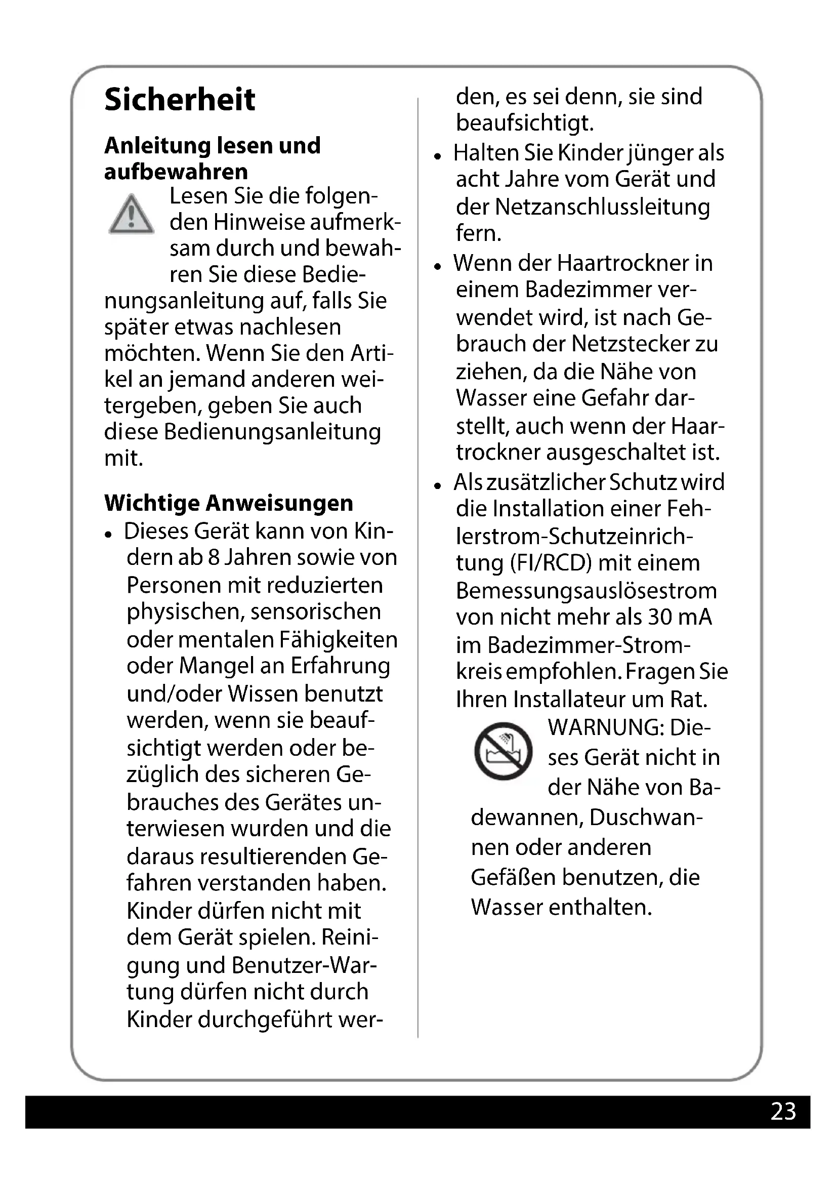 inder dürfen nicht mit dem Gerät spielen. Reini- gung und Benutzer-War- tung dürfen nicht durch Kinder durchgeführt wer- den, es sei denn, sie sind beaufsichtigt. Halten Sie Kinder jünger als acht Jahre vom Gerät und der Netzanschlussleitung fern. Wenn der Haartrockner in einem Badezimmer ver- wendet wird, ist nach Ge- brauch der Netzstecker zu zieh en, da die Nähe von Wasser eine Gefahr dar- stellt, auch wenn der Haar- trockner ausgeschaltet ist. Als zusätzlicher Schutz wird die Installation einer Feh- lerstrom-Schutzeinrich- tung (FI/RCD) mit einem Bemessungsauslösestrom von nicht mehr als 30 mA