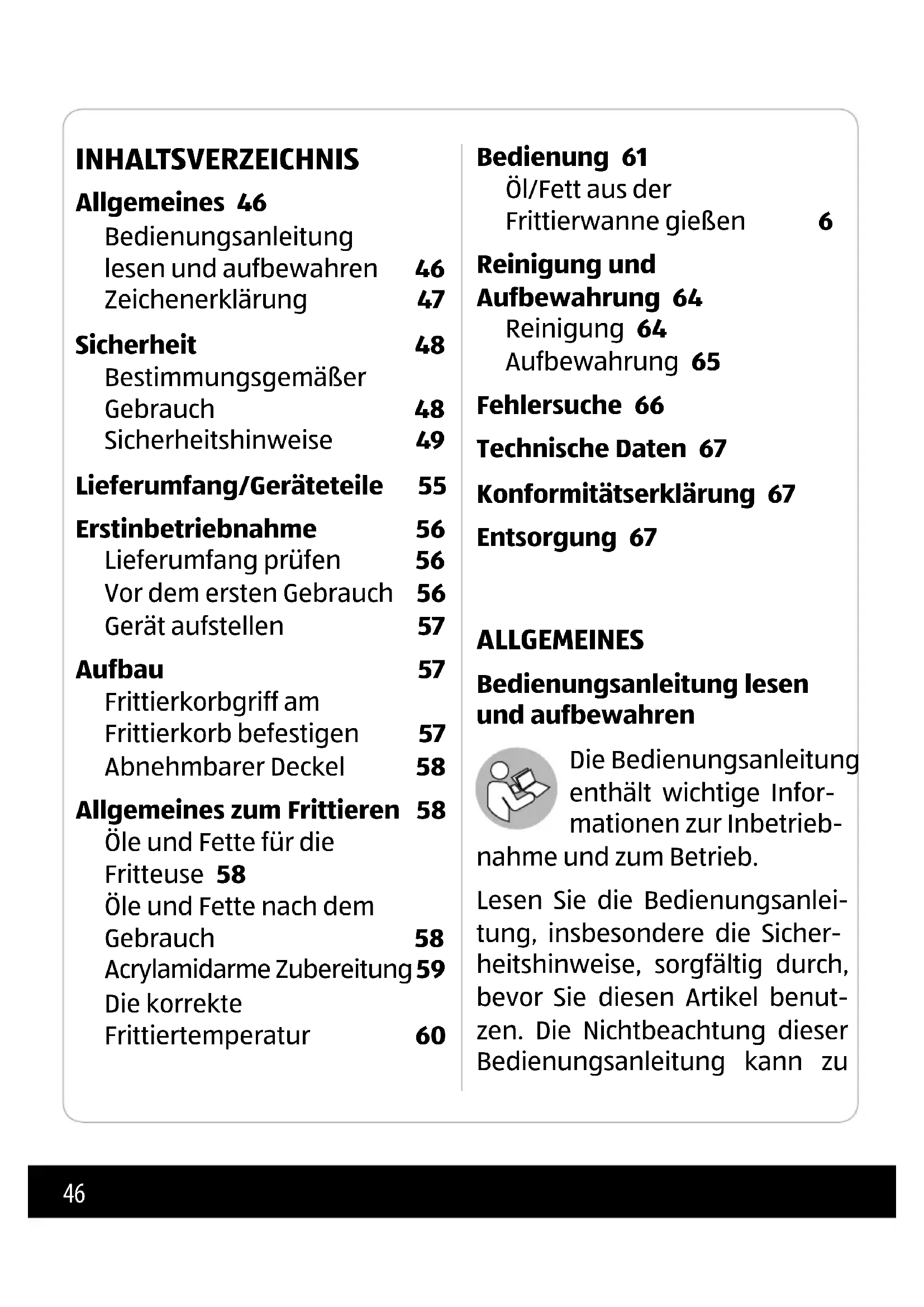 Éliminer l’emballage Mettez au rebut l’embal- lage selon les exigences de tri. Mettez le carton et les boîtes en carton au vieux pa- pier, les fi lms à la collecte des ma- tières de valeur. Éliminer l’appareil hors d’usage (Applicable dans l’Union euro- péenne et d’autres Etats euro- péens disposant de systèmes pour la collecte séparée des ma- tières de valeur) Les appareils hors d’usage ne doivent pas être jetés avec les ordures ména- gères ! Si un appareil ne peut plus être utilisé, tout utilisateur a l’obli- gation légale d’éliminer les ap- pareils hors d’usage différem- ment des ordures ménagères, par exemple à un point de col- lecte de sa commune/de son quartier. Ceci permet de garantir que les appareils hors d’usage sont traités professionnellement et d’éviter des effets négatifs sur l’environnement. C’est pourquoi les appareils électriques sont caractérisés par le symbole fi gu- rant ci-dessus.46 Bedienung 61 Öl/Fett aus der Frittierwanne gießen 63 Reinigung und Aufbewahrung 64 Reinigung 64 Aufbewahrung 65 Fehlersuche 66 Technische Daten 67 Konformitätserklärung 67 Entsorgung 67 ALLGEMEINES Bedienungsanleitung lesen und aufbewahren Die Bedienungsanleitung enthält wichtige Infor- mationen zur Inbetrieb- nahme und zum Betrieb. Lesen Sie die Bedienungsanlei- tung, insbesondere die Sicher- heitshinweise, sorgfältig durch, bevor Sie diesen Artikel benut- zen. Die Nichtbeachtung dieser Bedienungsanleitung kann zu INHALTSVERZEICHNIS Allgemeines 46 Bedienungsanleitung lesen und aufbewahren 46 Zeichenerklärung 47 Sicherheit 48 Bestimmungsgemäßer Gebrauch 48 Sicherheitshinweise 49 Lieferumfang/Geräteteile 55 Erstinbetriebnahme 56 Lieferumfang prüfen 56 Vor dem ersten Gebrauch 56 Gerät aufstellen 57 Aufbau 57 Frittierkorbgriff am Frittierkorb befestigen 57 Abnehmbarer Deckel 58 Allgemeines zum Frittieren 58 Öle und Fette für die Fritteuse 58 Öle und Fette nach dem Gebrauch 58 Acrylamidarme Zubereitung 59 Die korrekte Frittiertemperatur 6047 schweren Verletzungen oder Sachschäden führen. Die Bedienungsanleitung ba- siert auf den in der Europäischen Union gültigen Normen und Re- geln. Beachten Sie im Ausland auch landesspezifi sche Richtlini- en und Gesetze. Bewahren Sie die Bedienungs- anleitung für die weitere Nut- zung auf. Wenn Sie diesen Artikel an Dritte weitergeben, geben Sie unbedingt diese Bedienungsan- leitung mit. Sie können diese Bedienungsan- leitung auch als PDF-Datei auf der Homepage www.gt-support.de herunterladen. Zeichenerklärung Die folgenden Symbole und Sig- nalworte werden in dieser Bedie- nungsanleitung, auf dem Artikel oder auf der Verpackung verwen- det. WARNUNG! Dieses Signalsymbol/- wort bezeichnet eine Gefährdung mit einem mittleren Risikograd, die, wenn sie nicht vermieden wird, den Tod oder eine schwere Verletzung zur Folge haben kann. VORSICHT! Dieses Signalsymbol/- wort bezeichnet eine Gefährdung mit einem niedrigen Risikograd, die, wenn sie nicht vermieden wird, eine geringfügige oder mäßige Verletzung zur Folge haben kann. Heiße Oberfl äche! Dieses Symbol kennzeichnet hei- ße Oberfl ächen im Betrieb – nicht mit bloßen Händen berühren. HINWEIS! Dieses Signalsym- bol-/wort warnt vor möglichen Sachschäden.48 Dieses Symbol gibt Ihnen nützliche Zusatzinformatio- nen zum Aufbau oder zur Bedie- nung. Konformitätserklärung (siehe Kapitel „Konformi- tätserklärung“): Mit diesem Sym- bol gekennzeichnete Produkte erfüllen alle anzuwendenden Ge- meinschaftsvorschriften des Eu- ropäischen Wirtschaftsraums. Das Siegel „Geprüfte Si- cherheit“ (GS-Zeichen) bestätigt, dass dieser Artikel den Anforderungen des deutschen Produktsicherheitsge- setzes entspricht. SICHERHEIT Bestimmungsgemäßer Gebrauch Dieses Gerät ist ausschließlich für das Frittieren von Lebensmitteln in haushaltsüblichen Mengen geeignet und darf nur in Innen- räumen verwendet werden. Das Gerät ist ausschließlich für den Privatgebrauch bestimmt. Verwenden Sie das Gerät nur wie in dieser Bedienungsanleitung beschrieben. Jede andere Verwendung gilt als nicht bestimmungsgemäß und kann zu Sachschäden oder sogar zu Personenschäden führen. Verwenden Sie die Fritteuse kei- nesfalls zum Erhitzen von Was- ser oder anderen Flüssigkeiten. Der Hersteller oder Händler übernehmen keine Haftung für Schäden, die durch nicht bestim- mungsgemäße Verwendung, unsachgemäße Reparaturen, unerlaubt vorgenommenen Ver- änderungen oder Verwendung nicht zugelassener Zubehör- oder Ersatzteile. Die Fritteuse ist nicht für den ge- werblichen Bereich geeignet, wie z. B.: