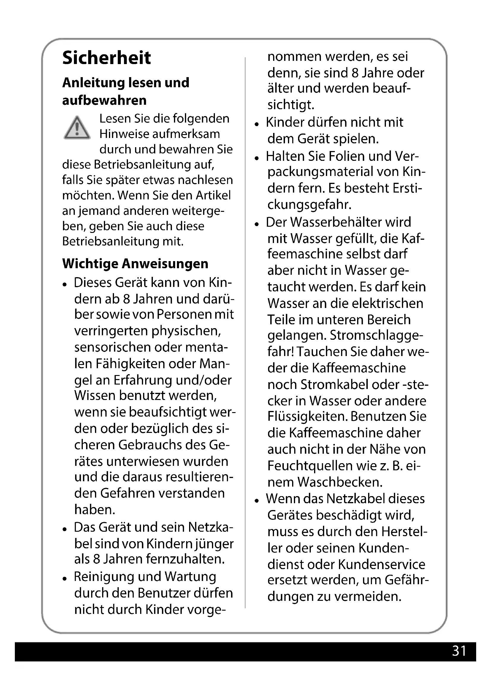 - Entsorgen Druckbuch Kaffeemaschine BEL.book Seite 30 Freitag, 6. April 2018 2:37 1431 Sicherheit Anleitung lesen und aufbewahren Lesen Sie die folgenden Hinweise aufmerksam durch und bewahren Sie diese Betriebsanleitung auf, falls Sie später etwas nachlesen möchten. Wenn Sie den Artikel an jemand anderen weiterge- ben, geben Sie auch diese Betriebsanleitung mit. Wichtige Anweisungen z Dieses Gerät kann von Kin- dern ab 8 Jahren und darü- ber sowie von Personen mit verringerten physischen, sensorischen oder menta- len Fähigkeiten oder Man- gel an Erfahrung und/oder Wissen benutzt werden, wenn sie beaufsichtigt wer- den oder bezüglich des si- cheren Gebrauchs des Ge- rätes unterwiesen wurden und die daraus resultieren- den Gefahren verstanden haben. z Das Gerät und sein Netzka- bel sind von Kindern jünger als 8 Jahren fernzuhalten. z Reinigung und Wartung durch den Benutzer dürfen nicht durch Kinder vorge- nommen werden, es sei denn, sie sind 8 Jahre oder älter und werden beauf- sichtigt. z Kinder dürfen nicht mit dem Gerät spielen. z Halten Sie Folien und Ver- packungsmaterial von Kin- dern fern. Es besteht Ersti- ckungsgefahr. z Der Wasserbehälter wird mit Wasser gefüllt, die Kaf- feemaschine selbst darf aber nicht in Wasser ge- taucht werden. Es darf kein Wasser an die elektrischen Teile im unteren Bereich gelangen. Stromschlagge- fahr! Tauchen Sie daher we- der die Kaffeemaschine noch Stromkabel oder -ste- cker in Wasser oder andere Flüssigkeiten. Benutzen Sie die Kaffeemaschine daher auch nicht in der Nähe von Feuchtquellen wie z. B. ei- nem Waschbecken. z Wenn das Netzkabel dieses Gerätes beschädigt wird, muss es durch den Herstel- ler oder seinen Kunden- dienst oder Kundenservice ersetzt werden, um Gefähr- dungen zu vermeiden. Druckbuch Kaffeemaschine BEL.book Seite 31 Freitag, 6. April 2018 2:37 1432 z Die Kaffeemaschine darf nicht an eine Zeitschaltuhr, einen Dämmerungsschal- ter oder an ein sonstiges Fernwirksystem ange- schlossen werden. Bestimmungsgemäßer Gebrauch z Diese Kaffeemaschine ist ausschließlich für die Zube- reitung von Kaffee konzi- piert. Dafür darf nur Kaffee- pulver („Kaffeemehl“) ver- wendet werden. z Die Kaffeemaschine benö- tigt Filtertüten der Größe 1x4. z Die Kaffeemaschine ist für die Verwendung im Privat- haushalt und die dort übli- cherweise anfallenden Mengen konzipiert. Für ei- ne gewerbliche oder haus- haltsähnliche Benutzung in Küchen für Mitarbeiter in Läden, Büros und anderen gewerblichen Bereichen, in landwirtschaftlichen An- wesen, durch Kunden in Hotels, Motels oder ande- ren Wohneinrichtungen oder in Frühstückspensio- nen ist die Kaffeemaschine ungeeignet. Gefahr durch Elektrizität z Bedienen Sie das Gerät nicht mit nassen Händen. z Betreiben Sie das Gerät nicht im Freien. z Schließen Sie das Gerät an eine ord- nungsgemäß installierte Steckdose an, deren Spannung den „Techni- schen Daten“ entspricht. z Achten Sie darauf, dass die Steckdo- se gut zugänglich ist, damit Sie im Bedarfsfall schnell den Netzstecker ziehen können. z Betreiben Sie die Kaffeemaschine nicht unbeaufsichtigt. z Benutzen Sie das Gerät nicht: – wenn das Gerät selbst oder Teile beschädigt sind, – wenn das Netzkabel oder der Stecker beschädigt sind, – wenn das Gerät heruntergefallen ist. z Wickeln Sie das Netzkabel vor je- dem Gebrauch vollständig ab. Ach- ten Sie dabei darauf, dass das Netz- kabel nicht durch scharfe Kanten oder heiße Gegenstände beschä- digt wird. z Ziehen Sie den Stecker aus der Steckdose: – wenn Sie die Kaffeemaschine nicht benutzen, – nach jedem Gebrauch, – bevor Sie das Gerät reinigen oder wegstellen, – wenn während des Betriebs of- fensichtlich eine Störung auftritt, – bei Gewitter. – Ziehen Sie dabei immer am Ste- cker, nicht am Kabel. Druckbuch Kaffeemaschine BEL.book Seite 32 Freitag, 6. April 2018 2:37 1433 z Nehmen Sie keine Veränderungen an dem Gerät oder am Netzkabel vor. Lassen Sie Reparaturen nur von einer Fachwerkstatt durchführen, da nicht fachgerecht reparierte Ge- räte den Benutzer gefährden. Beachten Sie auch die beiliegenden Garantiebedingungen. z Verwenden Sie kein Verlängerungs- kabel. Gefahr von Verbrennun- gen/Verbrühungen z Berühren Sie nicht den heißen Kaf- feefilter. Entnehmen Sie den Filter erst dann, wenn die Flüssigkeit voll- ständig abgelaufen und der Filter abgekühlt ist. z Frisch aufgebrühter Kaffee ist heiß. Seien Sie vorsichtig beim Einschen- ken bzw. Umfüllen. Gefahr von Verletzung z Die Glaskanne der Kaffeemaschine ist nicht für die Mikrowelle geeignet. Verletzungsgefahr durch Glassplitter! Hinweis - Sachschäden z Verwenden Sie die Kaffeemaschine ausschließlich mit Originalzubehör. Verwenden Sie z. B. ausschließlich die mitgelieferte Kanne, um mit die- ser Kaffeemaschine Kaffee zu brü- hen. z Füllen Sie ausschließlich kaltes Was- ser in den Wasserbehälter. Mineral- wasser oder andere kohlensäure- haltige Flüssigkeiten dürfen nicht verwendet werden. z Stellen Sie die Kaffeemaschine auf einen stabilen, ebenen Untergrund. Achten Sie dabei auf einen ausrei- chend großen Abstand zu starken Wärmequellen wie Herdplatten, Heizungsrohren u. ä. z An der Unterseite der Kaffeema- schine befinden sich Gummifüße. Da Oberflächen aus den verschie- densten Materialien bestehen und mit den unterschiedlichsten Pflege- mitteln behandelt werden, kann es nicht völlig ausgeschlossen wer- den, dass manche dieser Stoffe Be- standteile enthalten, die die Gum- mifüße angreifen und aufweichen. Legen Sie ggf. eine rutschfeste Un- terlage unter die Kaffeemaschine. z Halten Sie die Kaffeekanne fest, wenn Sie die Kaffeemaschine um- stellen oder wegpacken. Die Kaffee- kanne steht lediglich lose auf der Heizplatte. z Reinigen Sie die Kaffeemaschine nicht mit harten, kratzenden oder scheuernden Reinigungsmittel, Stahlwolle o. ä. Druckbuch Kaffeemaschine BEL.book Seite 33 Freitag, 6. April 2018 2:37 1434 Teile und Bedienelemente Prog