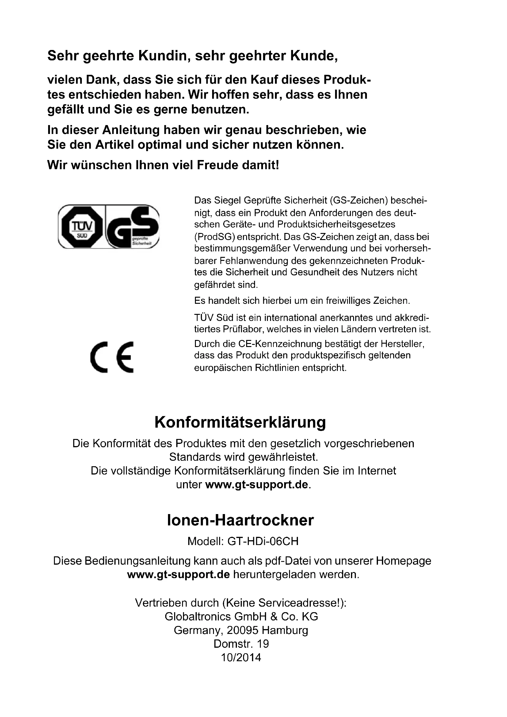 Druckbuch Ionenhaartrockner.book Seite 1 Donnerstag, 22. Mai 2014 3:18 15Vertrieben durch (Keine Serviceadresse!): Globaltronics GmbH & Co. KG Germany, 20095 Hamburg Domstr. 19 10/2014 Sehr geehrte Kundin, sehr geehrter Kunde, vielen Dank, dass Sie sich für den Kauf dieses Produk- tes entschieden haben. Wir hoffen sehr, dass es Ihnen gefällt und Sie es gerne benutzen. In dieser Anleitung haben wir genau beschrieben, wie Sie den Artikel optimal und sicher nutzen können. Wir wünschen Ihnen viel Freude damit! Konformitätserklärung Die Konformität des Produktes mit den gesetzlich vorgeschriebenen Standards wird gewährleistet. Die vollständige Konformitätserklärung finden Sie im Internet unter www.gt-support.de. Ionen-Haartrockner Modell: GT-HDi-06CH Diese Bedienungsanleitung kann auch als pdf-Datei von unserer Homepage www.gt-support.de heruntergeladen werden. Das Siegel Geprüfte Sicherheit (GS-Zeichen) beschei- nigt, dass ein Produkt den Anforderungen des deut- schen Geräte- und Produktsicherheitsgesetzes (ProdSG) entspricht. Das GS-Zeichen zeigt an, dass bei bestimmungsgemäßer Verwendung und bei vorherseh- barer Fehlanwendung des gekennzeichneten Produk- tes die Sicherheit und Gesundheit des Nutzers nicht gefährdet sind. Es handelt sich hierbei um ein freiwilliges Zeichen. TÜV Süd ist ein international anerkanntes und akkredi- tiertes Prüflabor, welches in vielen Ländern vertreten ist. Durch die CE-Kennzeichnung bestätigt der Hersteller, dass das Produkt den produktspezifisch geltenden europäischen Richtlinien entspricht. Druckbuch Ionenhaartrockner.book Seite 2 Donnerstag, 22. Mai 2014 3:18 15Ionen-Haartrockner Lieferumfang CHAT