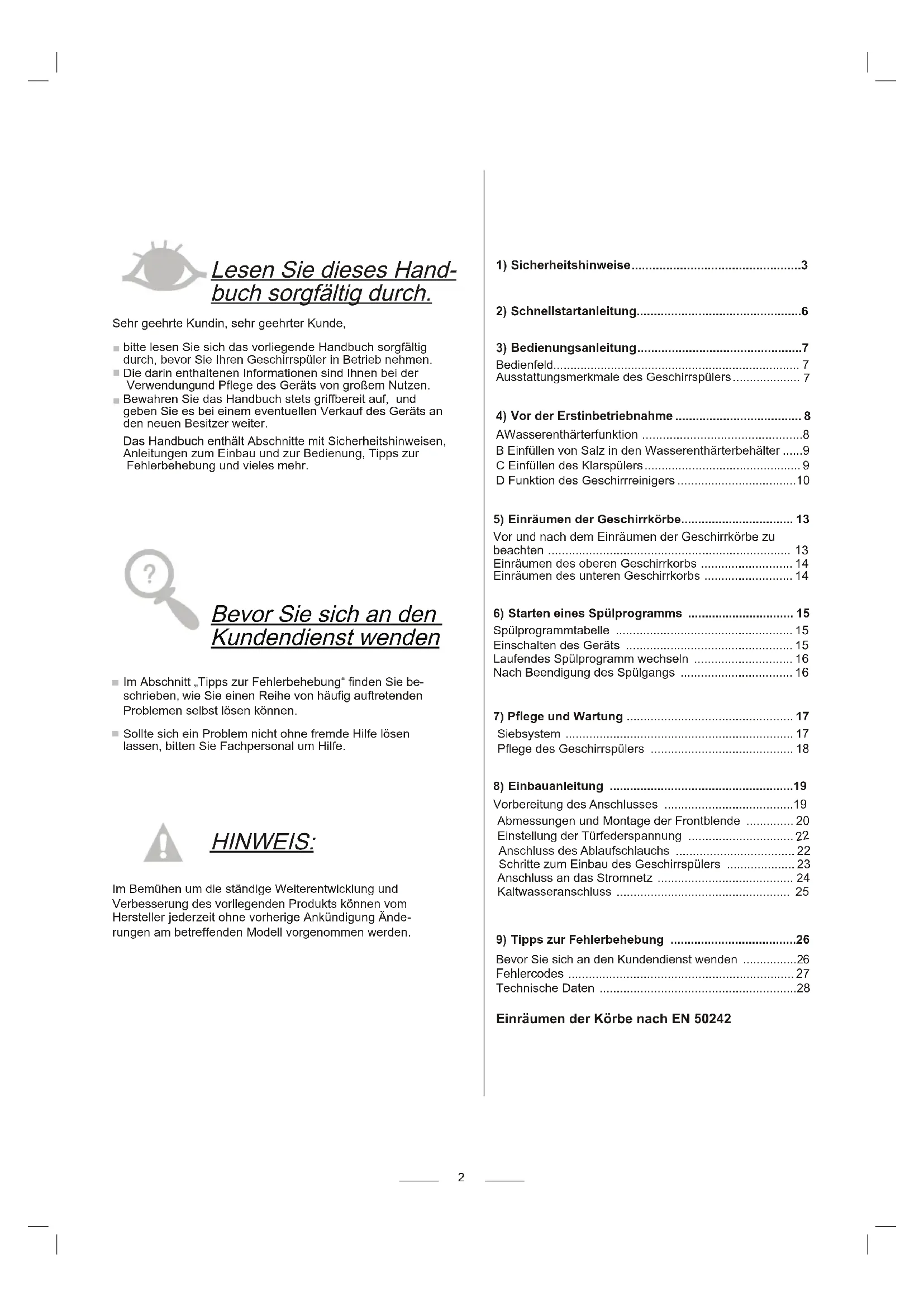 Tipps zur Fehlerbehebung 26 Bevor Sie sich an den Kundendienst wenden ................26 Fehlercodes .................................................................. 27 TechnischeDaten ..........................................................28 Einräumen der Körbe nach EN 502423