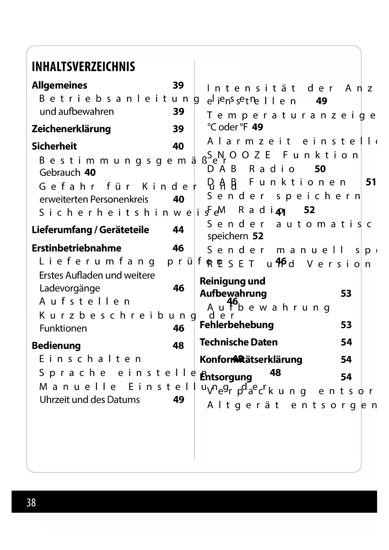 Éliminer l’emballage Triez l’emballage avant de l’éliminer. Jetez le papier et le carton dans les conteneurs pour vieux papiers et les lms plastique dans la benne de matériaux recyclables. Recyclez l’appareil usagé (Utilisable dans l’Union européenne et dans d’autres pays européens avec des systèmes de collecte séparée des produits recyclables) Il est interdit de jeter les appareils usagés dans les ordures ménagères ! Si l’appareil électrique ne peut plus être utilisé, chaque consommateur est légalement obligé d’éliminer les appa- reils usagés séparément des ordures ménagères, par exemple dans un point de collecte dans sa commune ou son quartier. Cela garantit le bon recyclage des appareils usagés et la réduction des e ets négatifs sur l’environnement. Pour éviter de nuire à la santé humaine et à l’environnement en cas d’élimination incontrôlée des déchets, recyclez le produit de manière responsable a n de promouvoir la réutilisation durable des ressources matérielles. C’est ce qu’explique la présence du symbole ci-dessus sur les appareils électriques. Renseignez-vous auprès de l’association responsable de l’élimination des déchets sur les mesures d’élimination néces- saires pour éviter les risques environnementaux.37 Il est interdit de jeter les piles et les batteries dans les ordures ménagères ! La loi oblige les consommateurs à déposer les piles et batte- ries dans un point de collecte dédié. Si les batteries ou accumulateurs contiennent du mercure (Hg), du cadmium (Cd) ou du plomb (Pb), vous retrouverez ces symboles chimiques sous le symbole de la poubelle bar- rée. Les piles et batteries doivent être déchargées avant d’être jetées. Vous pouvez emmener gratuitement les piles et les batteries dans un point de collecte de votre commune/votre quartier ou dans le commerce a n de garantir une élimination éco- logique et un recyclage des matières premières précieuses. En cas d’élimination inappropriée, des ingrédients toxiques peuvent être libérés dans l’environnement, ce qui a des e ets nocifs sur les humains, les animaux et les plantes. Il est recommandé de sortir les piles et les batteries contenues dans les appareils électriques et de les éliminer séparément, dans la mesure du possible. Pour garantir un tri des déchets, la batterie doit être retirée de l’appareil lors de son élimination. N’essayez PAS d’ouvrir ou de démonter le produit pour retirer la batterie vous-même. Con ez cette tâche à des professionnels.38 Intensität der Anzeige einstellen 49 Temperaturanzeige °C oder °F 49 Alarmzeit einstellen 49 SNOOZE Funktion 50 DAB Radio 50 DAB Funktionen 51 Sender speichern 51 FM Radio 52 Sender automatisch speichern 52 Sender manuell speichern 52 RESET und Version (SV VER) 52 Reinigung und Aufbewahrung 53 Aufbewahrung 53 Fehlerbehebung 53 Te ch ni sc he D ate n 5 4 Konformitätserklärung 54 Entsorgung 54 Verpackung entsorgen 54 Altgerät entsorgen 54 INHALTSVERZEICHNIS Allgemeines 39 Betriebsanleitung lesen und aufbewahren 39 Zeichenerklärung 39 Sicherheit 40 Bestimmungsgemäßer Gebrauch 40 Gefahr für Kinder und erweiterten Personenkreis 40 Sicherheitshinweise 41 Lieferumfang / Geräteteile 44 Erstinbetriebnahme 46 Lieferumfang prüfen 46 Erstes Au aden und weitere Ladevorgänge 46 Aufstellen 46 Kurzbeschreibung der Funktionen 46 Bedienung 48 Einschalten 48 Sprache einstellen 48 Manuelle Einstellung der Uhrzeit und des Datums 4939 ALLGEMEINES Betriebsanleitung lesen und aufbewahren Die Betriebsanleitung enthält wichtige Infor-mationen zur Inbetriebnahme und zum Be-trieb.Lesen Sie die Betriebsanleitung, insbesondere die Sicher-heitshinweise, sorgfältig durch, bevor Sie diesen Artikel be-nutzen. Die Nichtbeachtung dieser Betriebsanleitung kann zu schweren Verletzungen oder Sachschäden führen. Die Betriebsanleitung basiert auf den in der Europäischen Union gültigen Normen und Regeln. Beachten Sie im Ausland auch landesspezi sche Richtlinien und Gesetze.Bewahren Sie die Betriebsanleitung für die weitere Nutzung auf. Wenn Sie diesen Artikel an Dritte weitergeben, geben Sie unbedingt diese Betriebsanleitung mit.Sie können diese Betriebsanleitung auch als PDF-Datei auf der Homepage www.gt-support.de herunterladen. ZEICHENERKLÄRUNG Die folgenden Symbole und Signalworte werden in dieser Betriebsanleitung, auf dem Artikel oder auf der Verpackung verwendet. WARNUNG! Dieses Signalsymbol/-wort be-zeichnet eine Gefährdung mit einem mittleren Risikograd, die, wenn sie nicht vermieden wird, den Tod oder eine schwere Verletzung zur Folge haben kann. VORSICHT! Dieses Signalsymbol/-wort be-zeichnet eine Gefährdung mit einem niedrigen Risikograd, die, wenn sie nicht vermieden wird, eine geringfügige oder mäßige Verletzung zur Folge haben kann. HINWEIS! Dieses Signalsymbol-/wort warnt vor möglichen Sachschä- den. Dieses Symbol gibt Ihnen nützliche Zusatzinfor-mationen zum Aufbau oder zur Bedienung.Konformitätserklärung (siehe Kapitel „Konformi-tätserklärung“): Mit diesem Symbol gekenn-zeichnete Produkte erfüllen alle anzuwendenden Gemein-schaftsvorschriften des Europäischen Wirtschaftsraums. Produkte, die mit diesem Zeichen versehen sind, werden mit Gleichstrom betrieben.40 Gefahr für Kinder und erweiterten Personenkreis