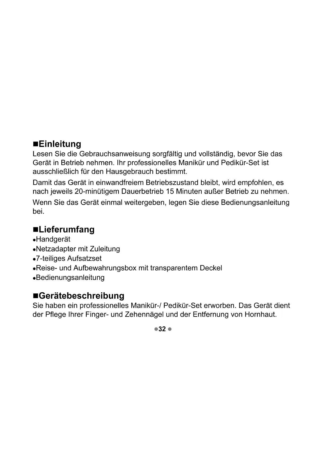 Lesen Sie die Gebrauchsanweisung sorgfältig und vollständig, bevor Sie das Gerät in Betriebnehmen. Ihr professionelles Manikür und Pedikür-Set ist ausschließlich für den Hausgebrauch bestimmt.