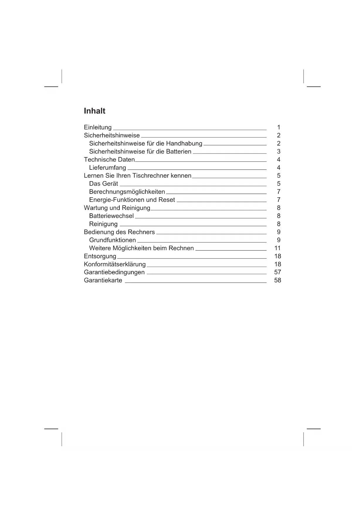 D2-1 12/2010 FRONTInhalt Einleitung Sicherheitshinweise Sicherheitshinweise für die Handhabung Sicherheitshinweise für die Batterien Technische Daten Lieferumfang Lernen Sie Ihren Tischrechner kennen Das Gerät Berechnungsmöglichkeiten Energie-Funktionen und Reset Wartung und Reinigung Batteriewechsel Reinigung Bedienung des Rechners Grundfunktionen Weitere Möglichkeiten beim Rechnen Entsorgung Konformitätserklärung Garantiebedingungen Garantiekarte