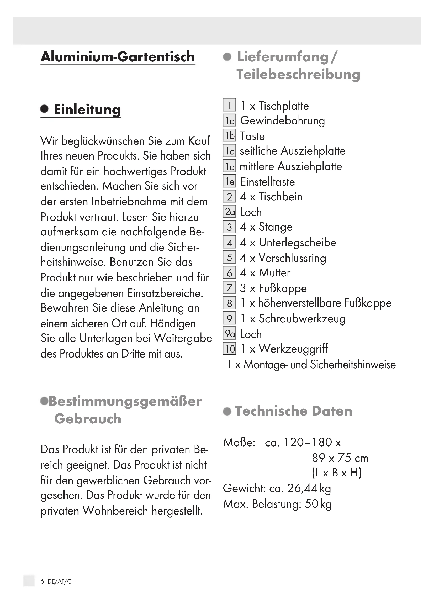 BRUG: SKAL LÆSES OMHYGGELIGT! 352156_352161_352176_2007_flo_Aluminium_Gartentisch_cover_OS.indd 5-8352156_352161_352176_2007_flo_Aluminium_Gartentisch_cover_OS.indd 5-8 12.08.20 16:2312.08.20 16:235 DE/AT/CH Einleitung .....................................................................................Seite 6 Bestimmungsgemäßer Gebrauch .................................................Seite 6 Lieferumfang / Teilebeschreibung .................................................Seite 6 Technische Daten ..........................................................................Seite 6 Sicherheitshinweise ...............................................................Seite 7 Montage ......................................................................................Seite 8 Tischplatte ausziehen .................................................................... Seite 9 Reinigung und Pflege ........................................................... Seite 9 Lagerung .....................................................................................Seite 9 Entsorgung .................................................................................Seite 10 Garantie .......................................................................................Seite 10 Abwicklung im Garantiefall ..........................................................Seite 10 Service............................................................................................Seite 11 352156_352161_352176_2007_flo_Aluminium_Gartentisch_content_OS.indd 5352156_352161_352176_2007_flo_Aluminium_Gartentisch_content_OS.indd 5 12.08.20 16:2212.08.20 16:226 DE/AT/CH Aluminium-Gartentisch Einleitung Wir beglückwünschen Sie zum Kauf Ihres neuen Produkts. Sie haben sich damit für ein hochwertiges Produkt entschieden. Machen Sie sich vor der ersten Inbetriebnahme mit dem Produkt vertraut. Lesen Sie hierzu aufmerksam die nachfolgende Be- dienungsanleitung und die Sicher- heitshinweise. Benutzen Sie das Produkt nur wie beschrieben und für die angegebenen Einsatzbereiche. Bewahren Sie diese Anleitung an einem sicheren Ort auf. Händigen Sie alle Unterlagen bei Weitergabe des Produktes an Dritte mit aus. Bestimmungsgemäßer Gebrauch Das Produkt ist für den privaten Be- reich geeignet. Das Produkt ist nicht für den gewerblichen Gebrauch vor- gesehen. Das Produkt wurde für den privaten Wohnbereich hergestellt. Lieferumfang / Teilebeschreibung