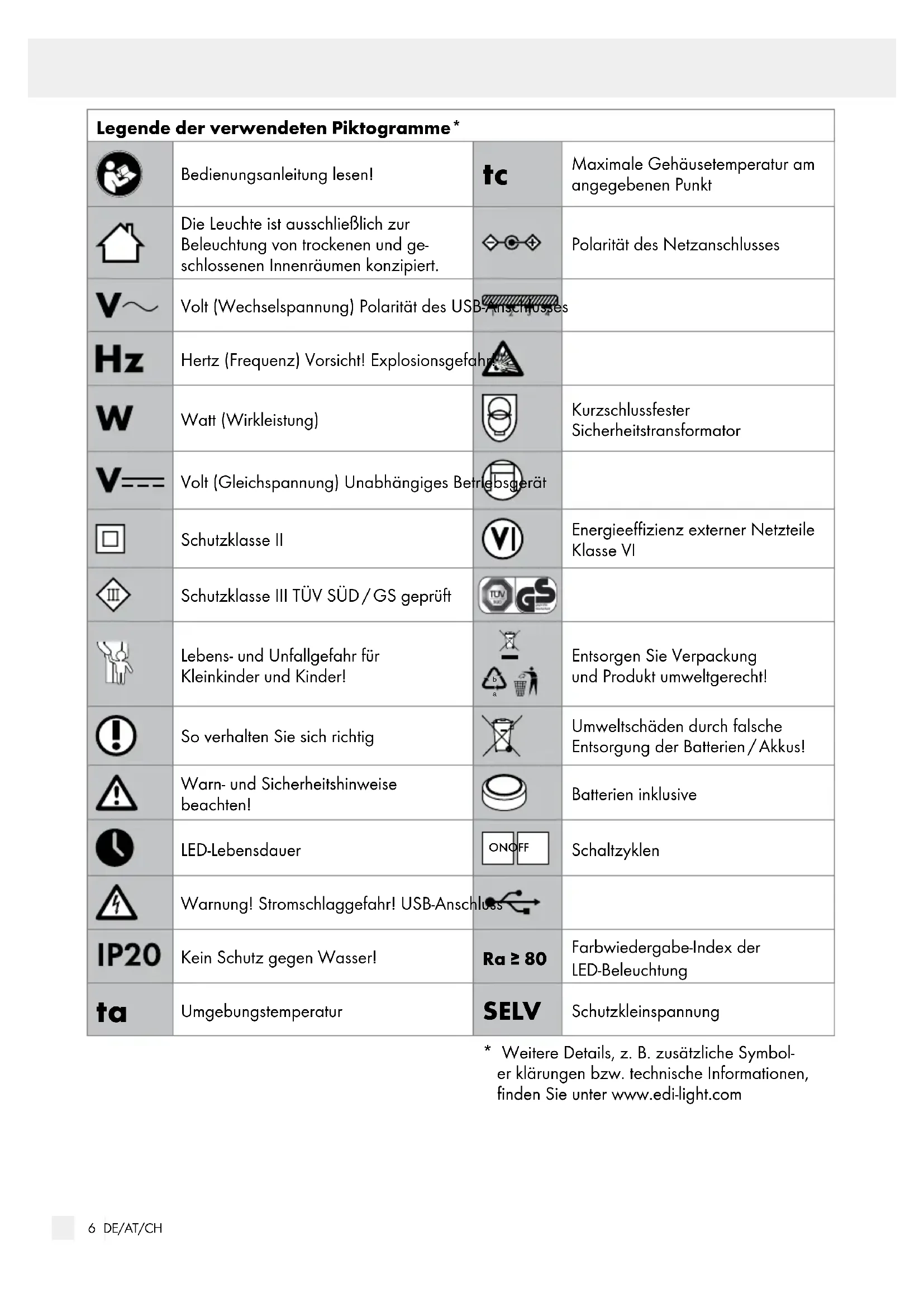 Maximale Gehäusetemperatur am angegebenen Punkt Die Leuchte ist ausschließlich zur Beleuchtung von trockenen und ge- schlossenen Innenräumen konzipiert. Polarität des Netzanschlusses Volt (Wechselspannung) Polarität des USB-Anschlusses Hertz (Frequenz) Vorsicht! Explosionsgefahr! Watt (Wirkleistung) Kurzschlussfester Sicherheitstransformator Volt (Gleichspannung) Unabhängiges Betriebsgerät Schutzklasse II Energieeffizienz externer Netzteile Klasse VI Schutzklasse III TÜV SÜD / GS geprüft Lebens- und Unfallgefahr für Kleinkinder und Kinder!