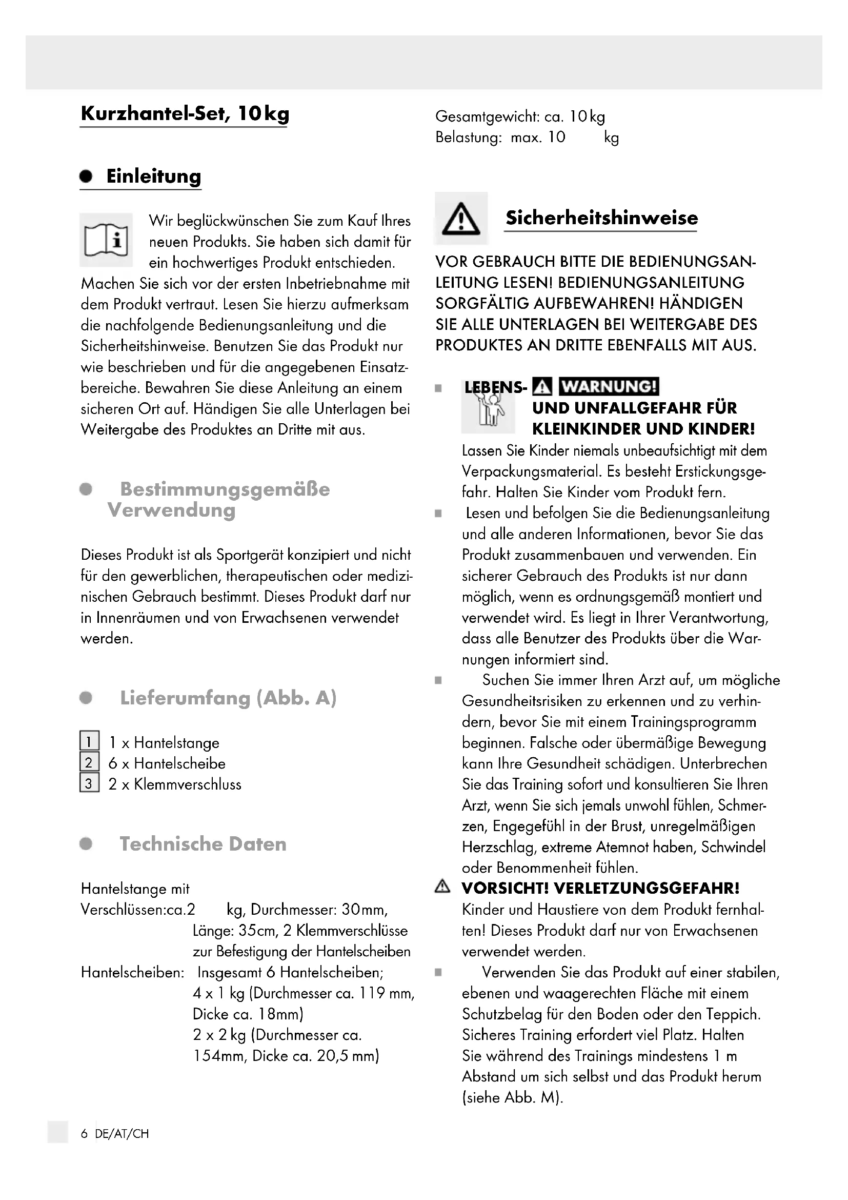 Einleitung ......................................................................................................................................... Seite 6 Bestimmungsgemäße Verwendung ....................................................................................................Seite 6 Lieferumfang ........................................................................................................................................ Seite 6 Technische Daten ................................................................................................................................Seite 6 Sicherheitshinweise ................................................................................................................Seite 6 Montage ...........................................................................................................................................Seite 7 Trainingshinweise .................................................................................................................... Seite 7 Allgemeine Trainingshinweise ............................................................................................................Seite 7 Übungshinweise ..................................................................................................................................Seite 8 Übungen .............................................................................................................................................. Seite 8 Reinigung und Pflege ............................................................................................................Seite 9 Entsorgung .....................................................................................................................................Seite 9 Garantie ........................................................................................................................................... Seite 9 Abwicklung im Garantiefall ................................................................................................................Seite 10 Service .................................................................................................................................................Seite 106 DE/AT/CH Kurzhantel-Set, 10 kg Einleitung Wir beglückwünschen Sie zum Kauf Ihres neuen Produkts. Sie haben sich damit für ein hochwertiges Produkt entschieden. Machen Sie sich vor der ersten Inbetriebnahme mit dem Produkt vertraut. Lesen Sie hierzu aufmerksam die nachfolgende Bedienungsanleitung und die Sicherheitshinweise. Benutzen Sie das Produkt nur wie beschrieben und für die angegebenen Einsatz- bereiche. Bewahren Sie diese Anleitung an einem sicheren Ort auf. Händigen Sie alle Unterlagen bei Weitergabe des Produktes an Dritte mit aus. Bestimmungsgemäße Verwendung Dieses Produkt ist als Sportgerät konzipiert und nicht für den gewerblichen, therapeutischen oder medizi- nischen Gebrauch bestimmt. Dieses Produkt darf nur in Innenräumen und von Erwachsenen verwendet werden. Lieferumfang (Abb. A)