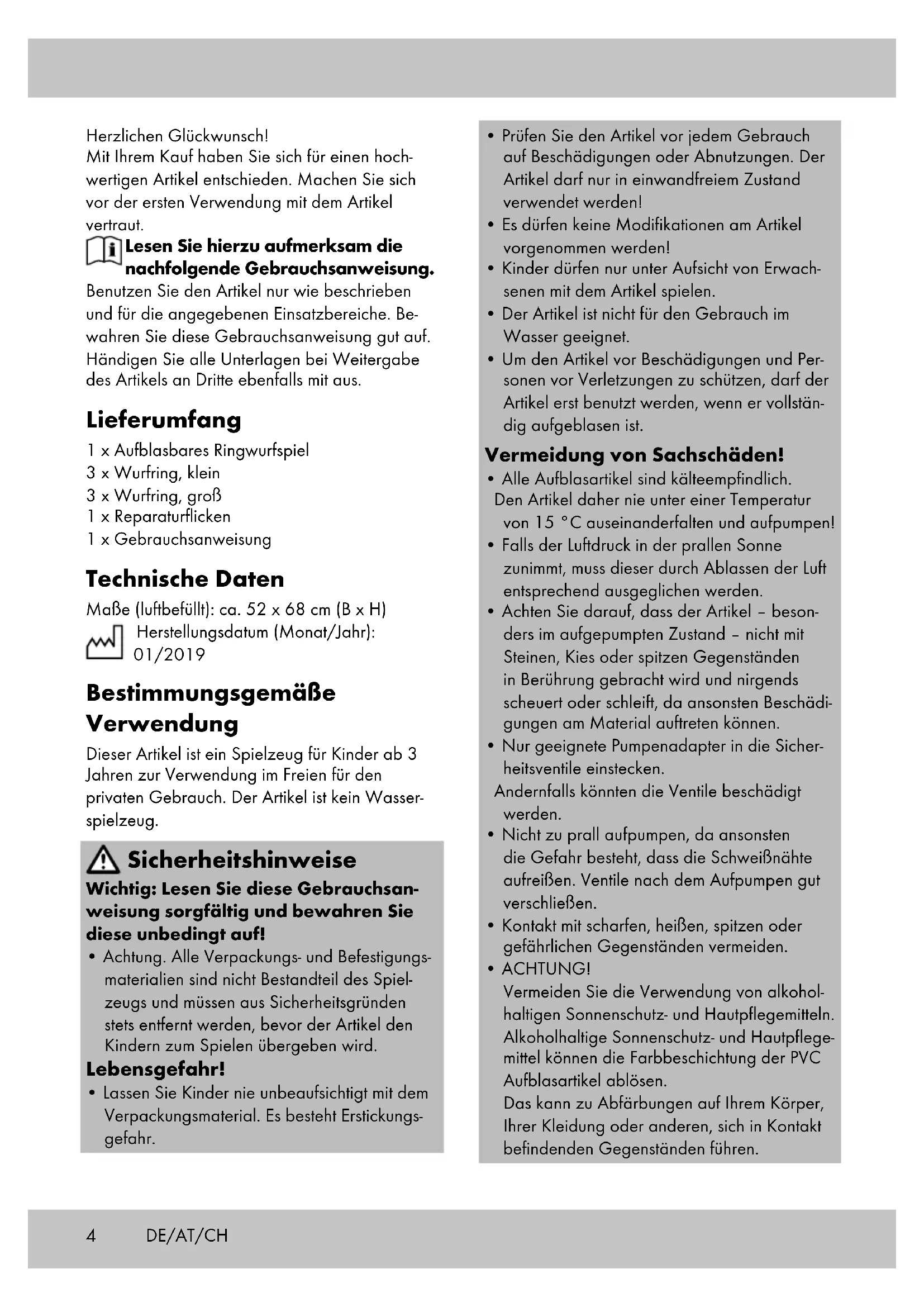 1b34 Herzlichen Glückwunsch! Mit Ihrem Kauf haben Sie sich für einen hoch- wertigen Artikel entschieden. Machen Sie sich vor der ersten Verwendung mit dem Artikel vertraut. Lesen Sie hierzu aufmerksam die nachfolgende Gebrauchsanweisung. Benutzen Sie den Artikel nur wie beschrieben und für die angegebenen Einsatzbereiche. Be- wahren Sie diese Gebrauchsanweisung gut auf. Händigen Sie alle Unterlagen bei Weitergabe des Artikels an Dritte ebenfalls mit aus. Lieferumfang 1 x Aufblasbares Ringwurfspiel 3 x Wurfring, klein 3 x Wurfring, groß 1 x Reparaturflicken 1 x Gebrauchsanweisung Technische Daten Maße (luftbefüllt): ca. 52 x 68 cm (B x H) Herstellungsdatum (Monat/Jahr): 01/2019 Bestimmungsgemäße Verwendung Dieser Artikel ist ein Spielzeug für Kinder ab 3 Jahren zur Verwendung im Freien für den privaten Gebrauch. Der Artikel ist kein Wasser- spielzeug. Sicherheitshinweise Wichtig: Lesen Sie diese Gebrauchsan- weisung sorgfältig und bewahren Sie diese unbedingt auf!