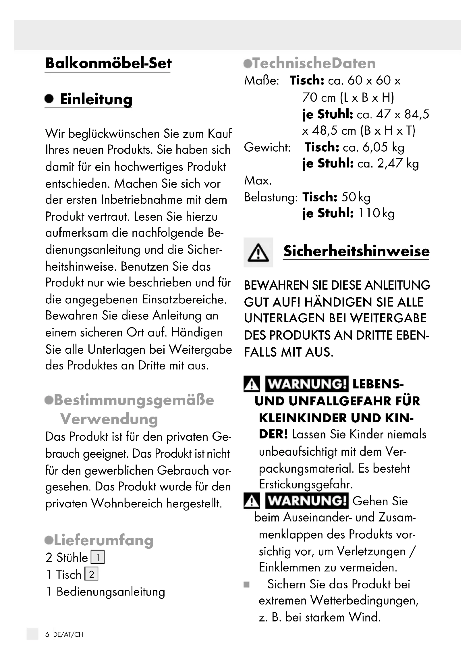 BRUG: SKAL LÆSES OMHYGGELIGT!5 DE/AT/CH Einleitung .....................................................................................Seite 6 Bestimmungsgemäße Verwendung ................................................Seite 6 Lieferumfang ....................................................................................Seite 6 Technische Daten ............................................................................Seite 6 Sicherheitshinweise .............................................................Seite 6 Montage .......................................................................................Seite 8 Reinigung und Pflege ..........................................................Seite 8 Entsorgung ..................................................................................Seite 8 Garantie .......................................................................................Seite 8 Abwicklung im Garantiefall ............................................................Seite 9 Service..............................................................................................Seite 96 DE/AT/CH Balkonmöbel-Set Einleitung Wir beglückwünschen Sie zum Kauf Ihres neuen Produkts. Sie haben sich damit für ein hochwertiges Produkt entschieden. Machen Sie sich vor der ersten Inbetriebnahme mit dem Produkt vertraut. Lesen Sie hierzu aufmerksam die nachfolgende Be- dienungsanleitung und die Sicher- heitshinweise. Benutzen Sie das Produkt nur wie beschrieben und für die angegebenen Einsatzbereiche. Bewahren Sie diese Anleitung an einem sicheren Ort auf. Händigen Sie alle Unterlagen bei Weitergabe des Produktes an Dritte mit aus. Bestimmungsgemäße Verwendung Das Produkt ist für den privaten Ge- brauch geeignet. Das Produkt ist nicht für den gewerblichen Gebrauch vor- gesehen. Das Produkt wurde für den privaten Wohnbereich hergestellt. Lieferumfang 2 Stühle